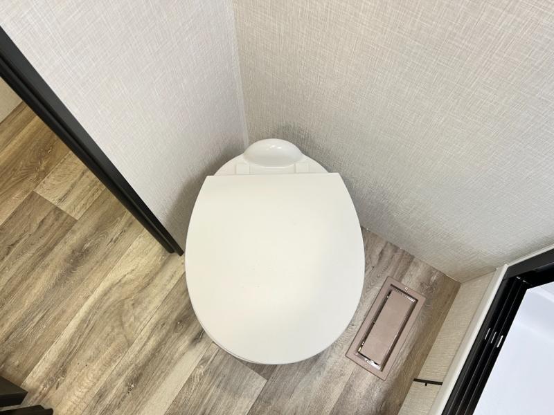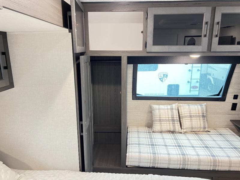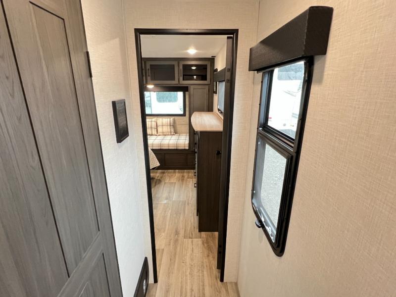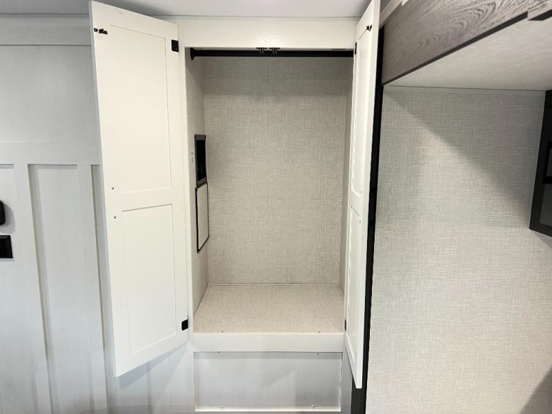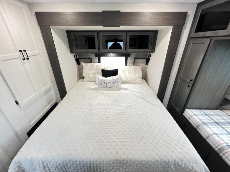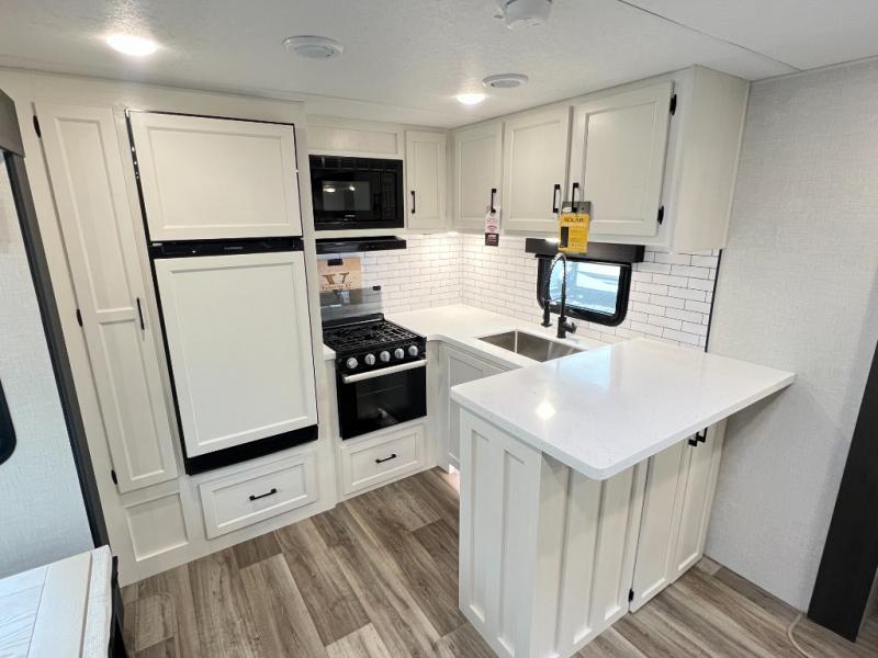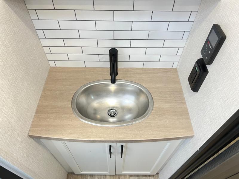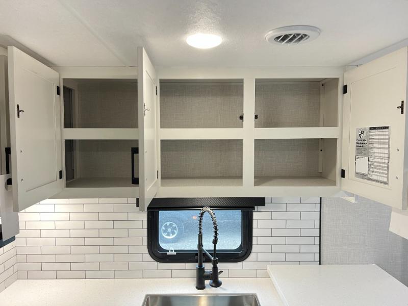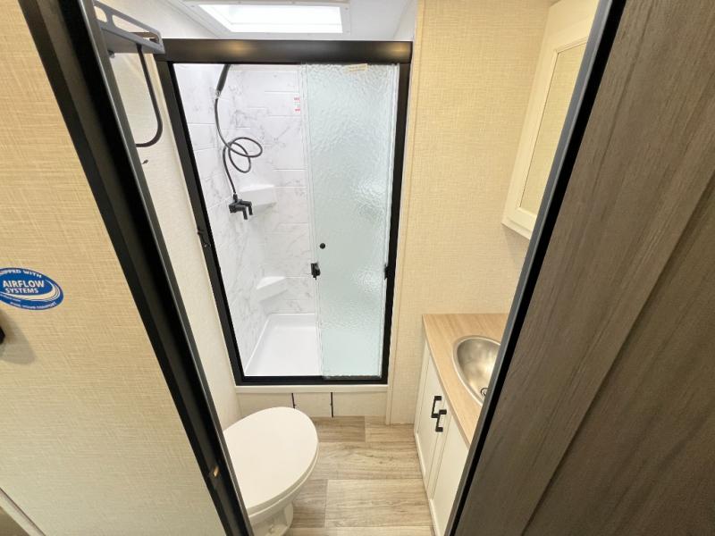 The chef will feel right at home cooking in the rear kitchen with all of the countertop space in this travel trailer! They can even head outside to breathe in some fresh air while cooking at the exterior campfire café with a refrigerator, a sink with countertop space, and a griddle. Relax each night in the middle living area with the 64" sofa and the slide that has theater seating with USB charging across from the entertainment center with a TV and 30" frameless fireplace. When you're ready to wind down your nights, take a hot shower in the full bathroom with the 30" x 36" shower then head to the front private bedroom and either read a book at the window seat or lay in the 70" x 80" sleep tight king bed slide while watching a movie with the TV or watch the 30" frameless fireplace!
