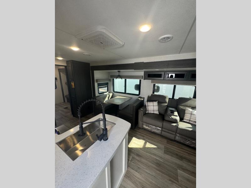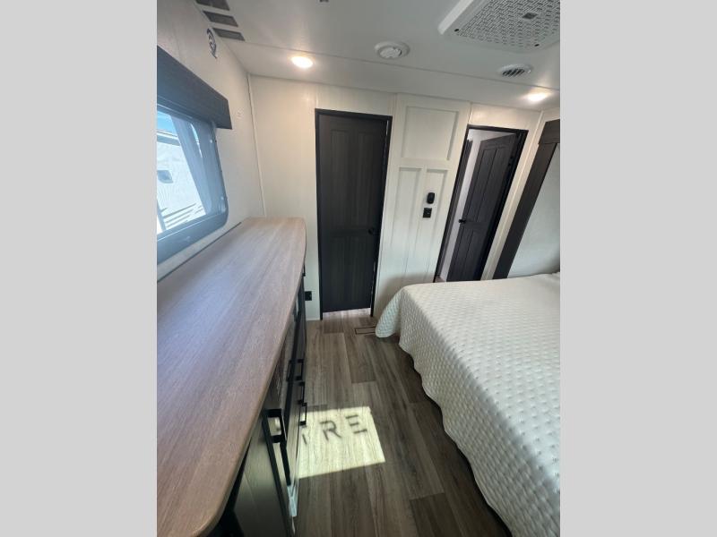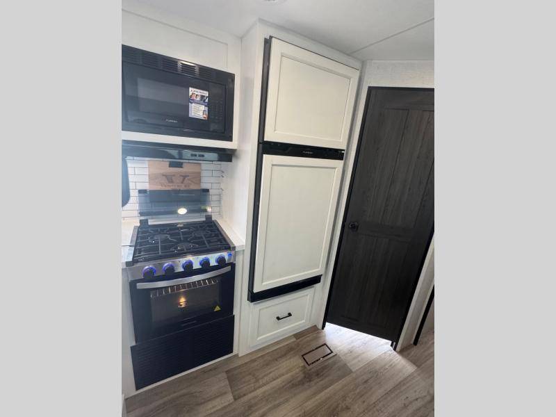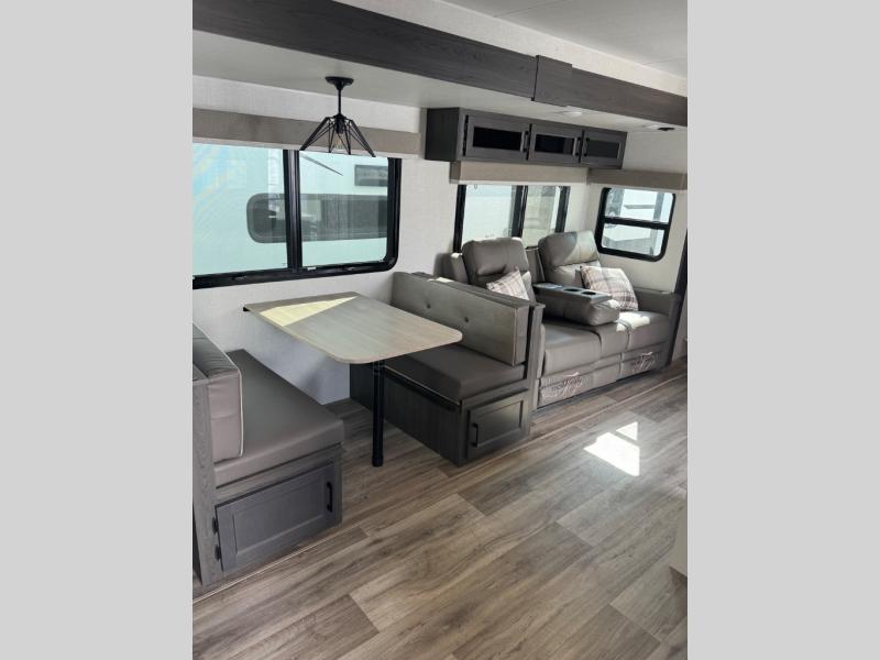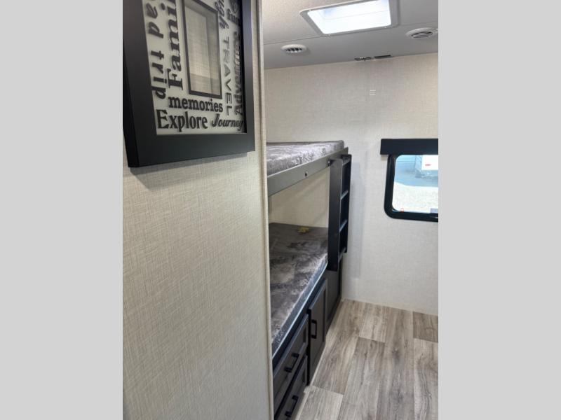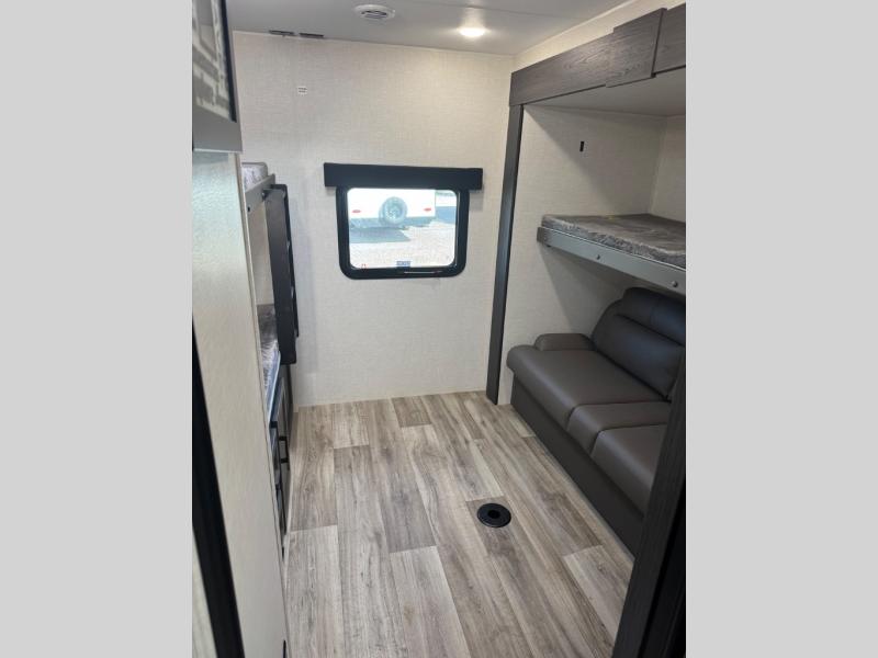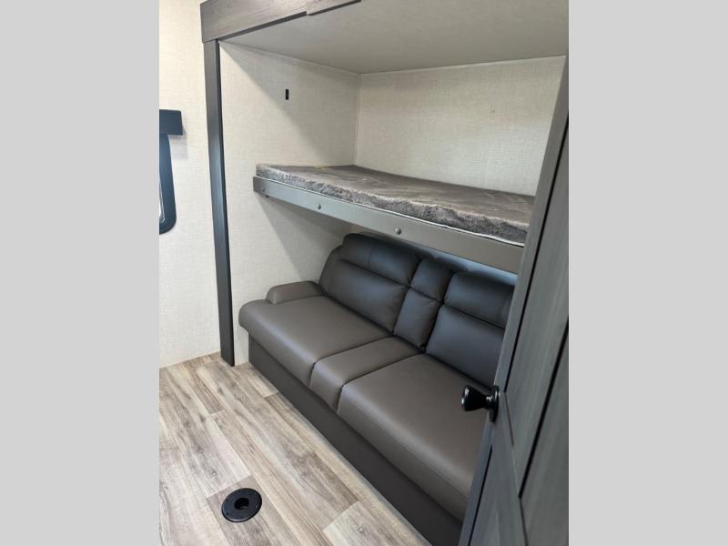The whole family can camp together in this travel trailer! It features a rear private bunkhouse with a 28" x 70" top bunk above a 40" x 70" bottom bunk, a closet, and a 28" x 73" flip up top bunk above a 70" sofa with table slide. One of the dual entry doors leads directly into the half bathroom with fold-out aluminum steps so you can get back to having fun faster. The chef can prepare their best meals for the crew either indoors with the three burner cooktop or at the exterior campfire café with a 40" TV/DVD/speakers to entertain them while they cook. Everyone can gather together at the Sit N' Slide table and 70" tri-fold sofa across from the entertainment center with a fireplace for a cozy evening. The dual entry bathroom is easy to access, especially for those staying in the front private bedroom. You even have a coat closet next to the main entrance to limit the clutter!