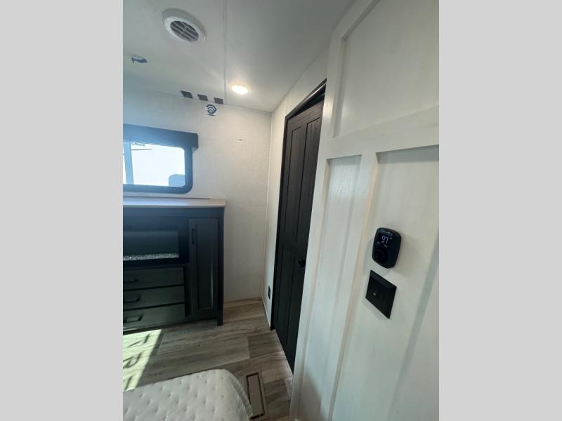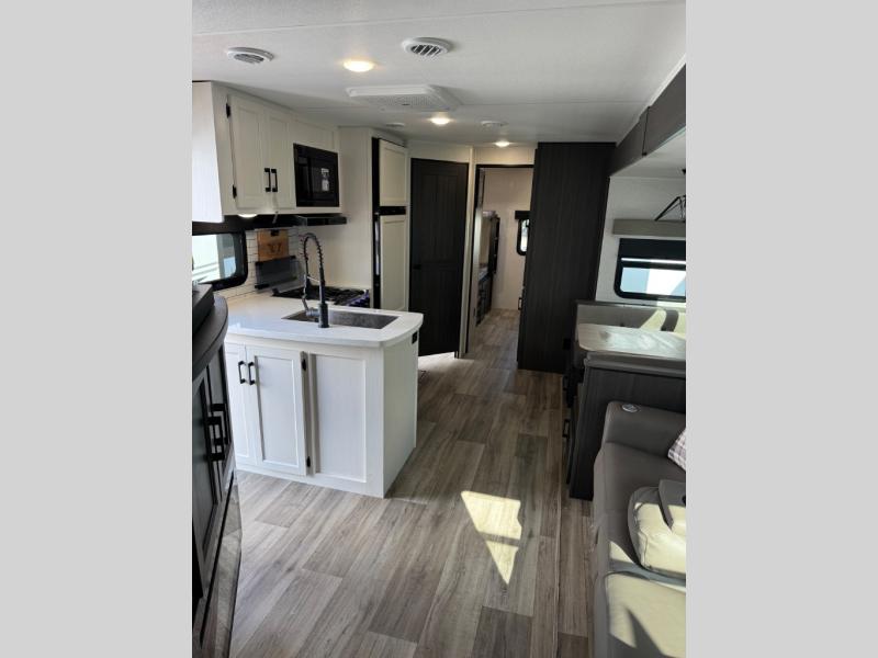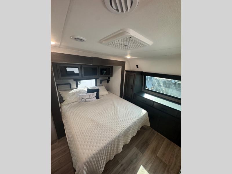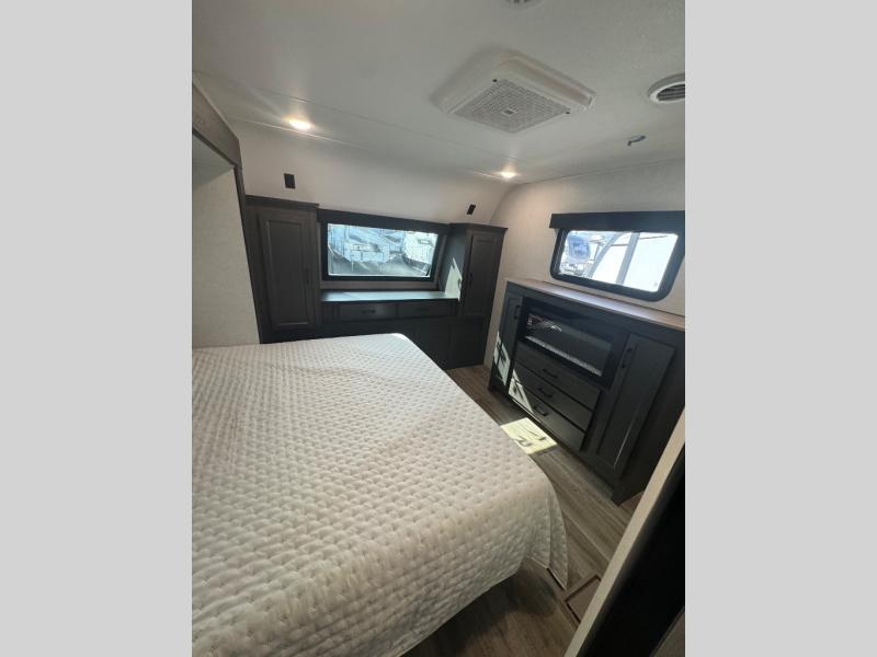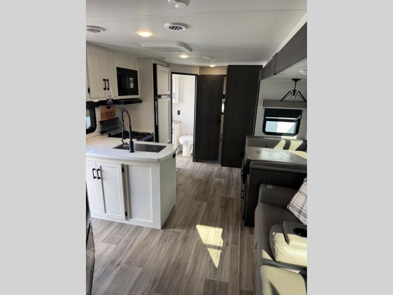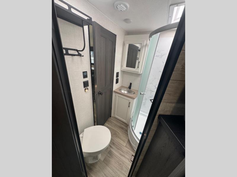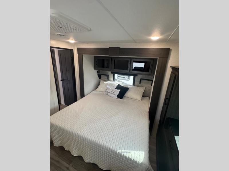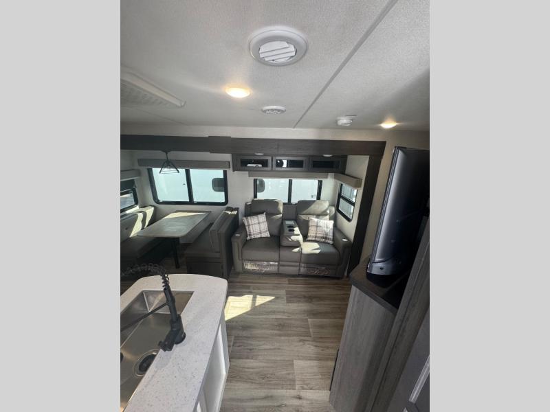 The whole family can camp together in this travel trailer! It features a rear private bunkhouse with a 28" x 70" top bunk above a 40" x 70" bottom bunk, a closet, and a 28" x 73" flip up top bunk above a 70" sofa with table slide. One of the dual entry doors leads directly into the half bathroom with fold-out aluminum steps so you can get back to having fun faster. The chef can prepare their best meals for the crew either indoors with the three burner cooktop or at the exterior campfire café with a 40" TV/DVD/speakers to entertain them while they cook. Everyone can gather together at the Sit N' Slide table and 70" tri-fold sofa across from the entertainment center with a fireplace for a cozy evening. The dual entry bathroom is easy to access, especially for those staying in the front private bedroom. You even have a coat closet next to the main entrance to limit the clutter!