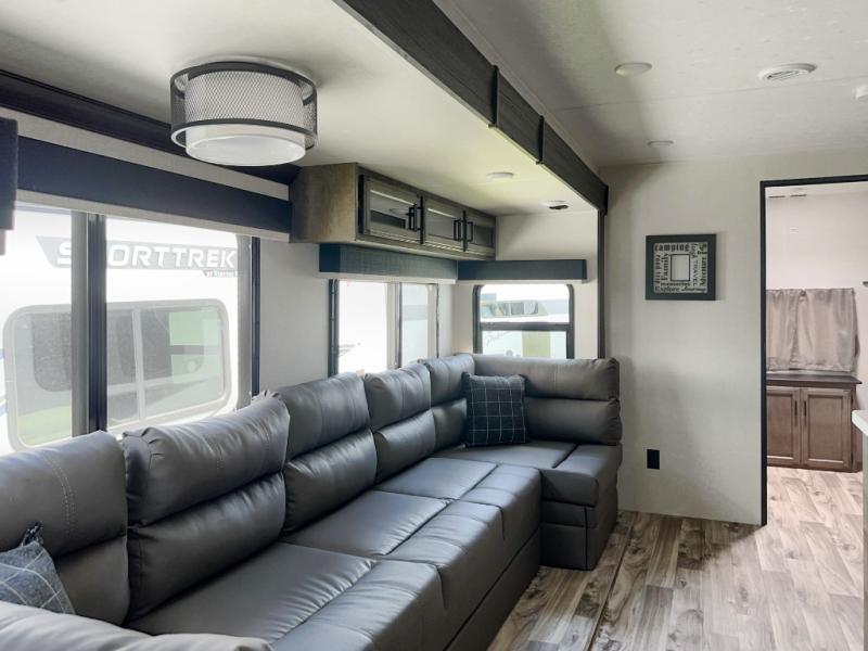 An elegant design and new features come with every one of these Venture RV SportTrek Touring Edition travel trailers! The NXG Huck bolt frame holds these units together and a walkable roof covers them. Heads will turn down the highway and at the campsite with an upgraded graphics package and a painted fiberglass front cap with integrated LED light. The exterior pass-through storage area has slam latch baggage doors with magnetic catches so you don't have to worry about them closing on you and a motion activated light to see your items clearly even at night. Luxury abounds throughout these units, especially with the mandatory Interior Luxury package which comes with solid surface kitchen countertops, designer valances with fabric nightshades, two 30" frameless fireplaces, and Beauflor wood plank flooring that is easy to clean. Come find your favorite model today!