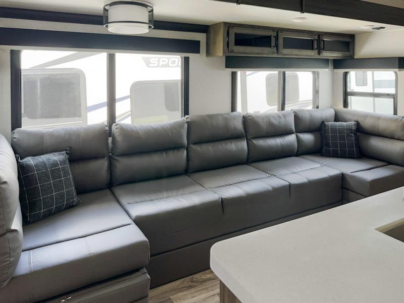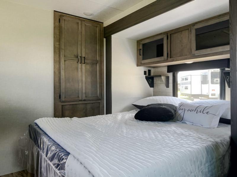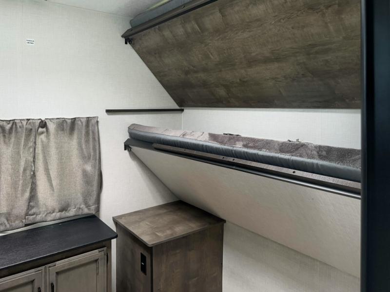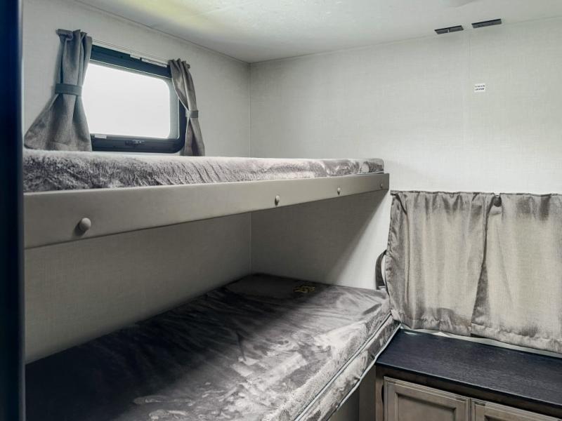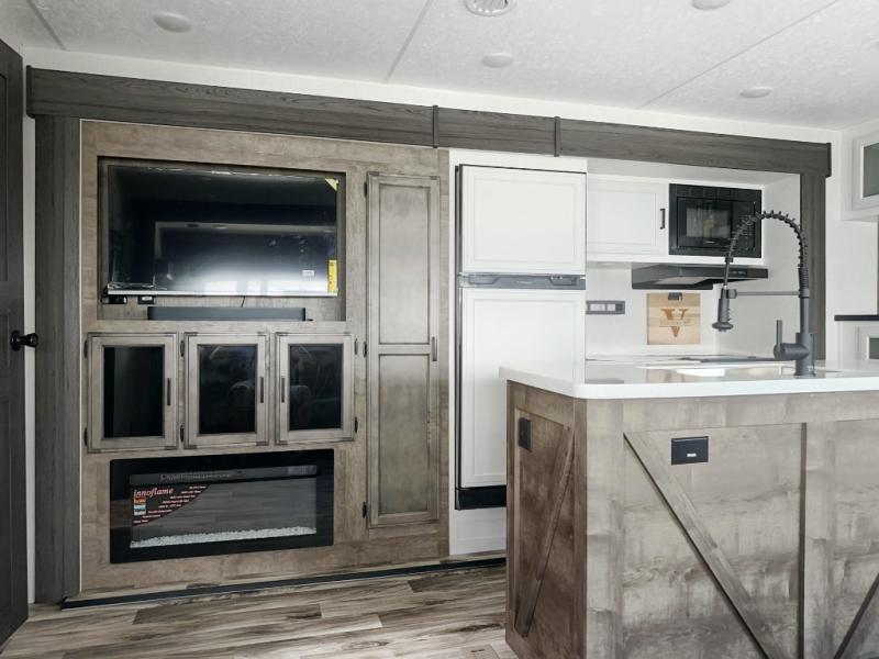 Versatility abounds in this travel trailer! The rear private bunkhouse has a set of 32" x 70" bunk beds and a set of 28" x 70" flip up bunk beds, but what is really special about this room is its ability to convert to a flex room with a desk, king bed, extra storage or a pet palace. The chef will enjoy having their choice of either cooking indoors with the kitchen island and three burner cooktop or cooking at the exterior campfire café with a refrigerator, a griddle, and a sink with countertop space. Relax each night in true comfort with a 70" tri-fold sofa across from the entertainment center with a 30" frameless fireplace, plus the front private bedroom has a 30" frameless fireplace across from a 60" x 80" queen bed slide. You can even transform the sofa and the 42" grand dinette into extra sleeping spaces. The bedroom also has a window seat so you can look out at your beautiful scenery while reading a book and an interior wall wardrobe with washer and dryer prep!