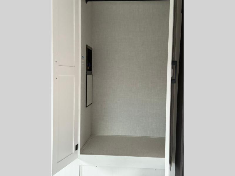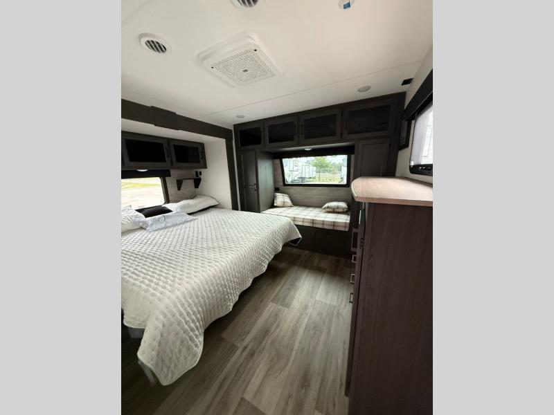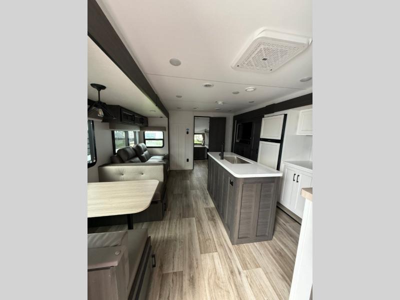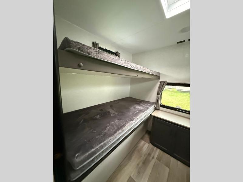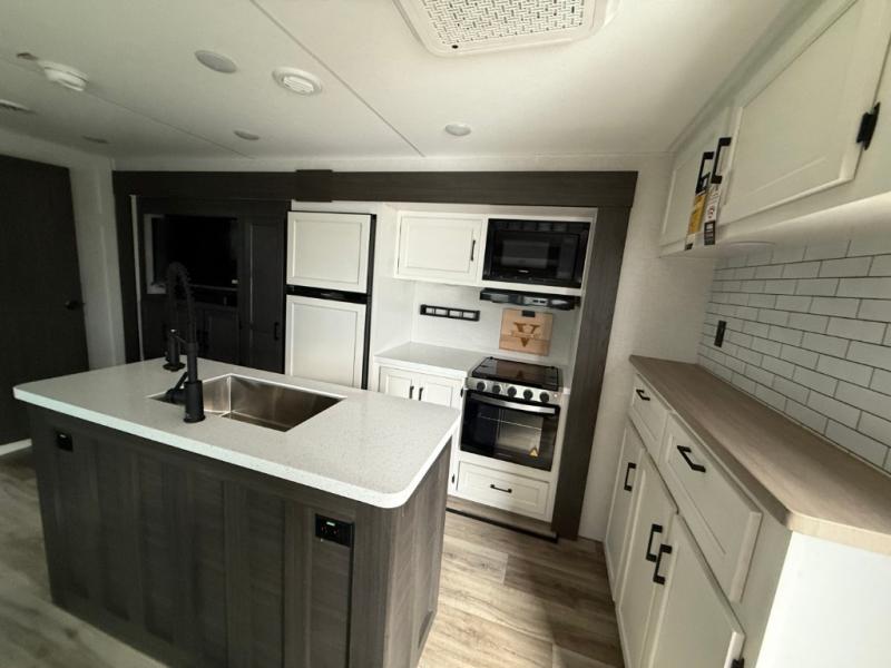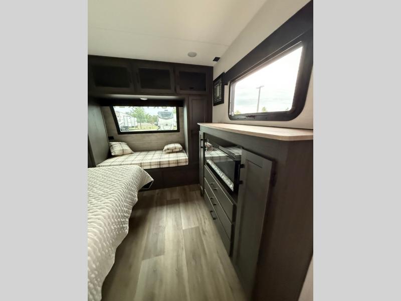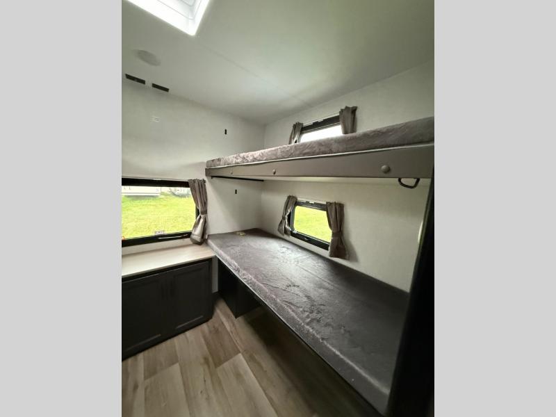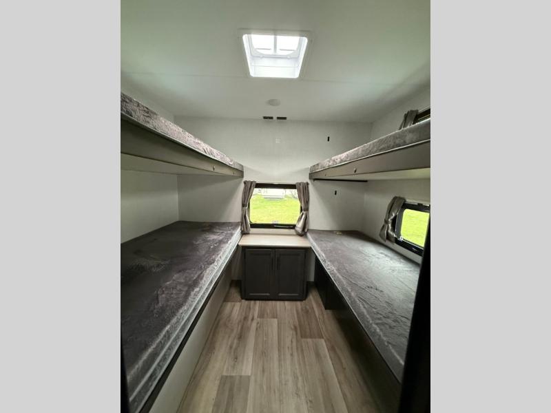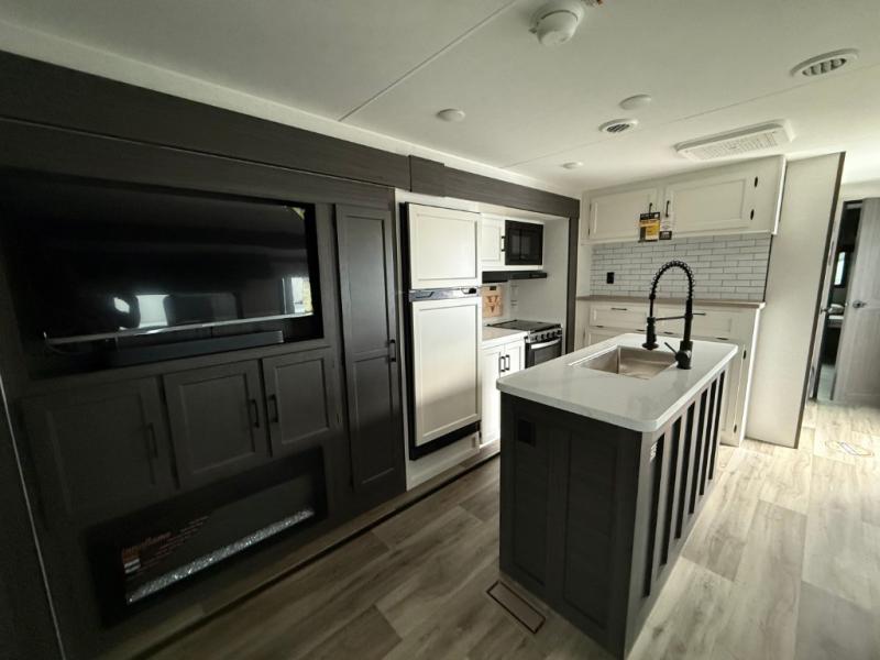 Versatility abounds in this travel trailer! The rear private bunkhouse has a set of 32" x 70" bunk beds and a set of 28" x 70" flip up bunk beds, but what is really special about this room is its ability to convert to a flex room with a desk, king bed, extra storage or a pet palace. The chef will enjoy having their choice of either cooking indoors with the kitchen island and three burner cooktop or cooking at the exterior campfire café with a refrigerator, a griddle, and a sink with countertop space. Relax each night in true comfort with a 70" tri-fold sofa across from the entertainment center with a 30" frameless fireplace, plus the front private bedroom has a 30" frameless fireplace across from a 60" x 80" queen bed slide. You can even transform the sofa and the Sit N' Slide table into extra sleeping spaces. The bedroom also has a window seat so you can look out at your beautiful scenery while reading a book and an interior wall wardrobe with washer and dryer prep!
