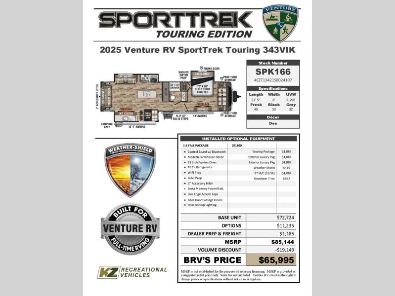 Venture RV SportTrek Touring Edition 343VIK Highlights: