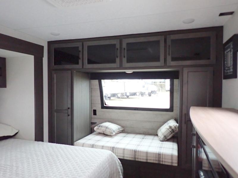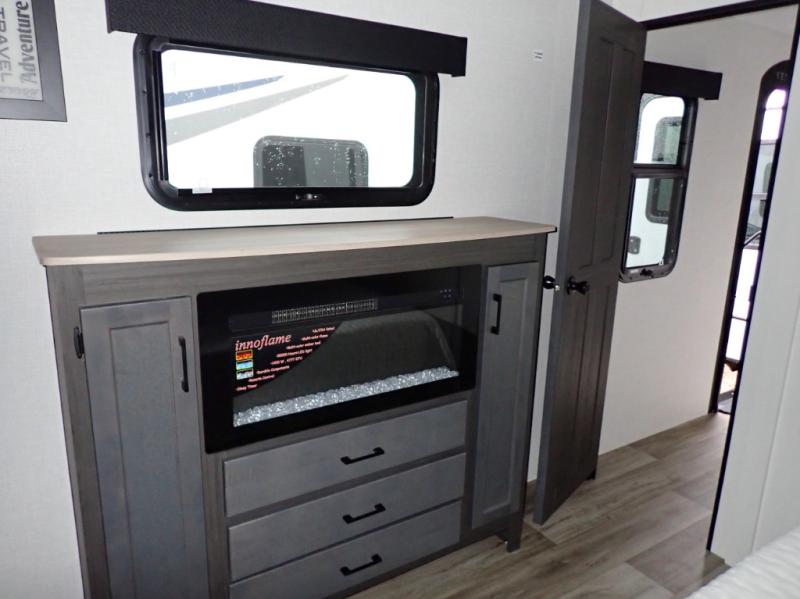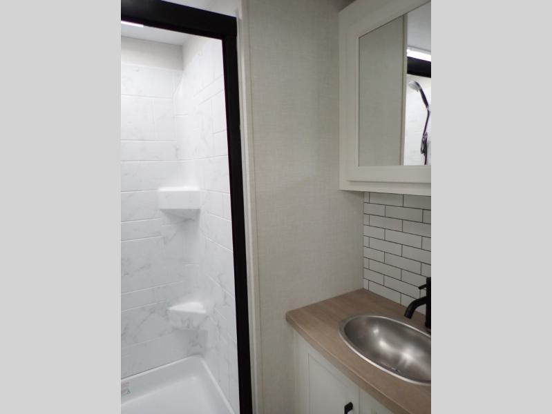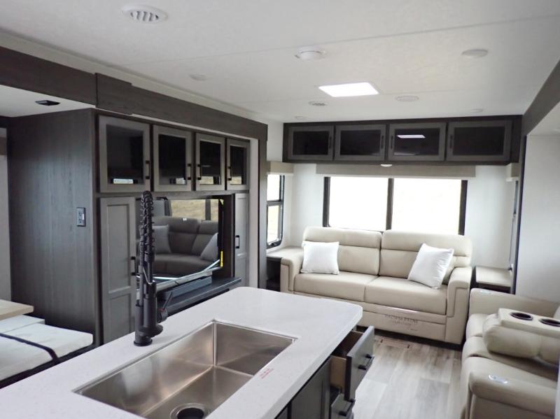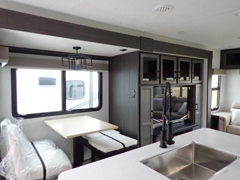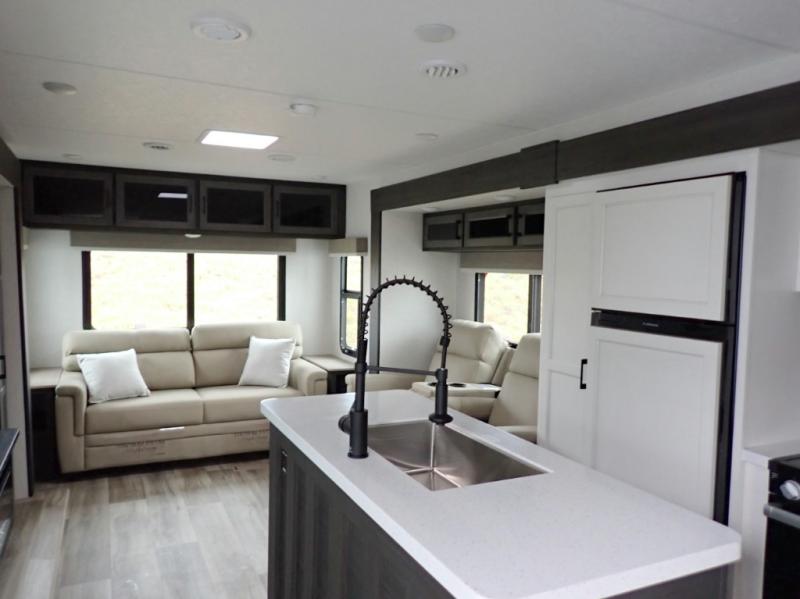 Venture's SportTrek Touring grabs a lot of attention. These are truly beautiful travel trailers! Wall to wall luxury with a Modern Farmhouse décor. The 343VIK is half-ton towable and is designed to allow year round RVing. The SportTrek Touring 343VIK is sure to give a couple of small family an amazing camping experience time after time. This is a front bedroom / rear living room model. The spacious kitchen is in the mid-section of the trailer and includes an island counter. You will love taking the fun outdoors as your family enjoys the integrated outside kitchen.