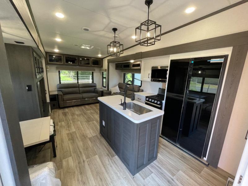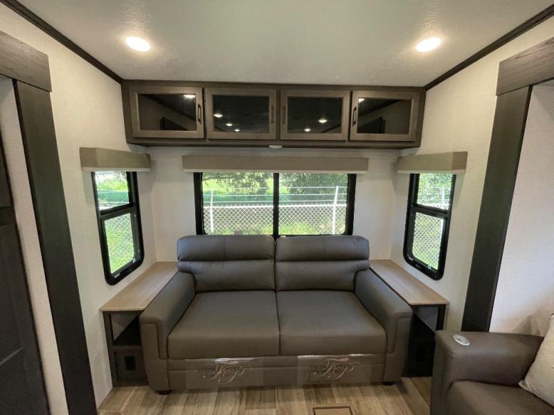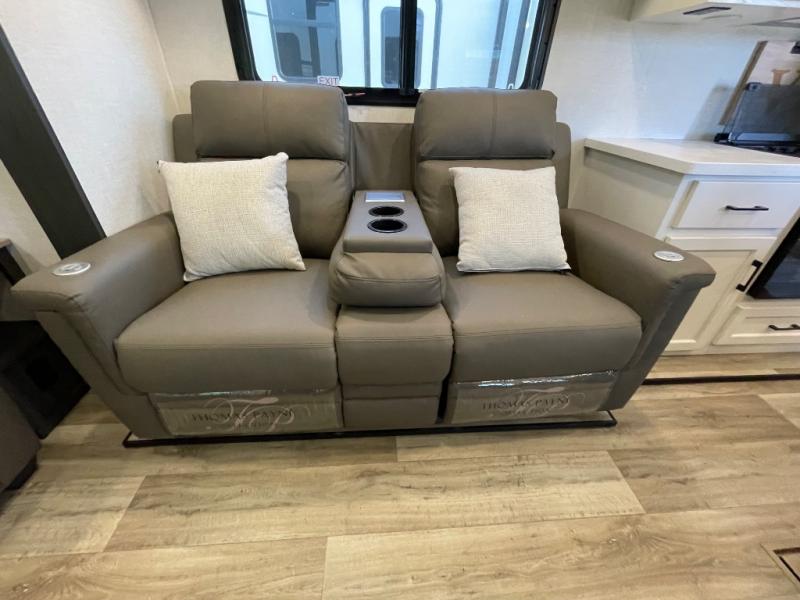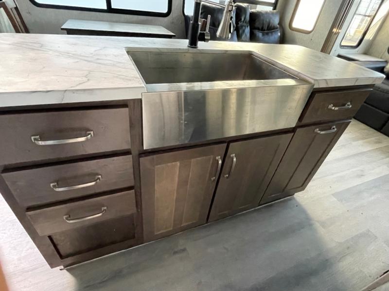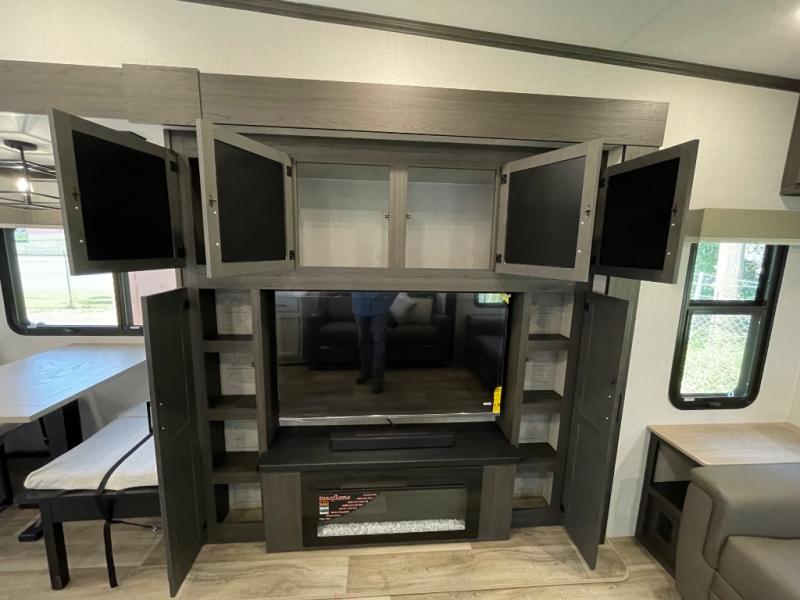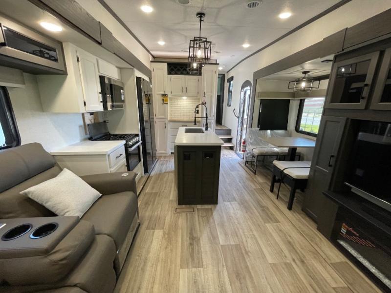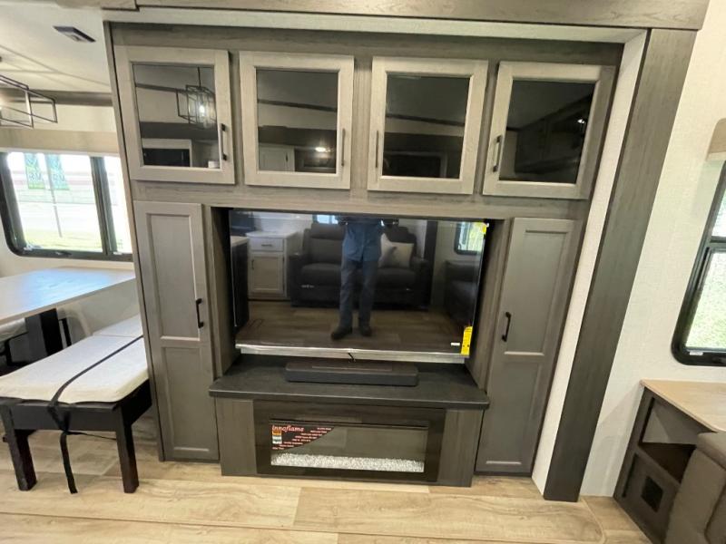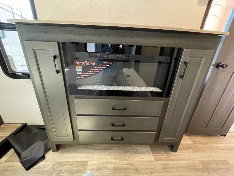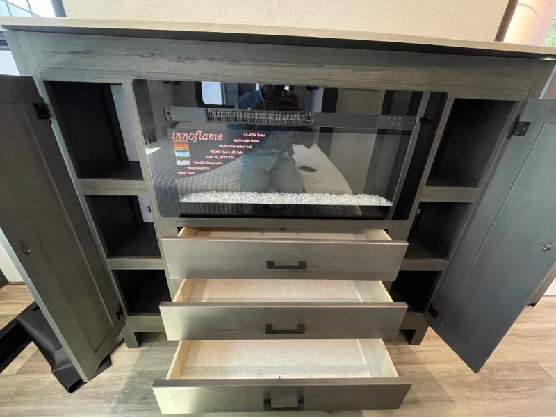 You won't even feel like you're camping in this fifth wheel! The front private bedroom has a Serta king mattress to lay your head on at night, a window seat to comfortably read a book while enjoying the 5,000 BTU fireplace, a shelf storage closet, and a prepped area for a washer and dryer. Freshen up each morning with the 48" fiberglass shower in the full bathroom then head down the floating steps with shoe storage to whip up a delicious breakfast. The fully equipped kitchen even comes with a 18" GE stainless steel dishwasher at the kitchen island for easy clean up. Enjoy your meals at the table with two chairs and two Versa benches. You could even cook at the outside campfire cafe with the griddle. Inside the rear living area, you will find a 70" tri-fold sofa with end tables and theater seating with USB charging across from the entertainment center with a 5,000 BTU fireplace!