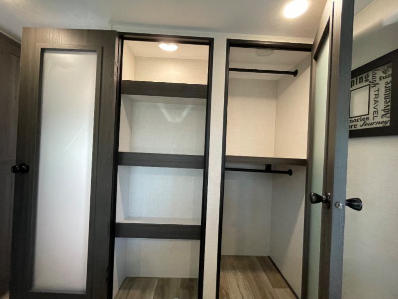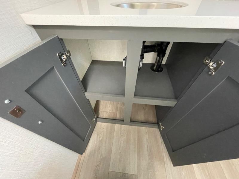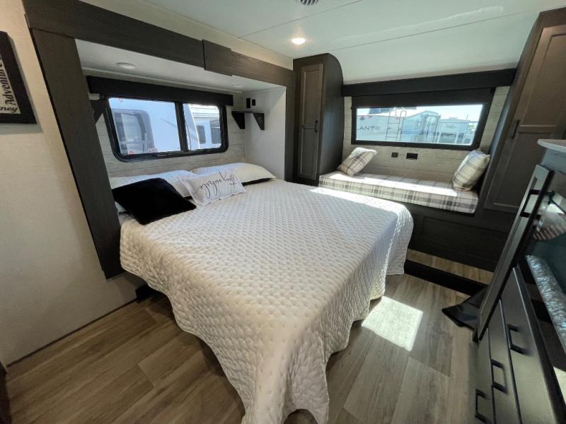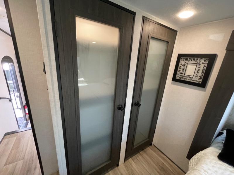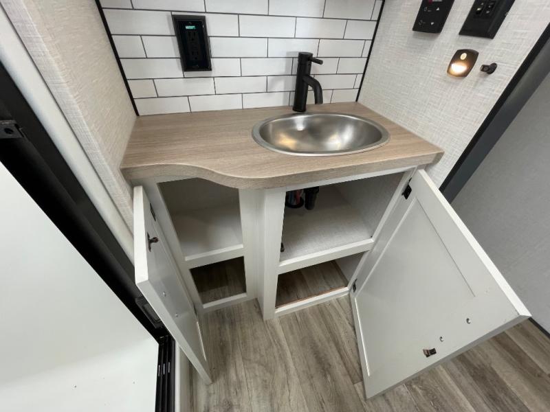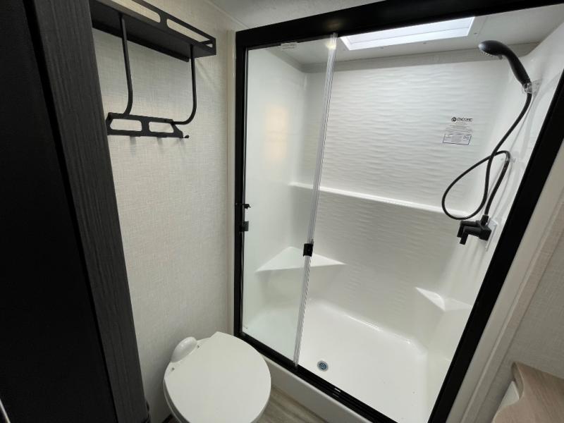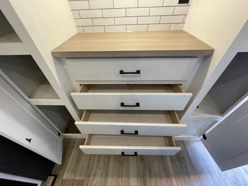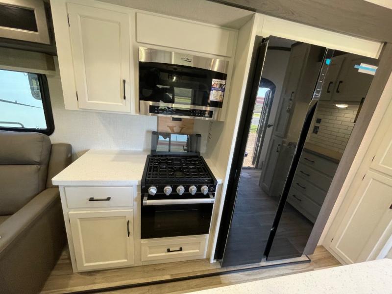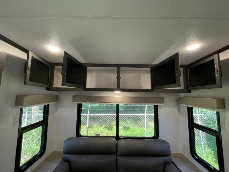 You won't even feel like you're camping in this fifth wheel! The front private bedroom has a Serta king mattress to lay your head on at night, a window seat to comfortably read a book while enjoying the 5,000 BTU fireplace, a shelf storage closet, and a prepped area for a washer and dryer. Freshen up each morning with the 48" fiberglass shower in the full bathroom then head down the floating steps with shoe storage to whip up a delicious breakfast. The fully equipped kitchen even comes with a 18" GE stainless steel dishwasher at the kitchen island for easy clean up. Enjoy your meals at the table with two chairs and two Versa benches. You could even cook at the outside campfire cafe with the griddle. Inside the rear living area, you will find a 70" tri-fold sofa with end tables and theater seating with USB charging across from the entertainment center with a 5,000 BTU fireplace!