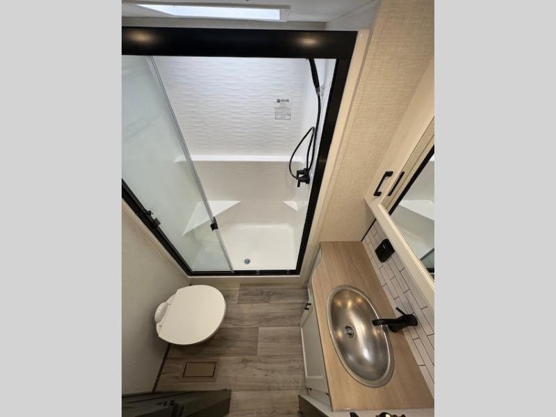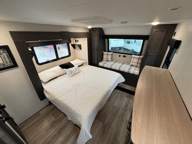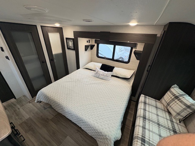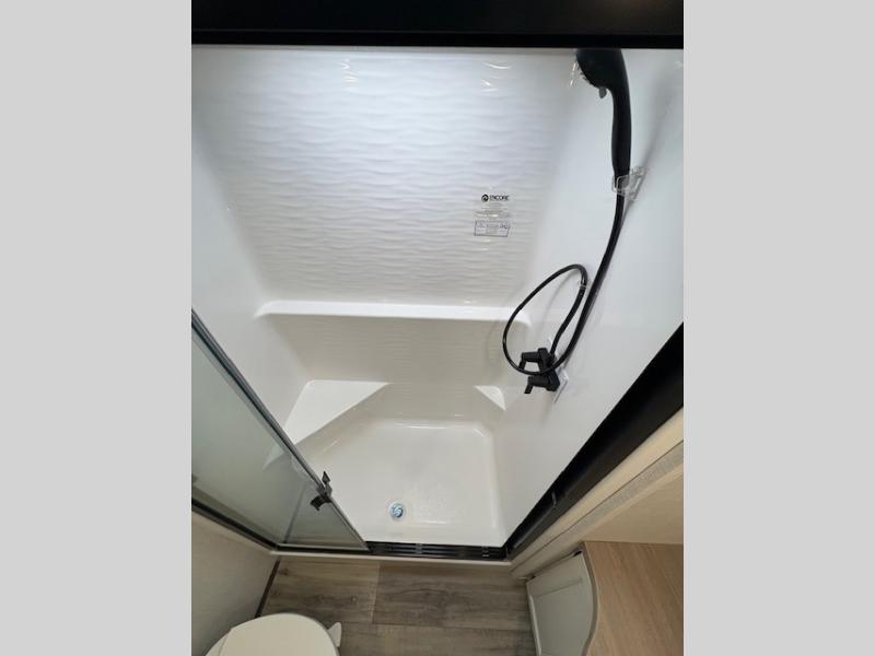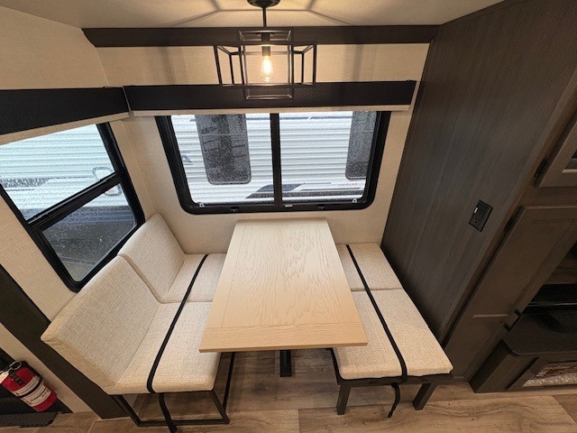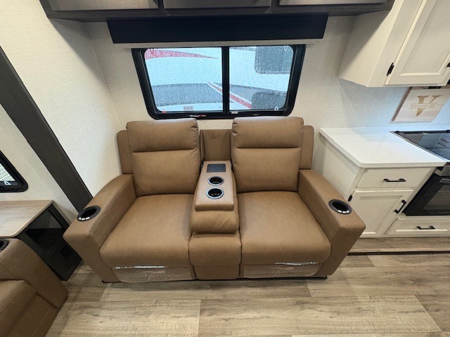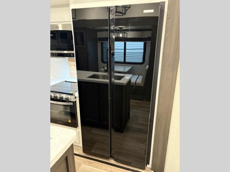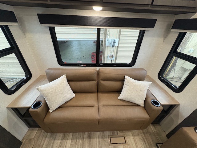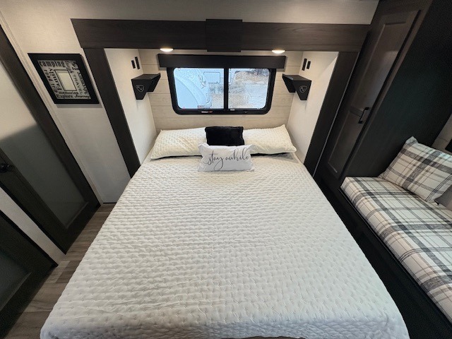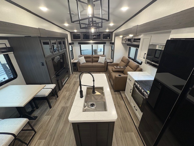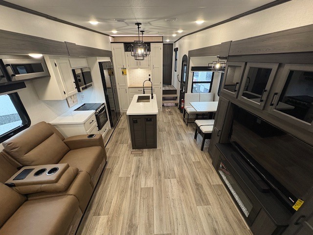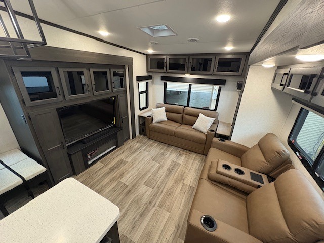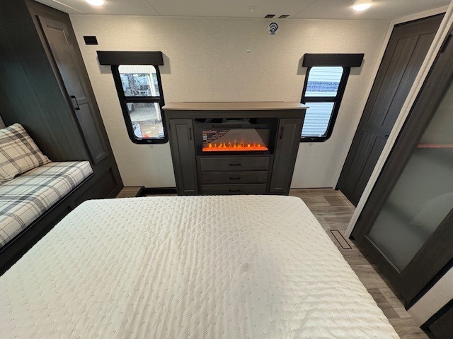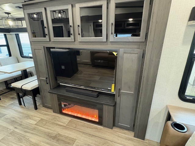 You won't even feel like you're camping in this fifth wheel! The front private bedroom has a Serta king mattress to lay your head on at night, a window seat to comfortably read a book while enjoying the 5,000 BTU fireplace, a shelf storage closet, and a prepped area for a washer and dryer. Freshen up each morning with the 48" fiberglass shower in the full bathroom then head down the floating steps with shoe storage to whip up a delicious breakfast. The fully equipped kitchen even comes with a 18" GE stainless steel dishwasher at the kitchen island for easy clean up. Enjoy your meals at the table with two chairs and two Versa benches. You could even cook at the outside campfire cafe with the griddle. Inside the rear living area, you will find a 70" tri-fold sofa with end tables and theater seating with USB charging across from the entertainment center with a 5,000 BTU fireplace!
