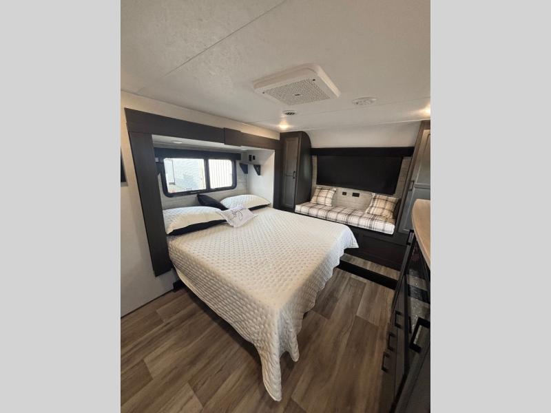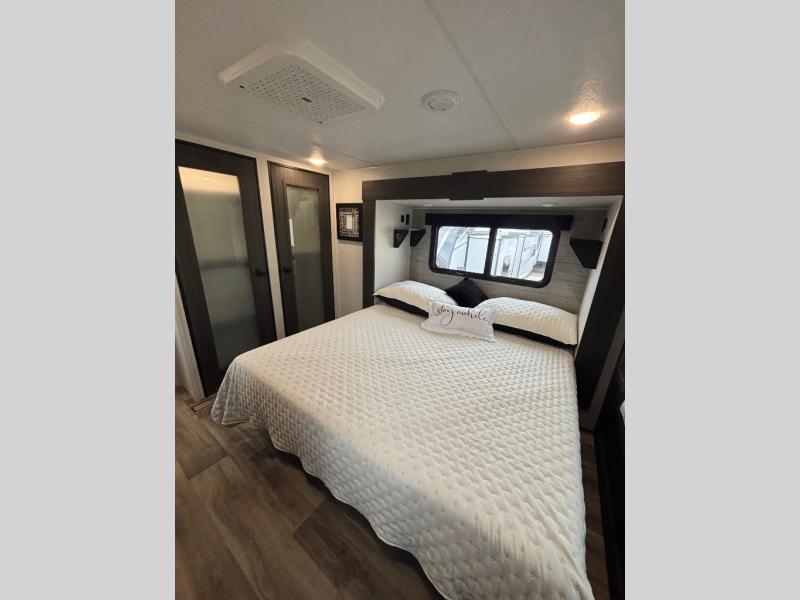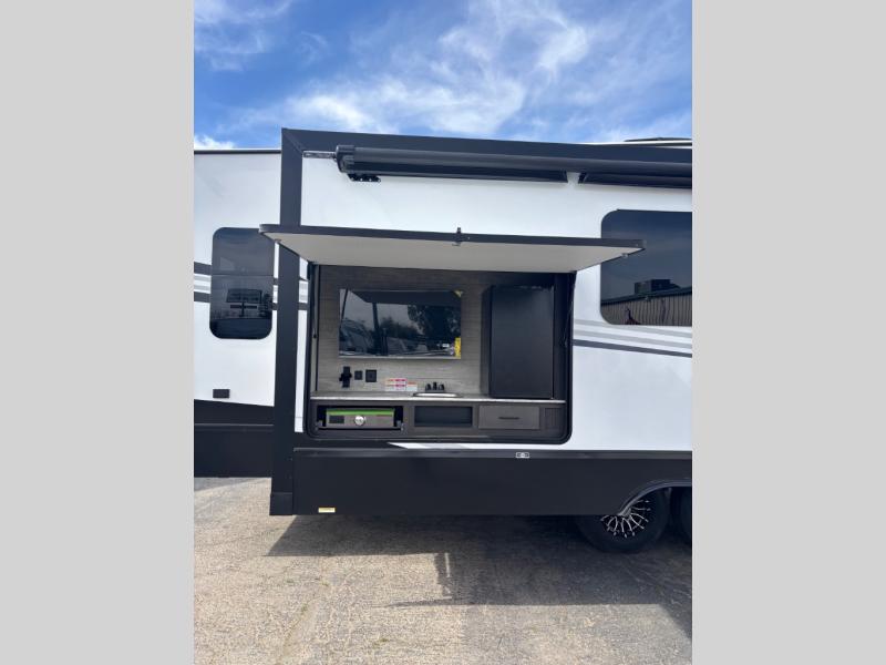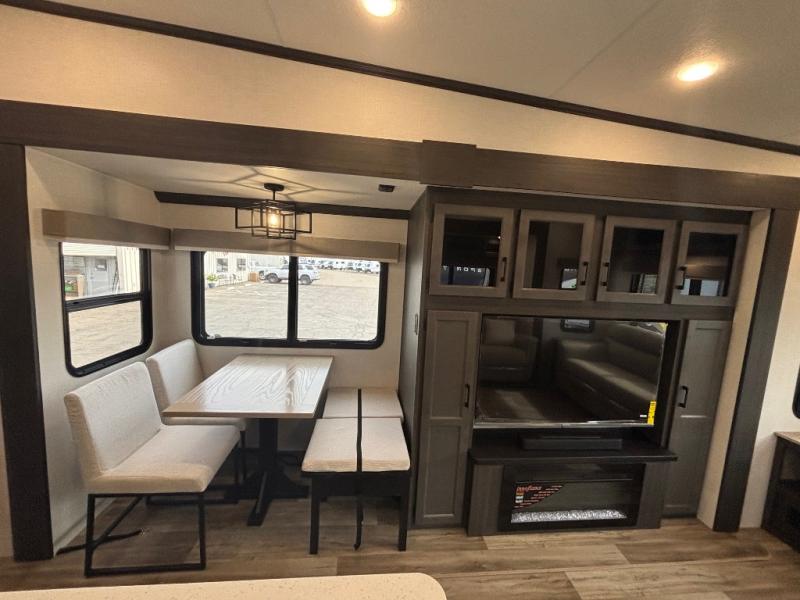 You won't even feel like you're camping in this fifth wheel! The front private bedroom has a Serta king mattress to lay your head on at night, a window seat to comfortably read a book while enjoying the 5,000 BTU fireplace, a shelf storage closet, and a prepped area for a washer and dryer. Freshen up each morning with the 48" fiberglass shower in the full bathroom then head down the floating steps with shoe storage to whip up a delicious breakfast. The fully equipped kitchen even comes with a 18" GE stainless steel dishwasher at the kitchen island for easy clean up. Enjoy your meals at the table with two chairs and two Versa benches. You could even cook at the outside campfire cafe with the griddle. Inside the rear living area, you will find a 70" tri-fold sofa with end tables and theater seating with USB charging across from the entertainment center with a 5,000 BTU fireplace!