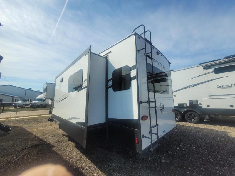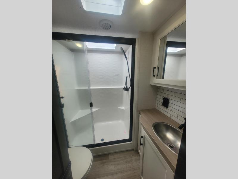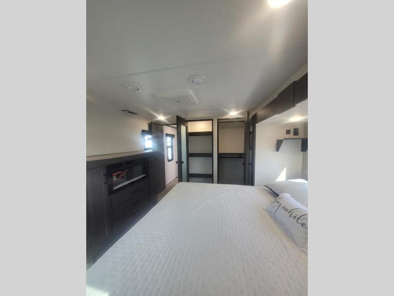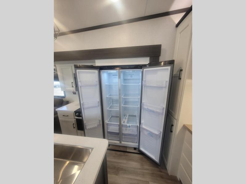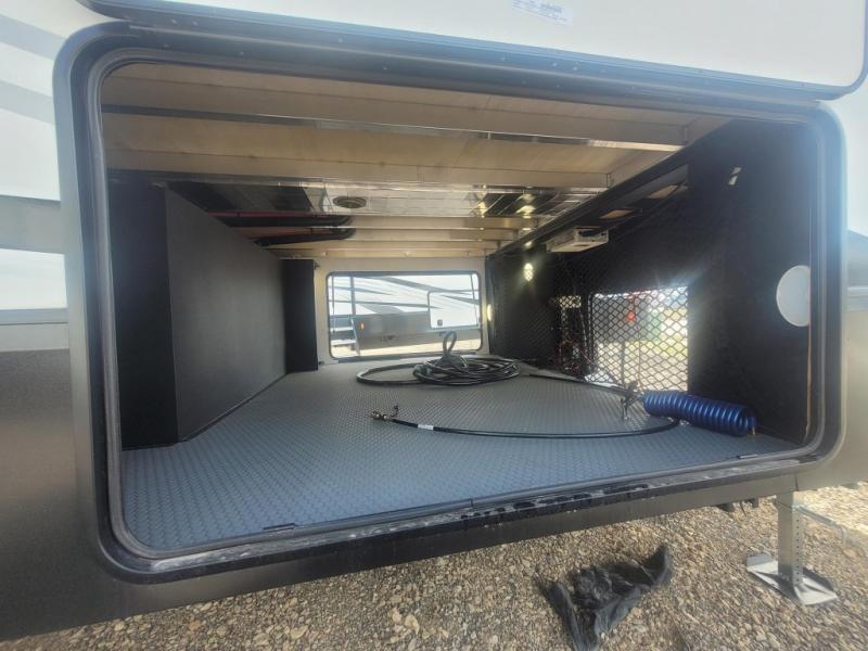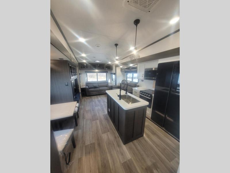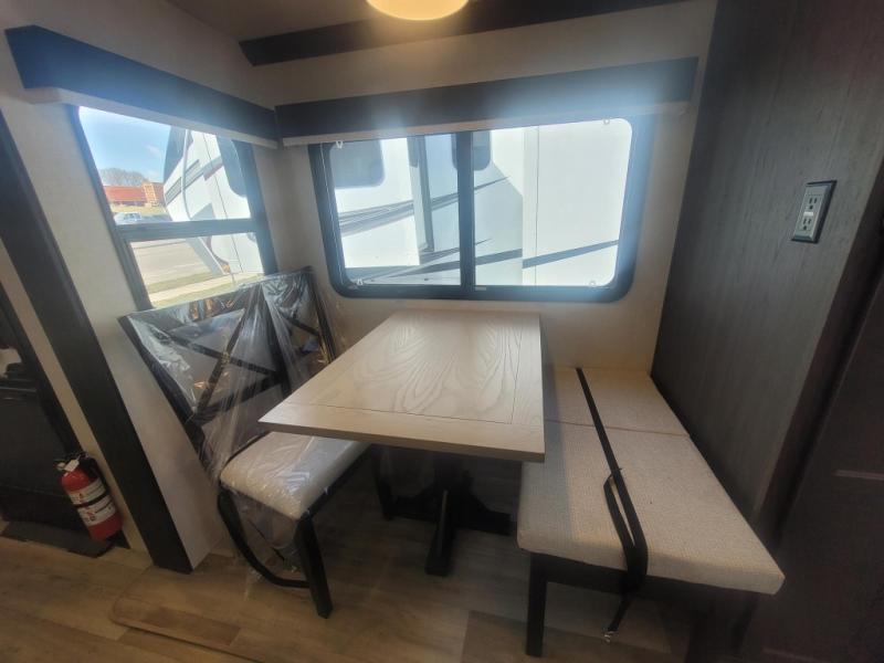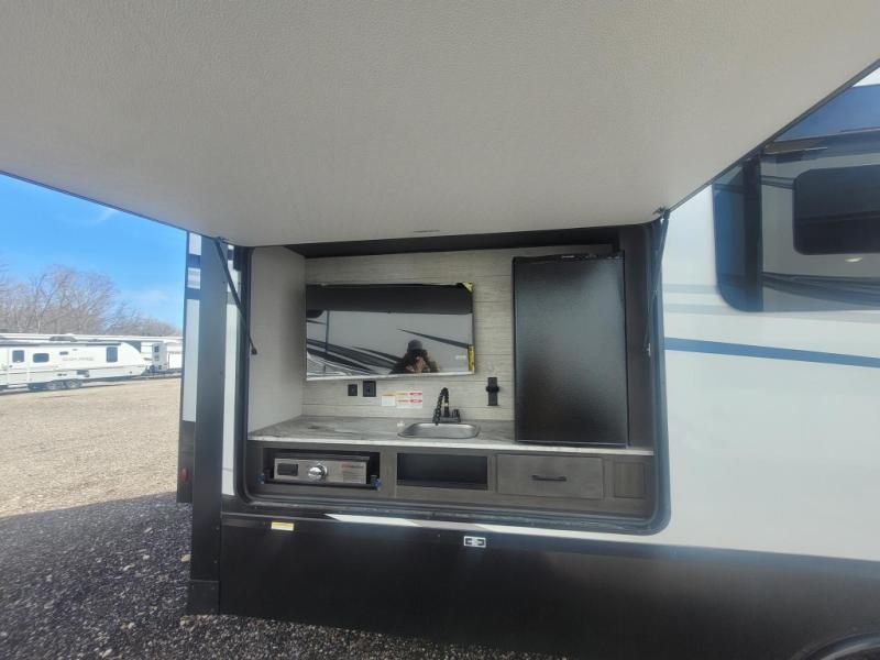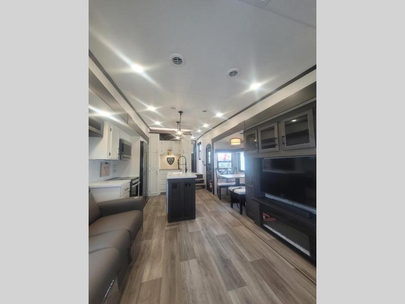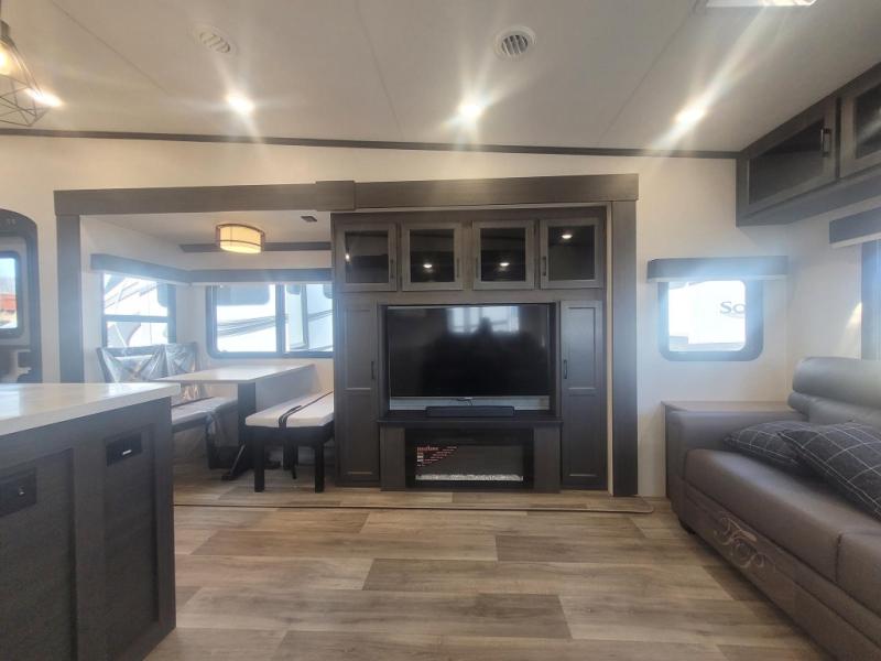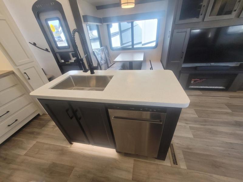 You won't even feel like you're camping in this fifth wheel! The front private bedroom has a Serta king mattress to lay your head on at night, a window seat to comfortably read a book while enjoying the 5,000 BTU fireplace, a shelf storage closet, and a prepped area for a washer and dryer. Freshen up each morning with the 48" fiberglass shower in the full bathroom then head down the floating steps with shoe storage to whip up a delicious breakfast. The fully equipped kitchen even comes with a 18" GE stainless steel dishwasher at the kitchen island for easy clean up. Enjoy your meals at the table with two chairs and two Versa benches. You could even cook at the outside campfire cafe with the griddle. Inside the rear living area, you will find a 70" tri-fold sofa with end tables and theater seating with USB charging across from the entertainment center with a 5,000 BTU fireplace!