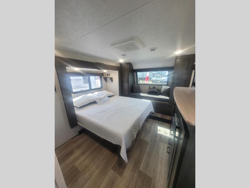 An elegant design and new features come with every one of these Venture RV SportTrek Touring Edition fifth wheels! The NXG Huck bolt frame holds these units together and Tufflex PVC roofing covers them. Heads will turn down the highway and at the campsite with the frameless tinted windows and high gloss fiberglass front cap with automotive paint. The exterior pass-through storage area has slam latch baggage doors with magnetic catches so you don't have to worry about them closing on you and LED lighting on the electric awning so you can see clearly even at night. Luxury abounds throughout these units, especially with the two fireplaces, solid surface kitchen countertops, blackout roller shades, and maximum storage designs. Come find your favorite model today!