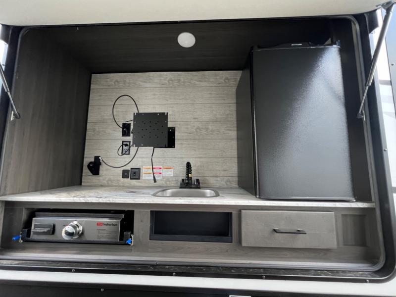 The chef will love cooking in the rear kitchen of this fifth wheel! The front private bedroom has a Serta king mattress to lay your head on at night, a window seat to comfortably read a book while enjoying the 5,000 BTU fireplace, a shelf storage closet, and a prepped area for a washer and dryer. Freshen up each morning with the 48" fiberglass shower with a seat in the full bathroom then head down the floating steps with shoe storage to whip up a delicious breakfast. The fully equipped kitchen even comes with a 18" GE stainless steel dishwasher at the rear sink with countertops on either side for easy clean up. Enjoy your meals at the table with two chairs and two Versa benches. You could even cook at the outside campfire cafe with the griddle. Inside the middle living area, you will find a tri-fold sofa with overhead cabinets and theater seating with USB charging across from the entertainment center with a 5,000 BTU fireplace!