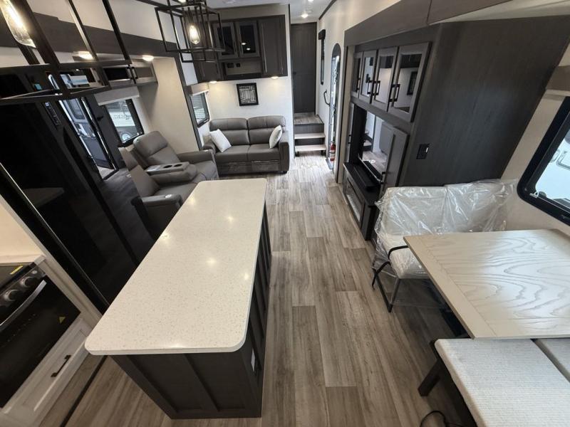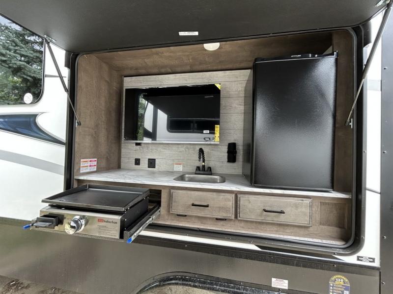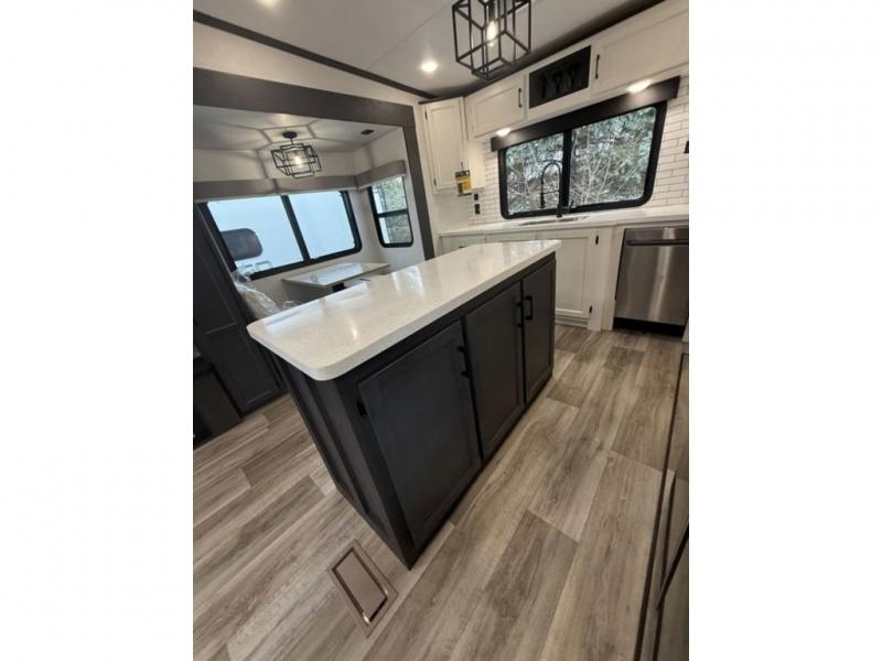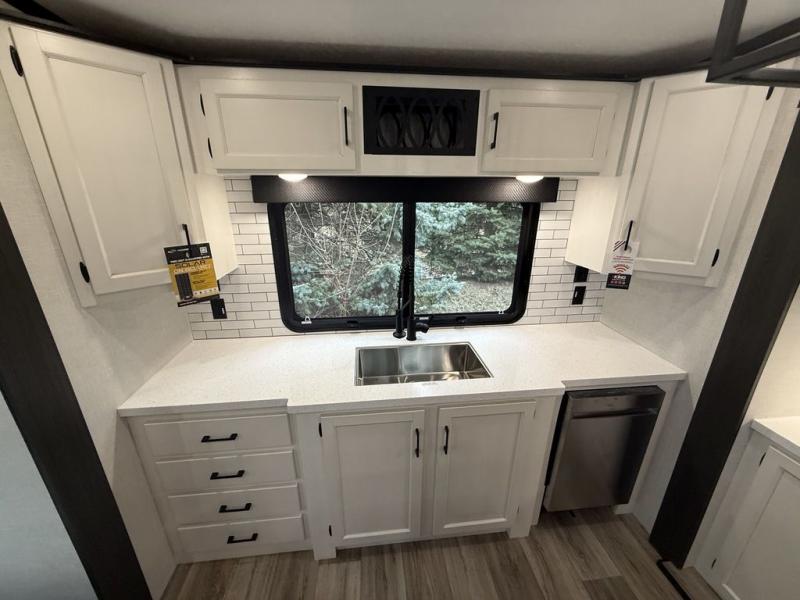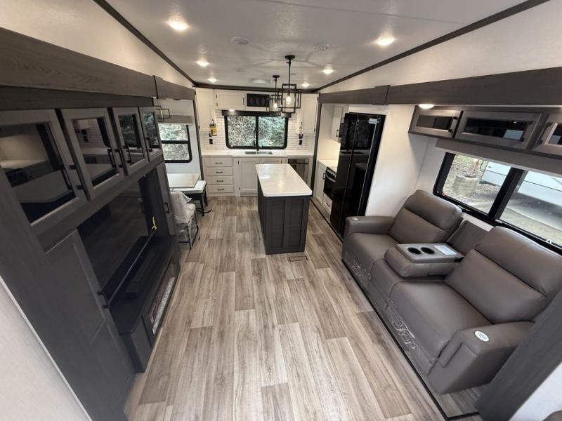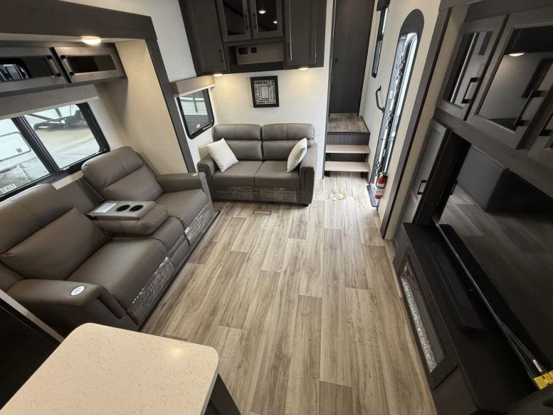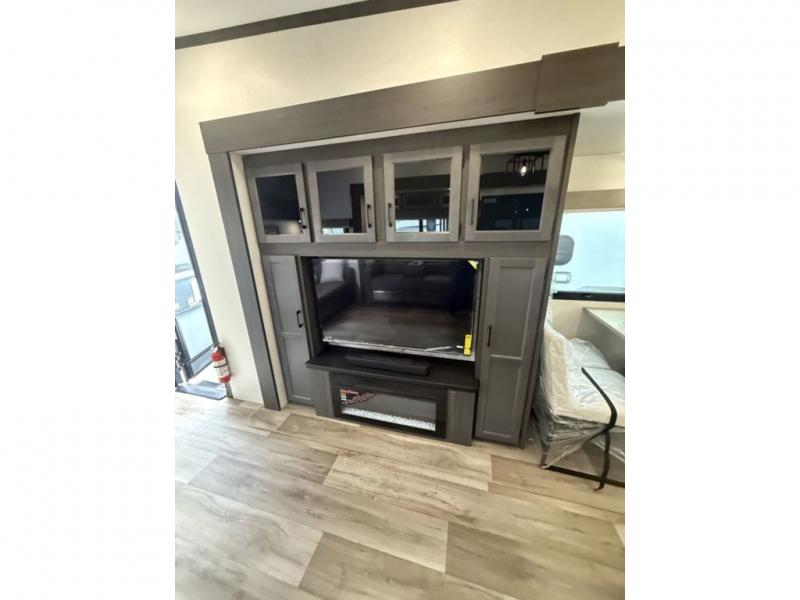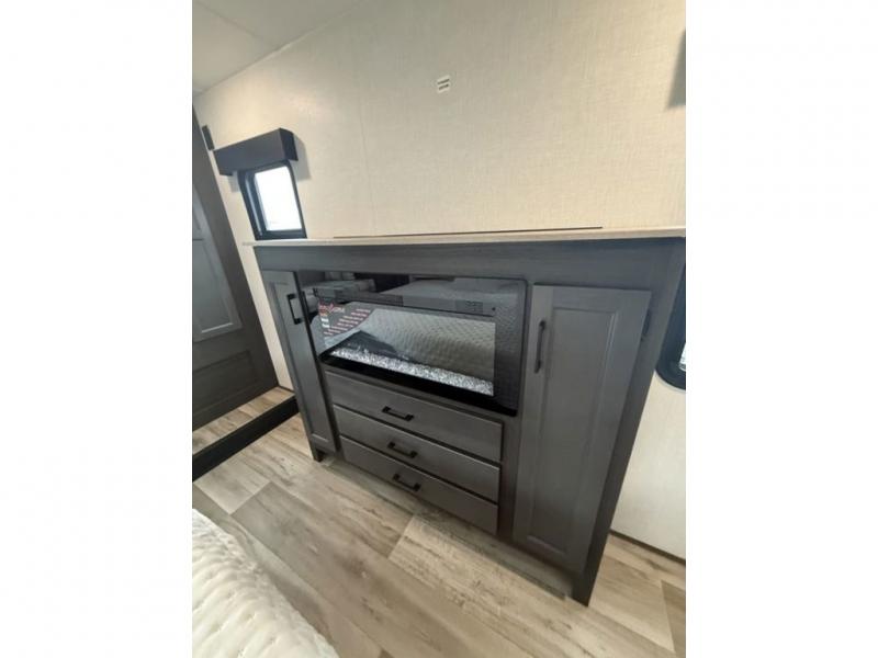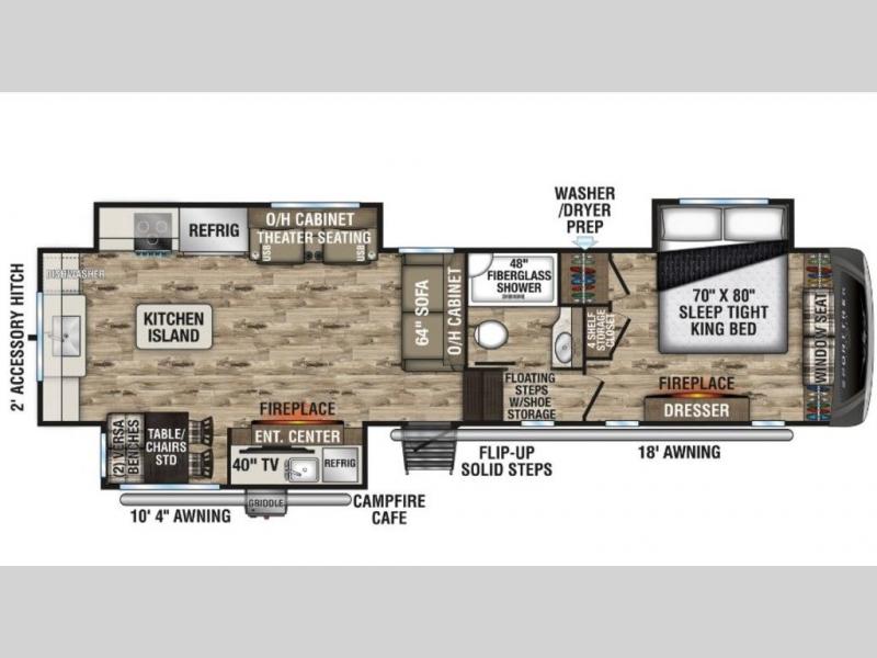 The chef will love cooking in the rear kitchen of this fifth wheel! The front private bedroom has a Serta king mattress to lay your head on at night, a window seat to comfortably read a book while enjoying the 5,000 BTU fireplace, a shelf storage closet, and a prepped area for a washer and dryer. Freshen up each morning with the 48" fiberglass shower with a seat in the full bathroom then head down the floating steps with shoe storage to whip up a delicious breakfast. The fully equipped kitchen even comes with a 18" GE stainless steel dishwasher at the rear sink with countertops on either side for easy clean up. Enjoy your meals at the table with two chairs and two Versa benches. You could even cook at the outside campfire cafe with the griddle. Inside the middle living area, you will find a tri-fold sofa with overhead cabinets and theater seating with USB charging across from the entertainment center with a 5,000 BTU fireplace!