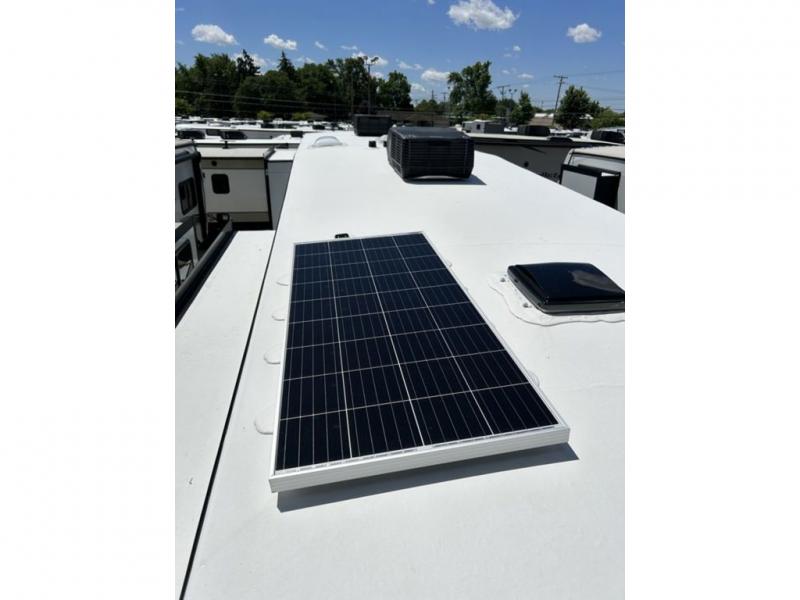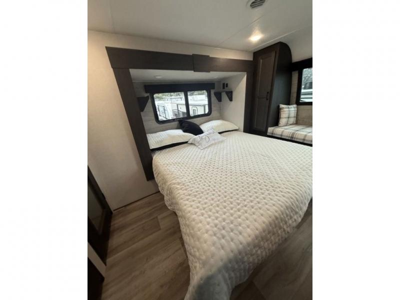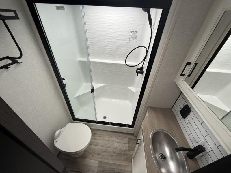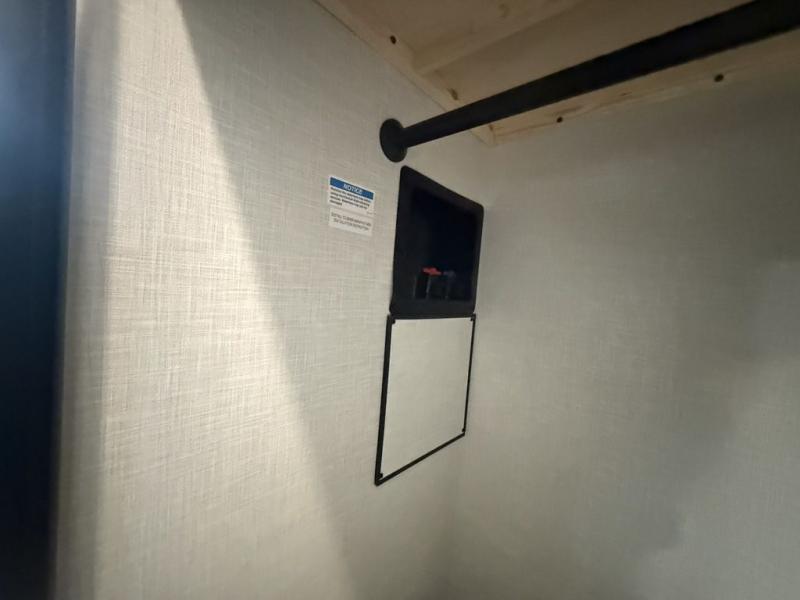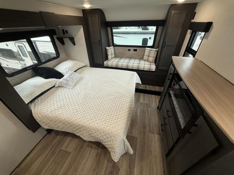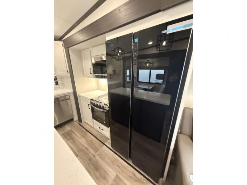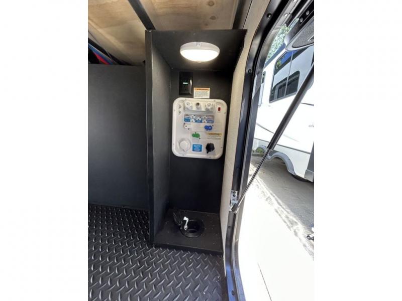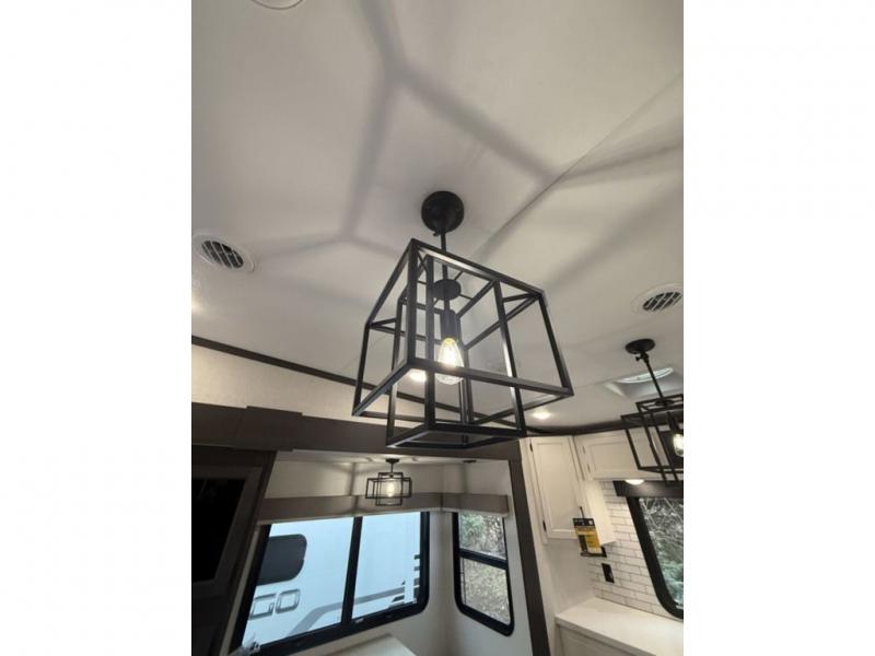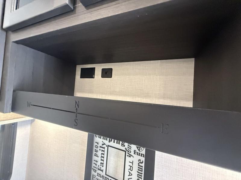 The chef will love cooking in the rear kitchen of this fifth wheel! The front private bedroom has a Serta king mattress to lay your head on at night, a window seat to comfortably read a book while enjoying the 5,000 BTU fireplace, a shelf storage closet, and a prepped area for a washer and dryer. Freshen up each morning with the 48" fiberglass shower with a seat in the full bathroom then head down the floating steps with shoe storage to whip up a delicious breakfast. The fully equipped kitchen even comes with a 18" GE stainless steel dishwasher at the rear sink with countertops on either side for easy clean up. Enjoy your meals at the table with two chairs and two Versa benches. You could even cook at the outside campfire cafe with the griddle. Inside the middle living area, you will find a tri-fold sofa with overhead cabinets and theater seating with USB charging across from the entertainment center with a 5,000 BTU fireplace!