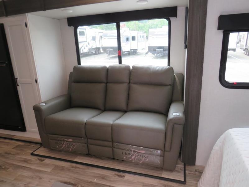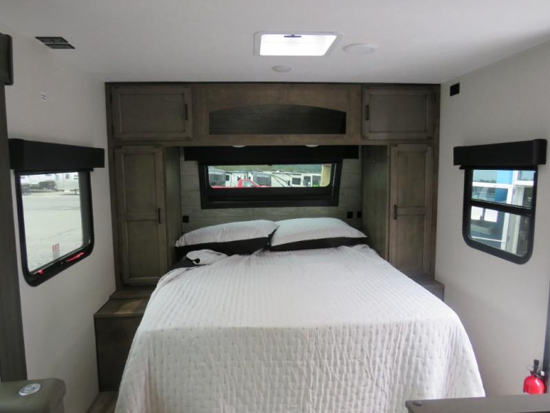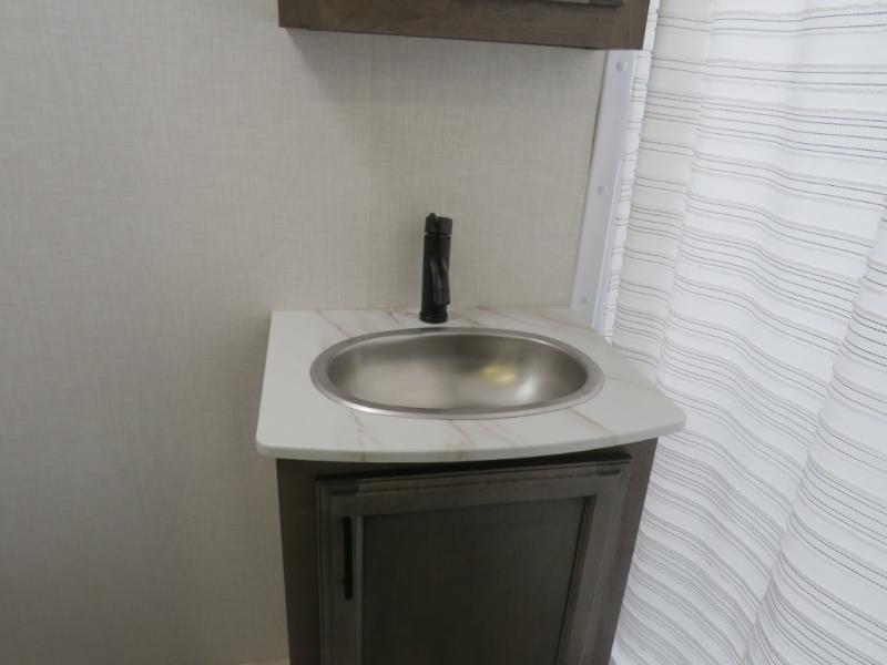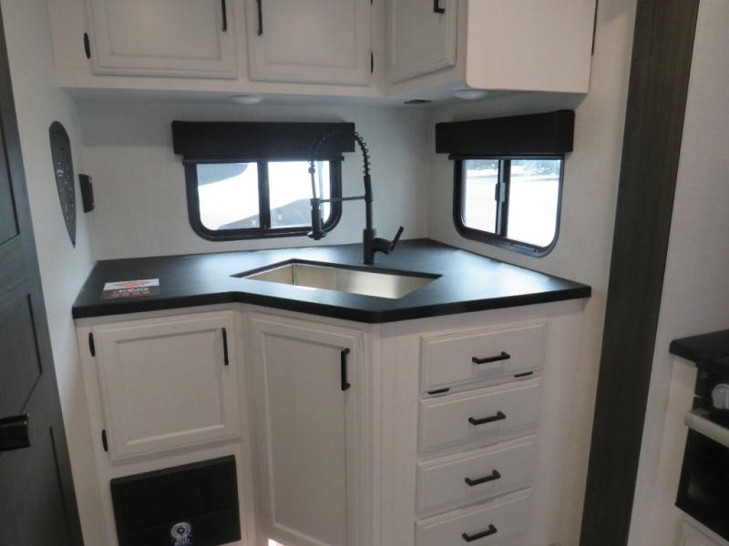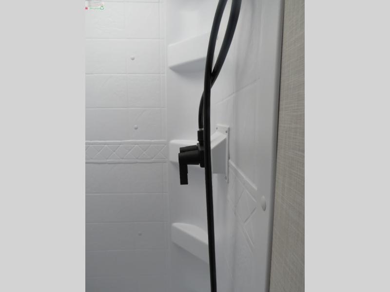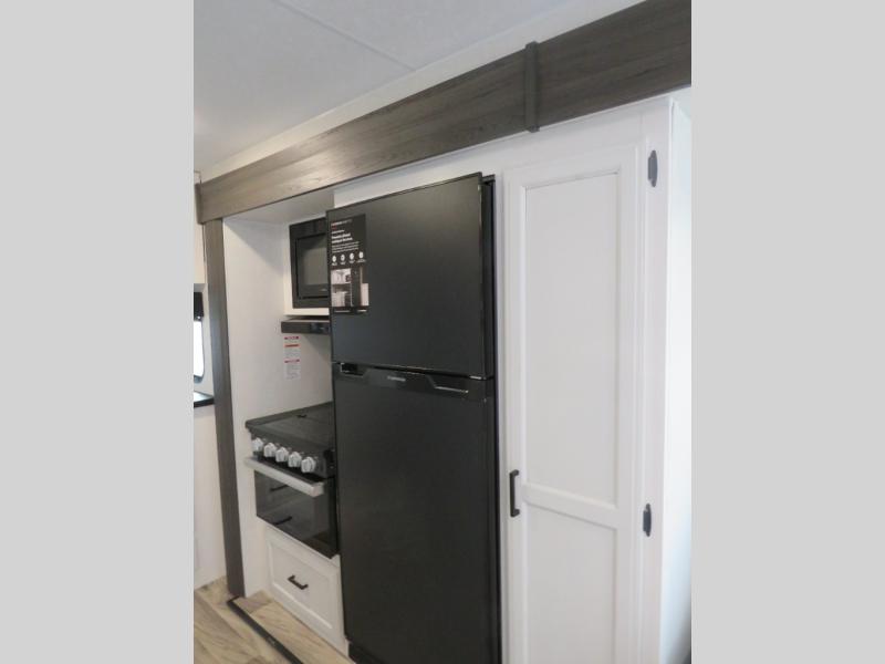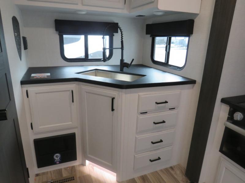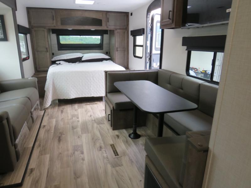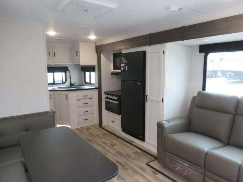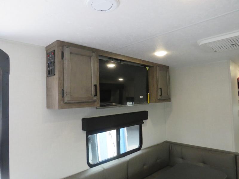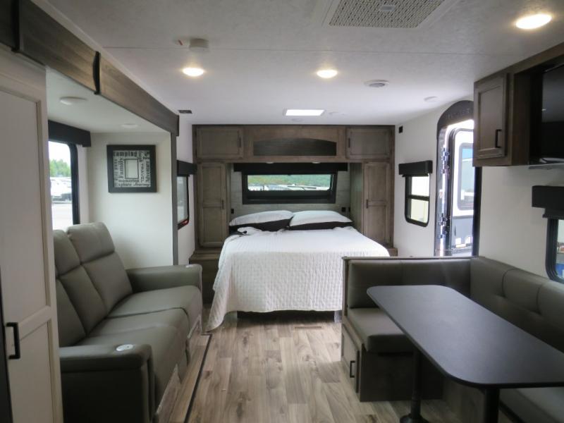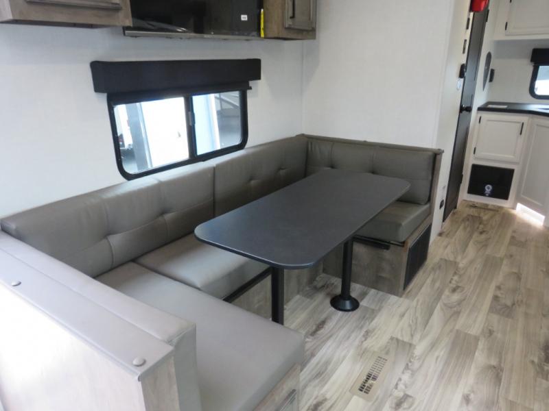 You and your spouse will have a good time at the campground in this travel trailer! The front sleep tight queen bed has shelves and overhead cabinets to keep your items close by but out of the way. Grab some eggs from the 10 cu. ft. refrigerator to fry them up on the three burner cooktop then enjoy them at the 88" x 42" U-shaped dinette which has an entertainment center above it. After a fun, long day at the beach you can freshen up in the rear corner bathroom in the 30" x 36" shower then relax on the theater seating with USB ports and cupholders!