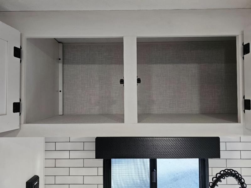 - Front Queen Bed: Cozy sleep tight queen bed with overhead cabinets and shelves for storage.