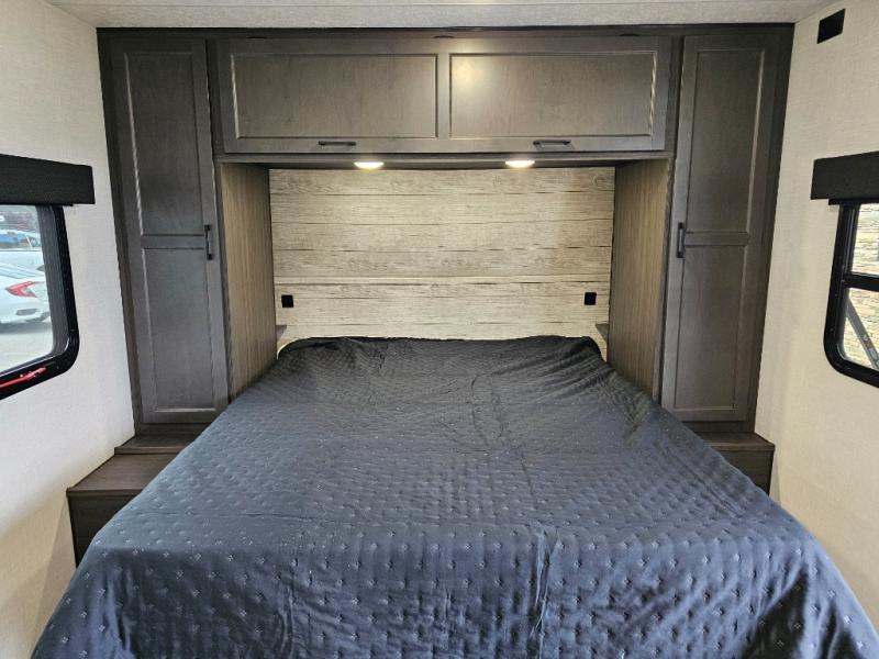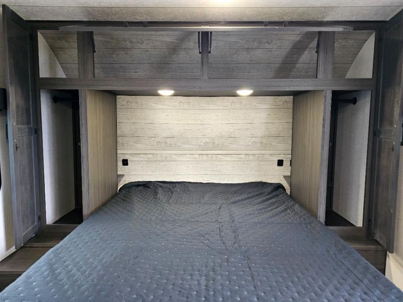 - Front Queen Bed: The front of the unit includes a queen bed with overhead cabinets and side shelves, keeping personal items organized and within reach.