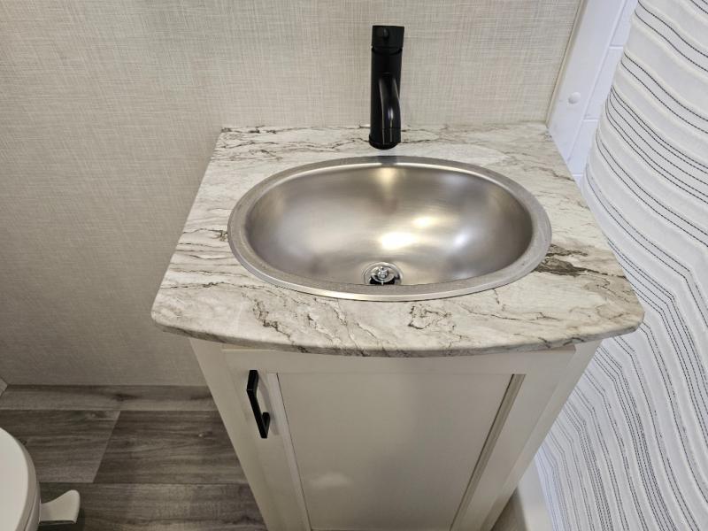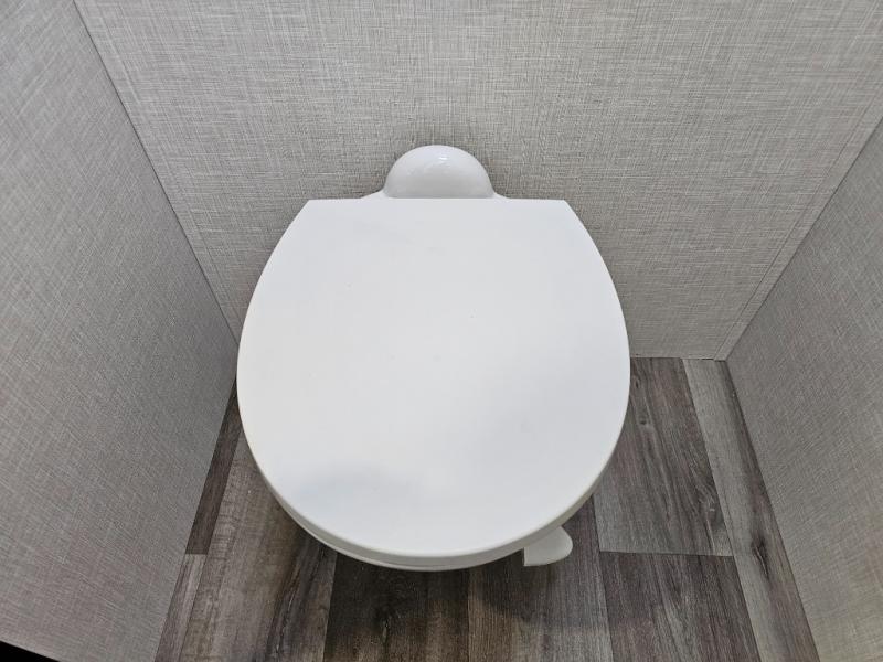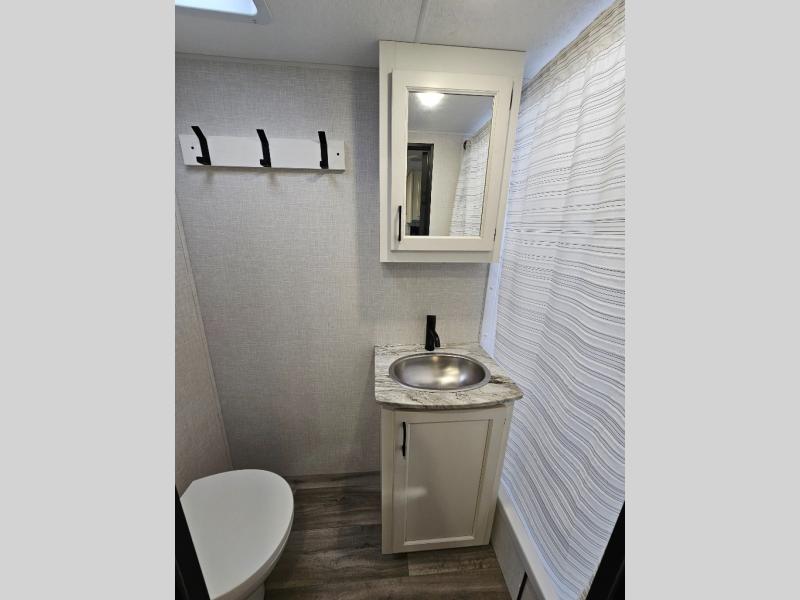 - Rear Corner Bathroom: The private bathroom includes a 30" x 36" shower, toilet, and vanity, providing comfort and convenience at the campground.