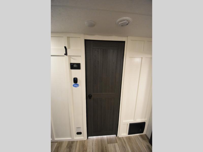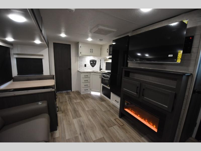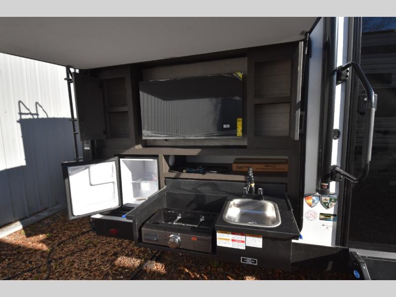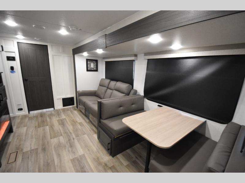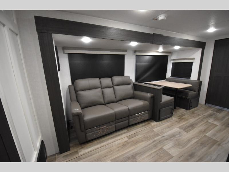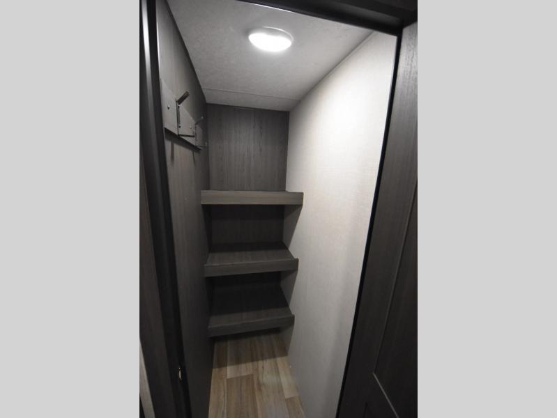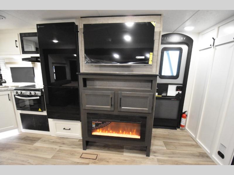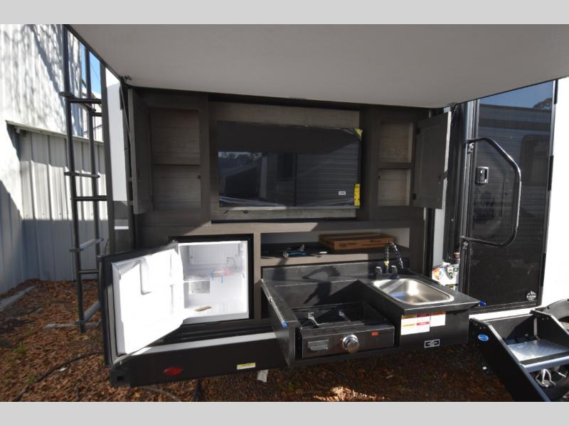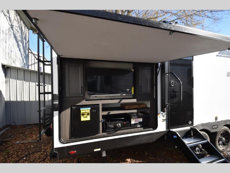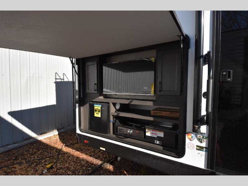 You're going to feel right at home in this Stratus single slide unit! There is not only a fully equipped kitchen with a three burner cooktop, but also an outside campfire café with a griddle, refrigerator, sink, and even an exterior 40" TV for your entertainment. As you enter the unit, you will notice to the right a walk-in pantry with coat hooks, and to the left is the full rear bathroom with a 30" x 36" shower, a three door linen closet, and a cabinet prepped to add an optional washer and dryer. If mother nature rains on your parade then relax inside on either the 70" sofa or the sit n' slide table dinette across from the entertainment center.