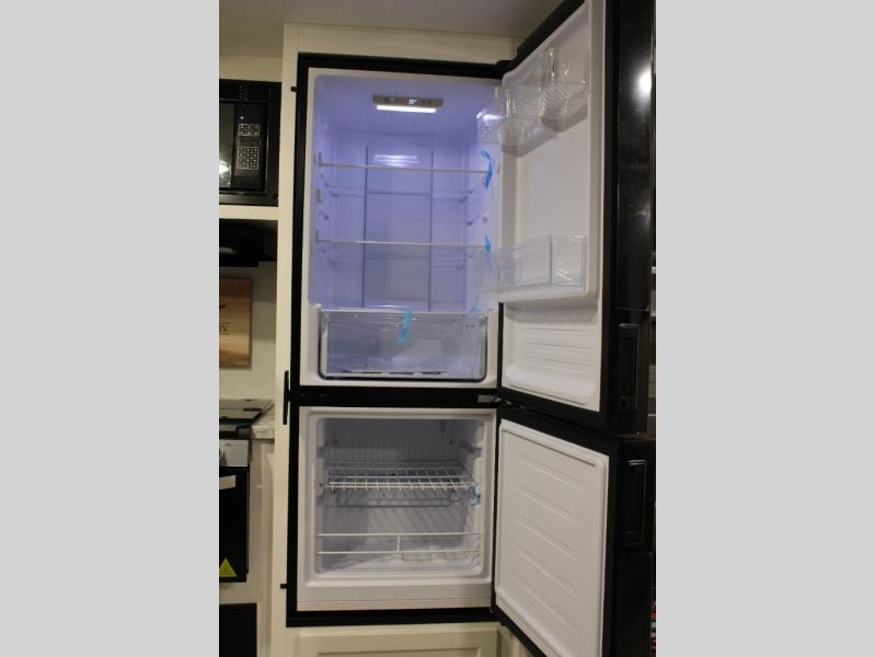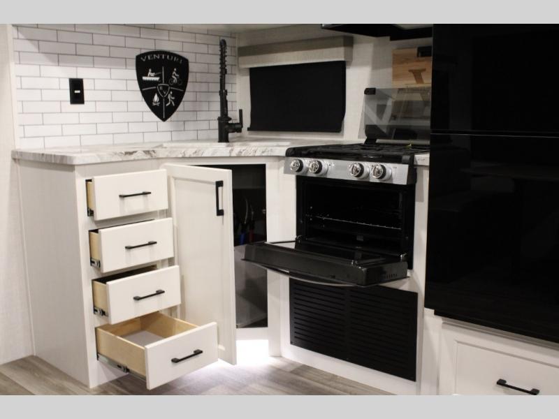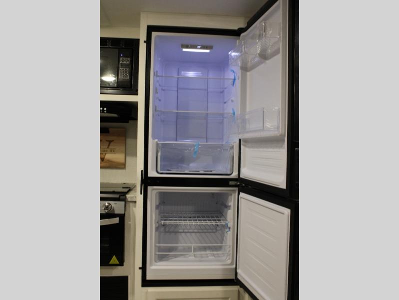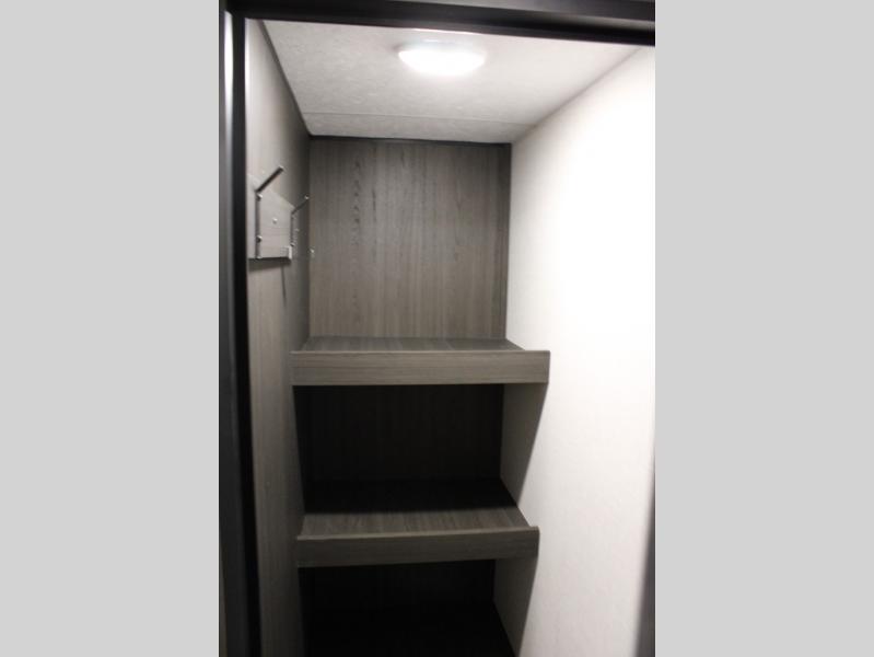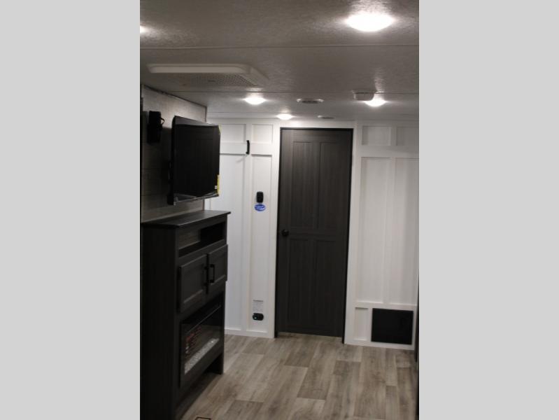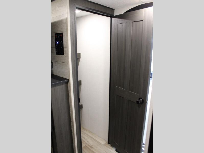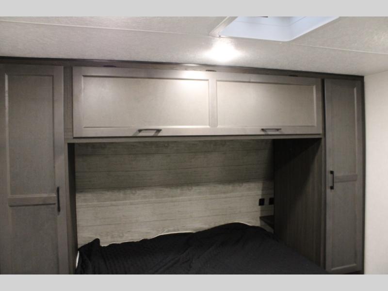 From the moment you step inside the 261VRB, you’ll feel like you’ve brought home with you. To your right, a walk-in pantry with coat hooks makes storing groceries, gear, and jackets effortless. Straight ahead, the fully equipped kitchen includes a three-burner cooktop, spacious countertops, and modern cabinetry for cooking indoors.