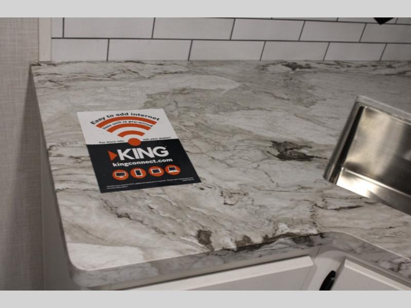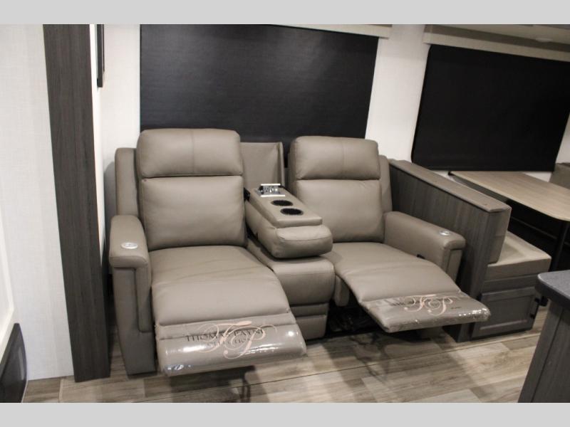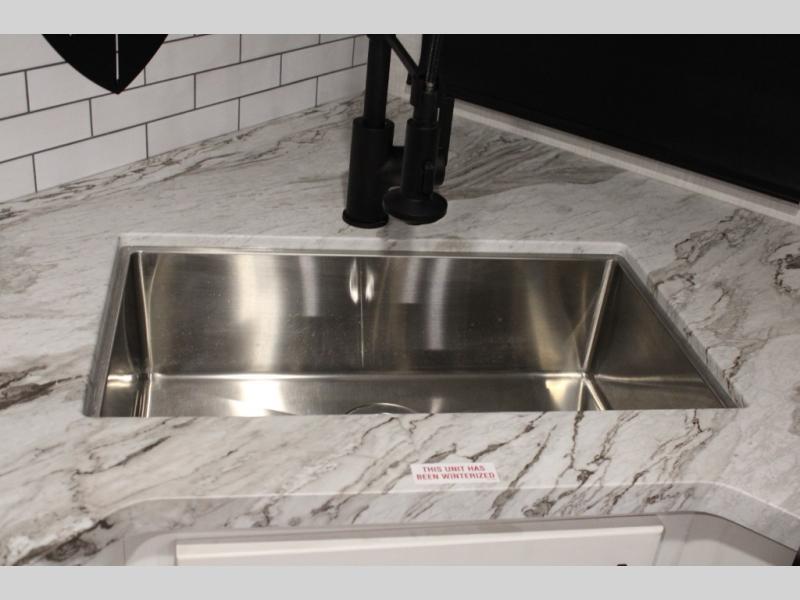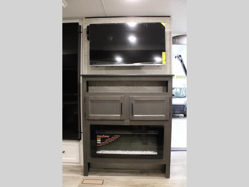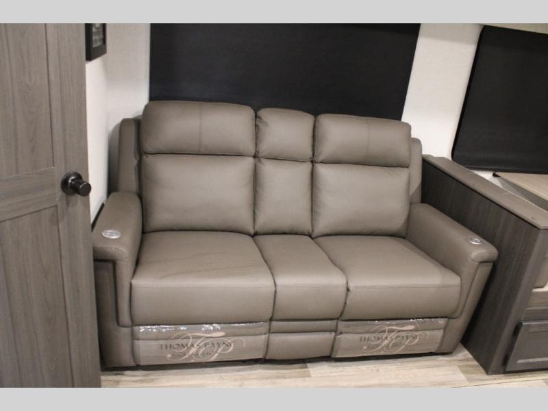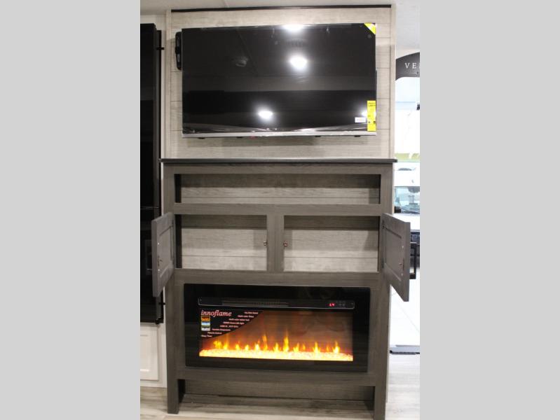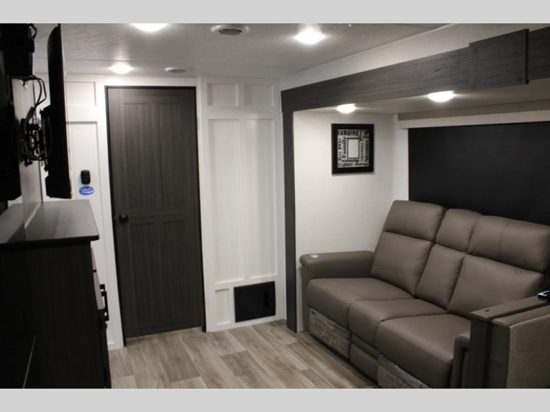 When the weather doesn’t cooperate, the interior offers all the cozy comforts you need. Relax on the 70" sofa or gather around the Sit N’ Slide dinette table, perfectly positioned across from the entertainment center for movie nights or rainy-day lounging.