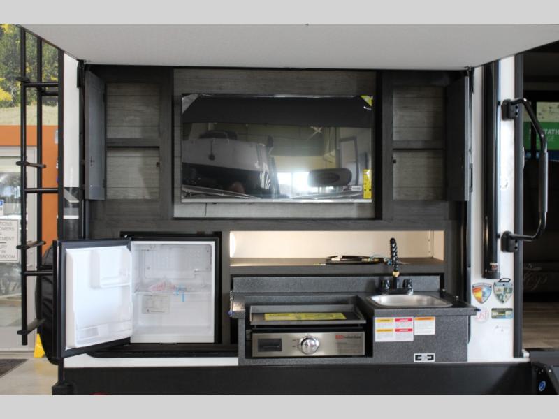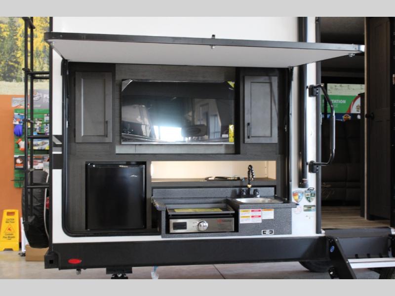 Outdoor kitchen with exterior entertainment for the ultimate campsite setup