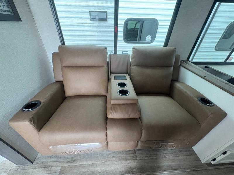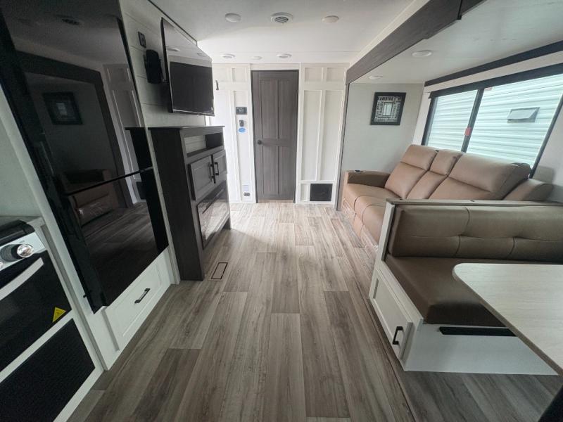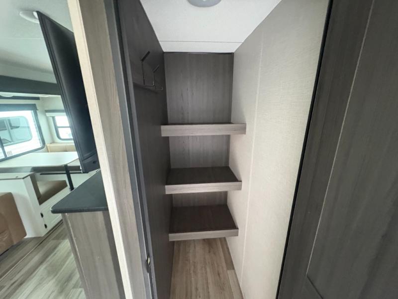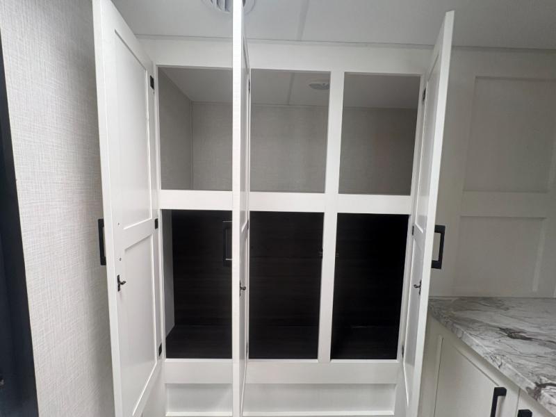 You're going to feel right at home in this Stratus single slide unit! There is not only a fully equipped kitchen with a three burner cooktop, but also an outside campfire café with a griddle, refrigerator, sink, and even an exterior 40" TV for your entertainment. As you enter the unit, you will notice to the right a walk-in pantry with coat hooks, and to the left is the full rear bathroom with a 30" x 36" shower, a three door linen closet, and a cabinet prepped to add an optional washer and dryer. If mother nature rains on your parade then relax inside on either the 70" sofa or the sit n' slide table dinette across from the entertainment center.