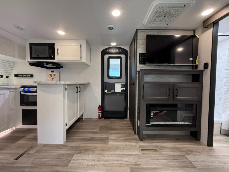 The 2025 Venture RV Stratus SR262VFK offers a unique front kitchen layout, a spacious walkthrough bathroom, and a cozy rear bedroom, perfect for couples or small families seeking style and function in every space. With a bed slide for added room, dual entry doors, a walk-in pantry, and an on-demand tankless water heater, this travel trailer is well-equipped for every adventure!