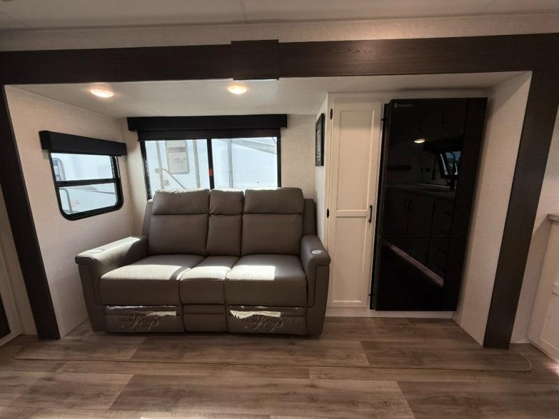 - Private Rear Bedroom: Relax in the private rear bedroom featuring a slide-out bed, providing additional floor space and a cozy atmosphere.