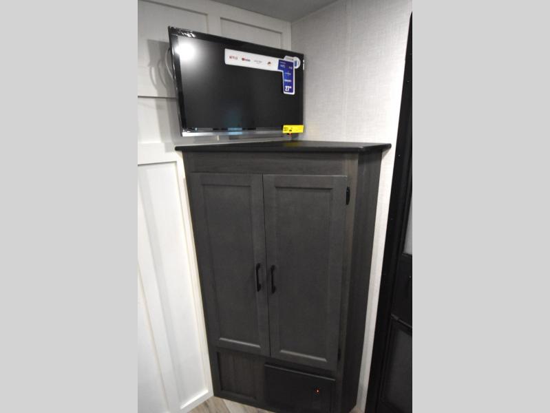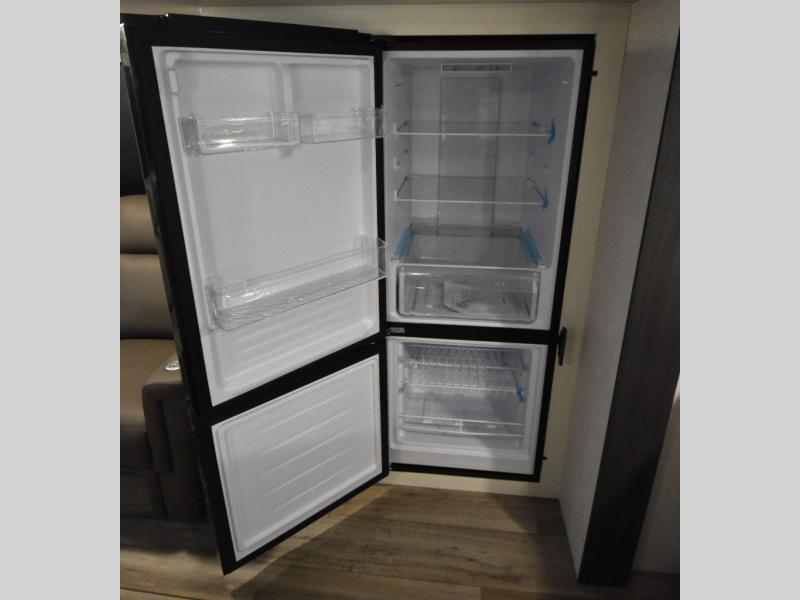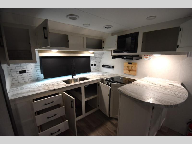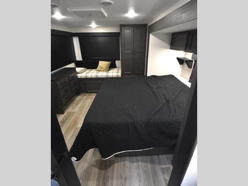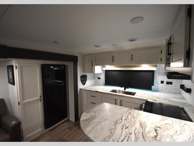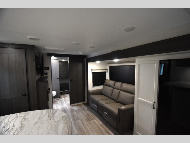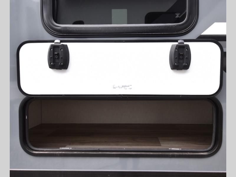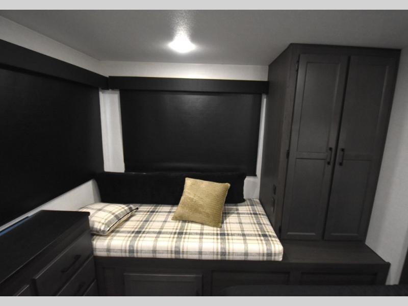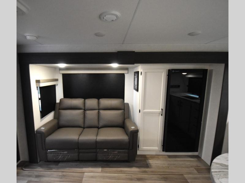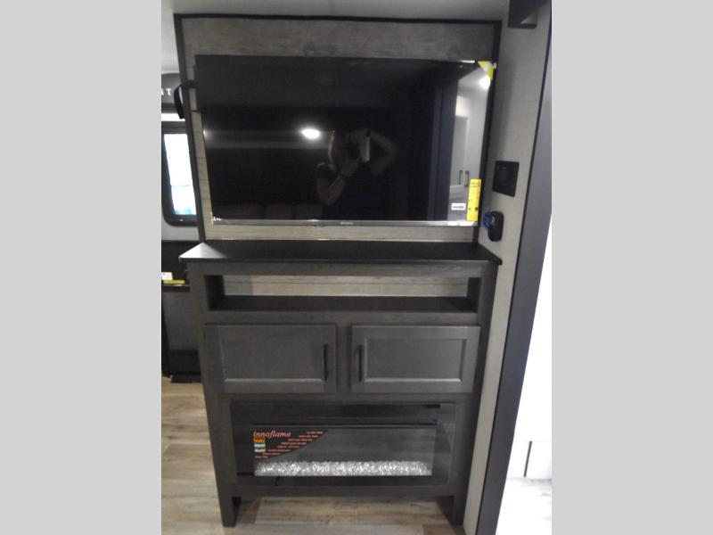This travel trailer is special for two. Sleep tight in the bedroom on the 60" x 80" queen bed also, store your belongings inside the dresser, and closet, this last one has a bench with sit for added comfort plus, delight yourself with the astonishing panoramic view window. Cook delicious dinner in the incredible spacious front kitchen. It includes stainless steel sink with cover and dish drying racks, three cooktop burner, refrigerator, pantry, bar with stools and an over head cabinet. In addition, experience a fun moment in the living room thanks to the 40" TV, theater sitting with USB ports on each side of it and fireplace for full coziness. Finally, take a relaxing bath in the walk thru bathroom furnished with a 30" x 36" shower.