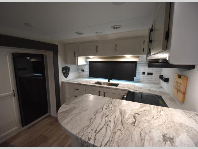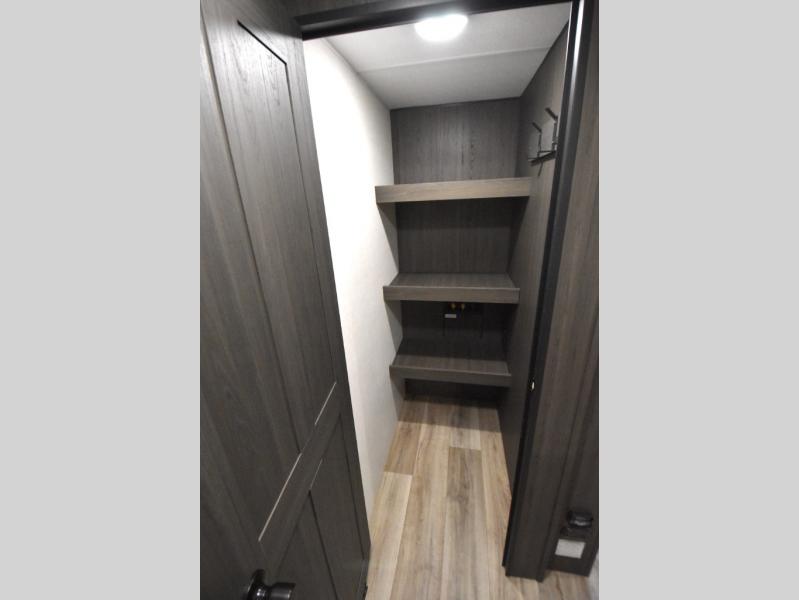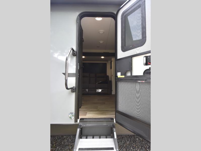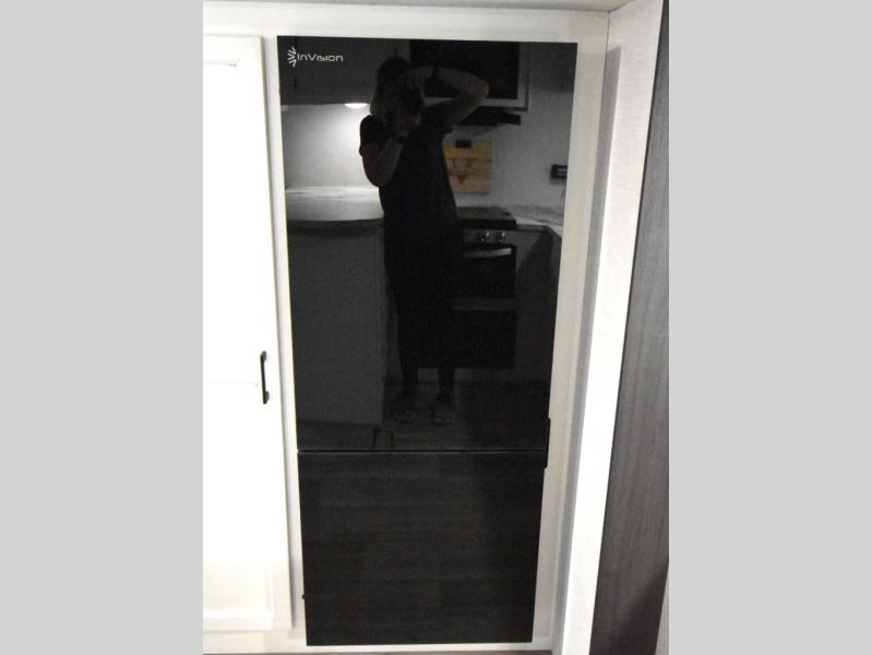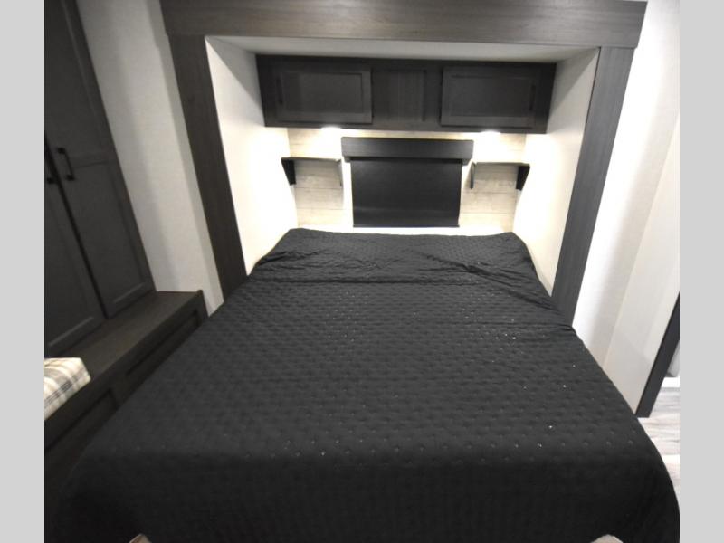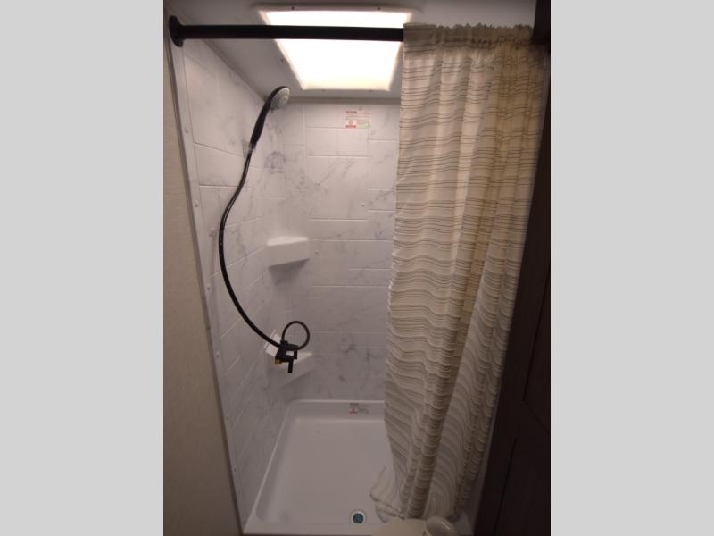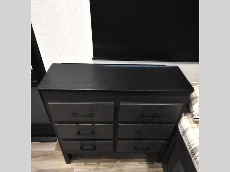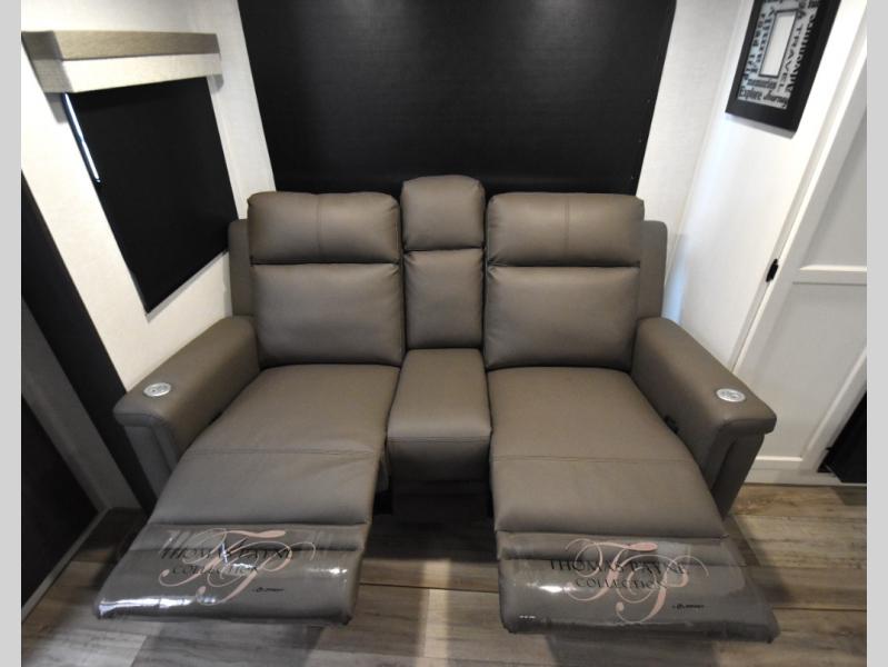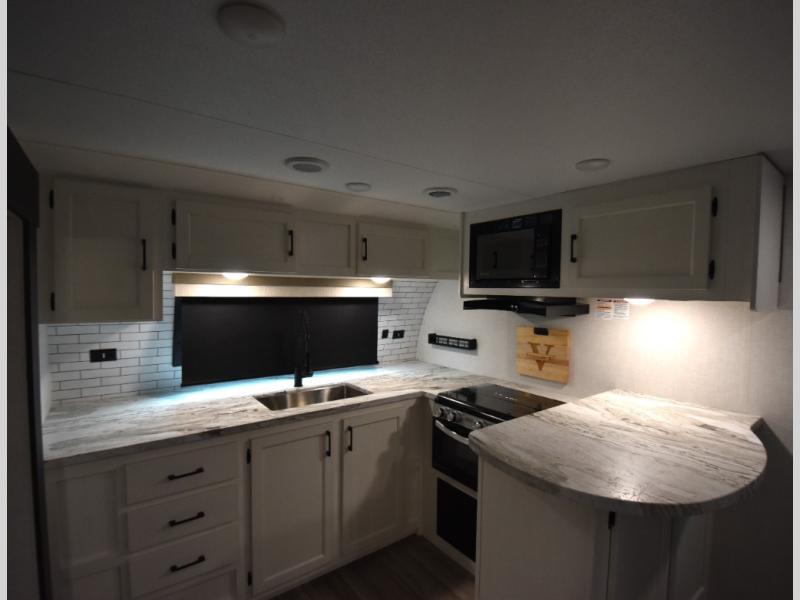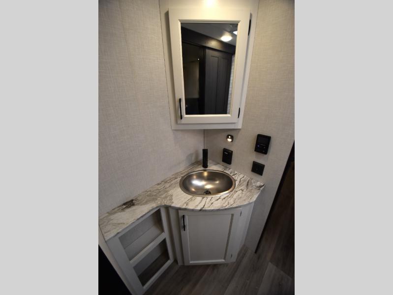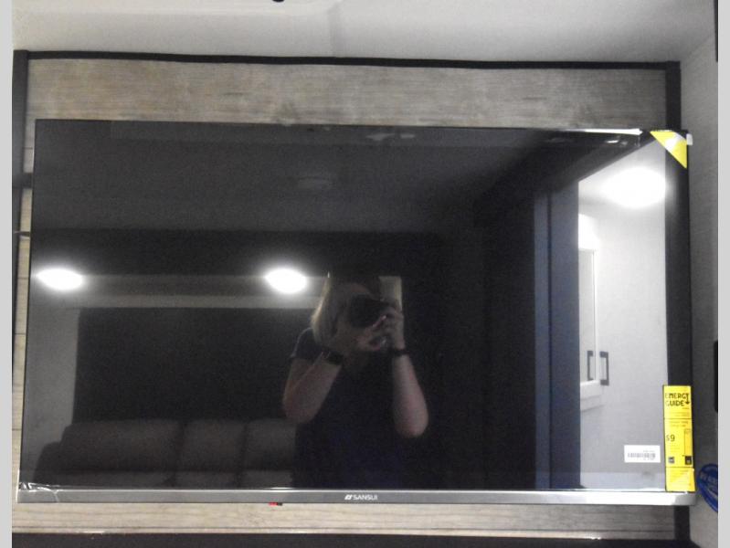 This travel trailer is special for two. Sleep tight in the bedroom on the 60" x 80" queen bed also, store your belongings inside the dresser, and closet, this last one has a bench with sit for added comfort plus, delight yourself with the astonishing panoramic view window. Cook delicious dinner in the incredible spacious front kitchen. It includes stainless steel sink with cover and dish drying racks, three cooktop burner, refrigerator, pantry, bar with stools and an over head cabinet. In addition, experience a fun moment in the living room thanks to the 40" TV, theater sitting with USB ports on each side of it and fireplace for full coziness. Finally, take a relaxing bath in the walk thru bathroom furnished with a 30" x 36" shower.