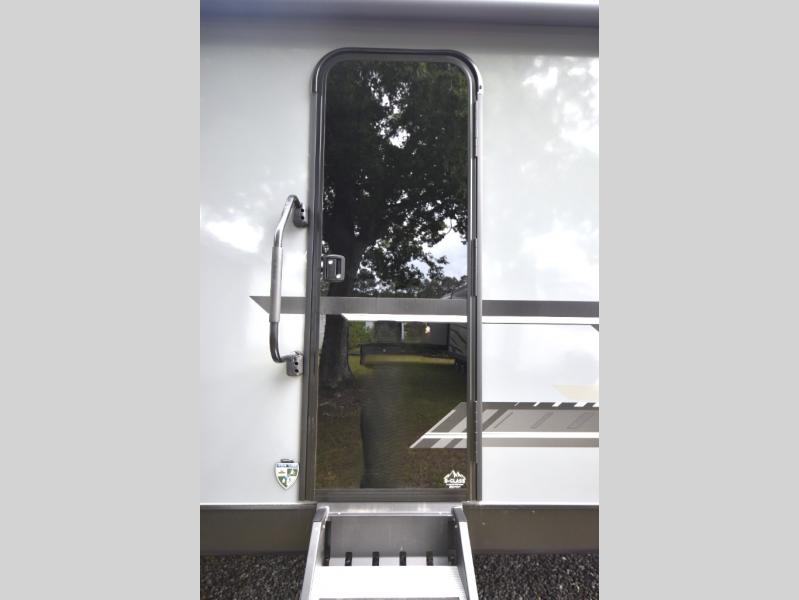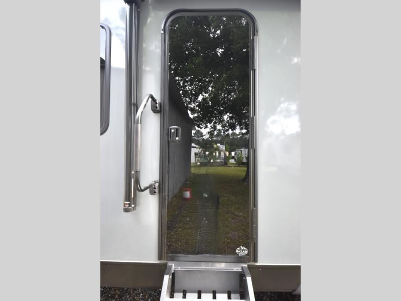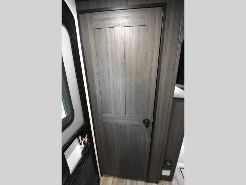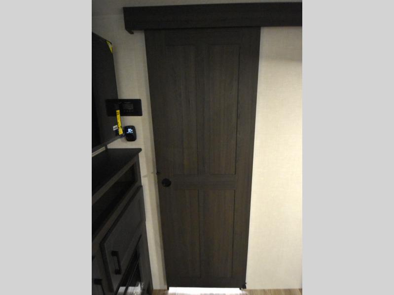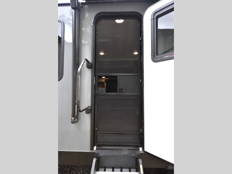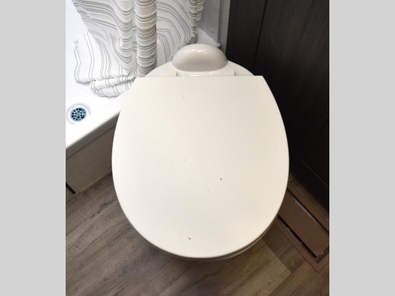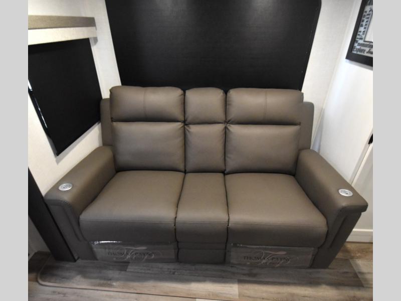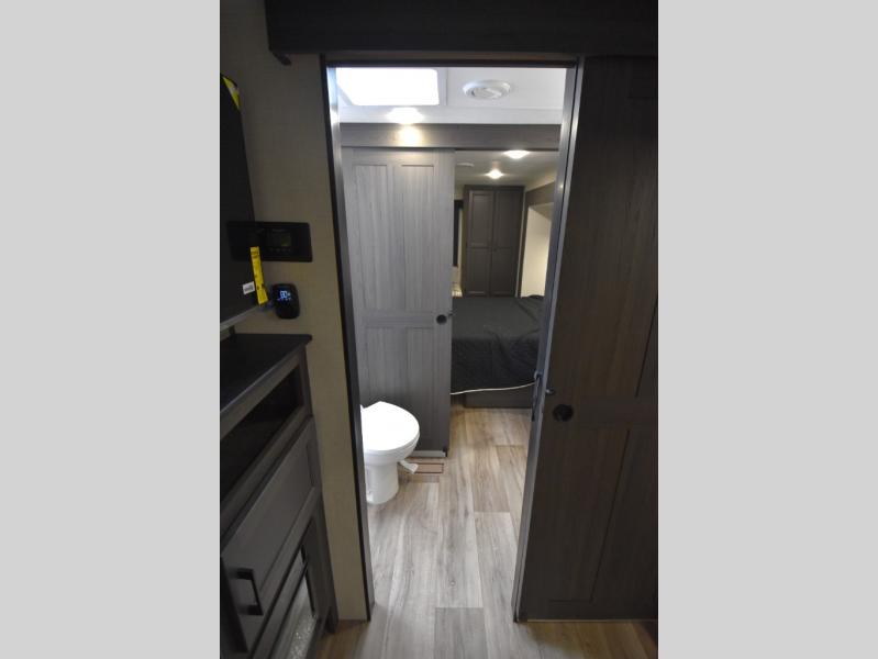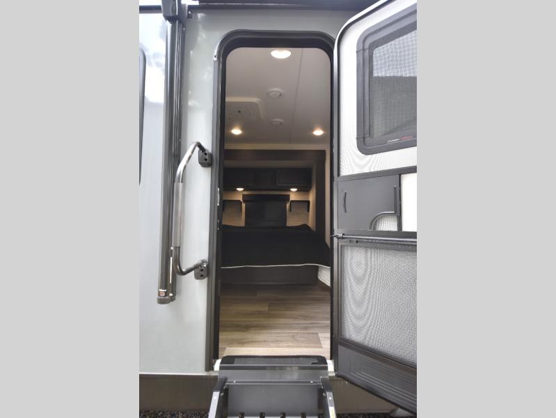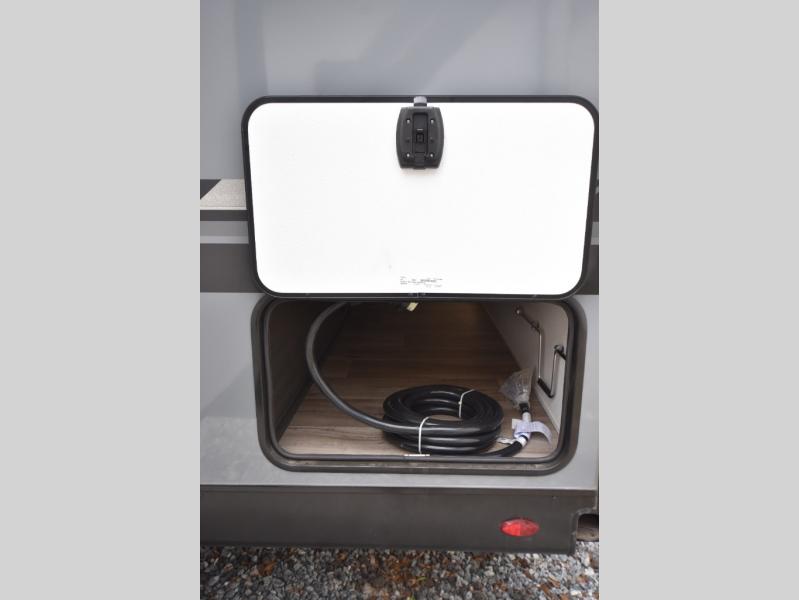 This travel trailer is special for two. Sleep tight in the bedroom on the 60" x 80" queen bed also, store your belongings inside the dresser, and closet, this last one has a bench with sit for added comfort plus, delight yourself with the astonishing panoramic view window. Cook delicious dinner in the incredible spacious front kitchen. It includes stainless steel sink with cover and dish drying racks, three cooktop burner, refrigerator, pantry, bar with stools and an over head cabinet. In addition, experience a fun moment in the living room thanks to the 40" TV, theater sitting with USB ports on each side of it and fireplace for full coziness. Finally, take a relaxing bath in the walk thru bathroom furnished with a 30" x 36" shower.