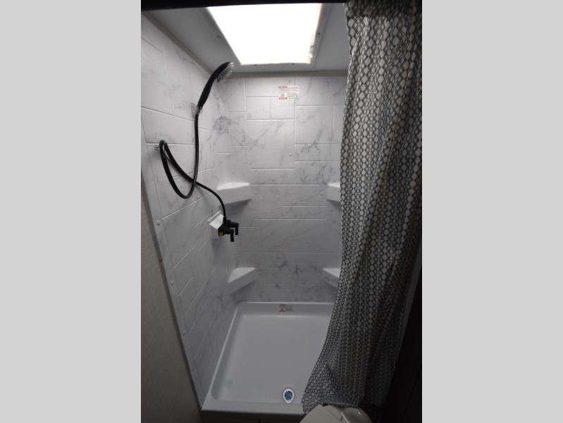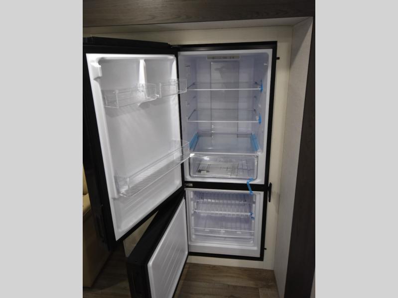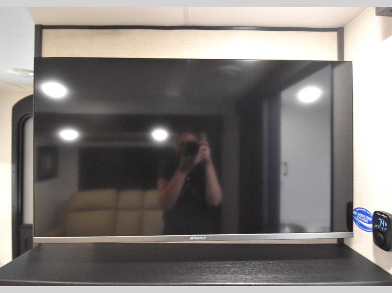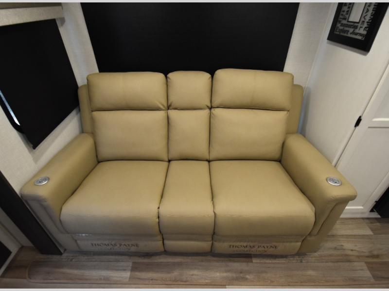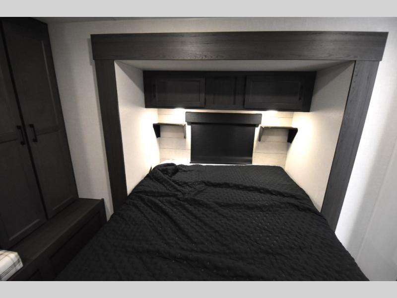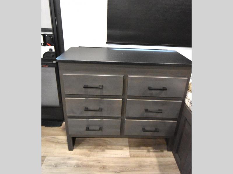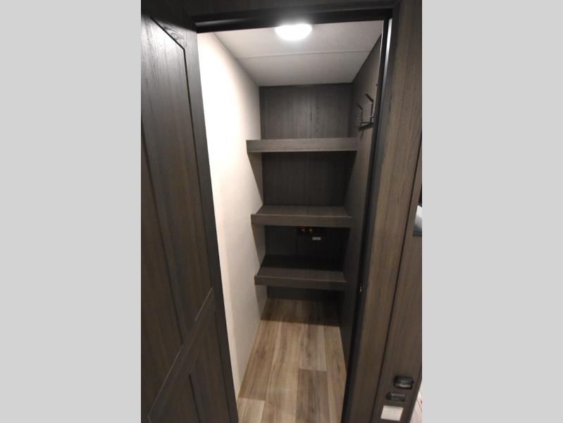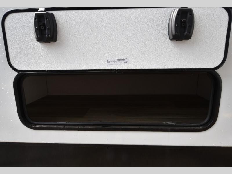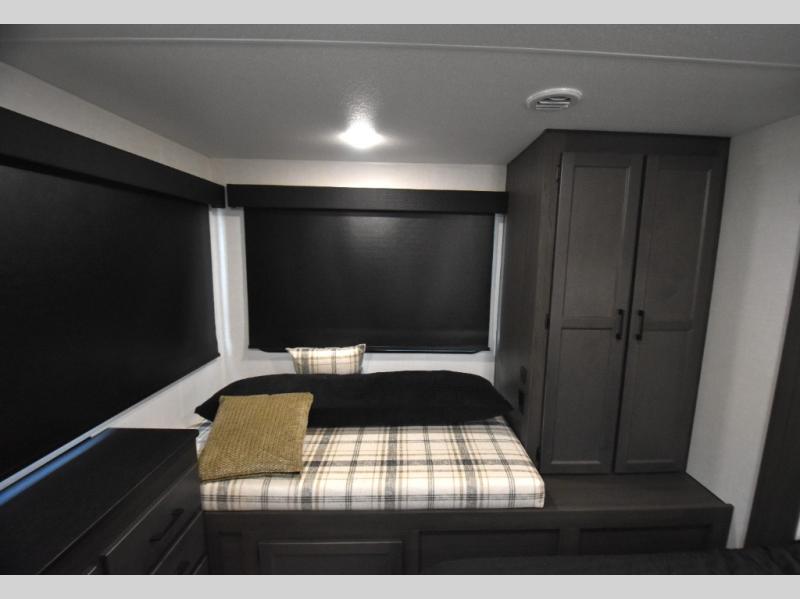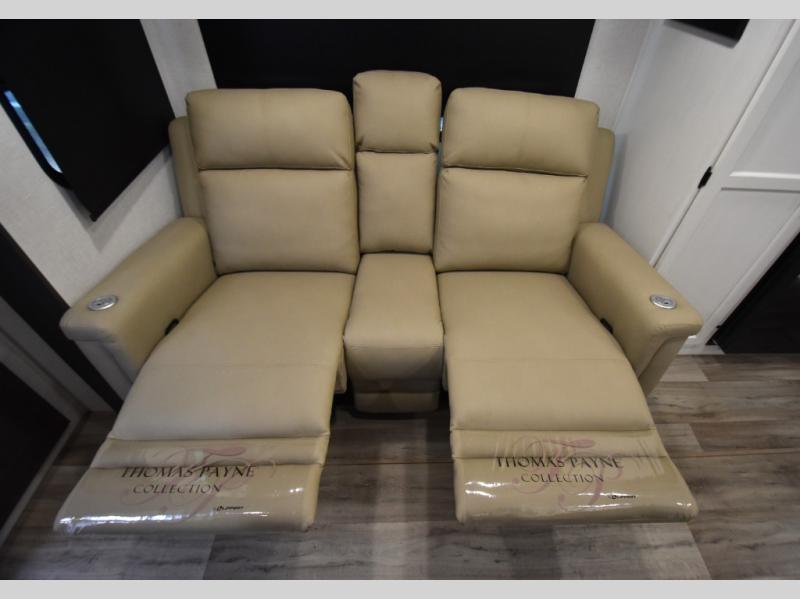 This travel trailer is special for two. Sleep tight in the bedroom on the 60" x 80" queen bed also, store your belongings inside the dresser, and closet, this last one has a bench with sit for added comfort plus, delight yourself with the astonishing panoramic view window. Cook delicious dinner in the incredible spacious front kitchen. It includes stainless steel sink with cover and dish drying racks, three cooktop burner, refrigerator, pantry, bar with stools and an over head cabinet. In addition, experience a fun moment in the living room thanks to the 40" TV, theater sitting with USB ports on each side of it and fireplace for full coziness. Finally, take a relaxing bath in the walk thru bathroom furnished with a 30" x 36" shower.