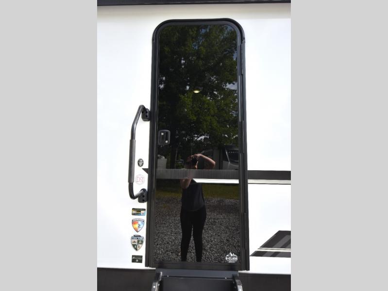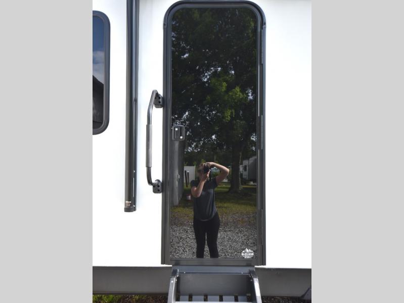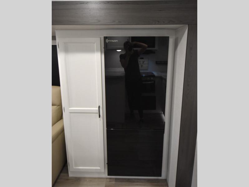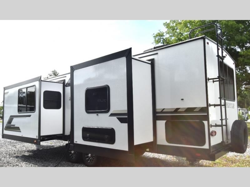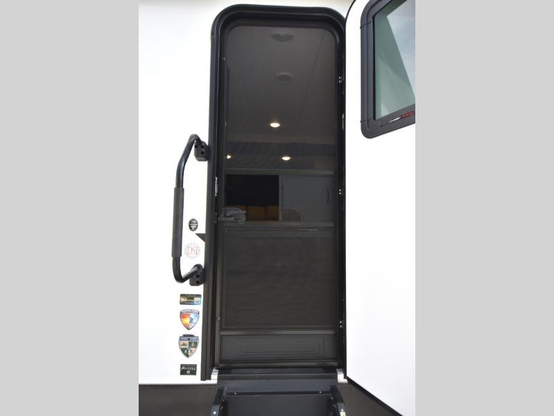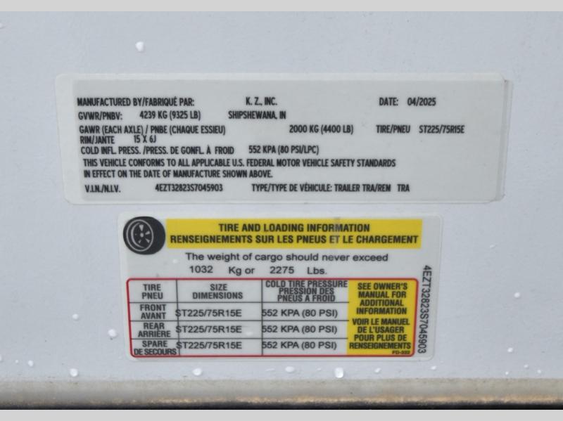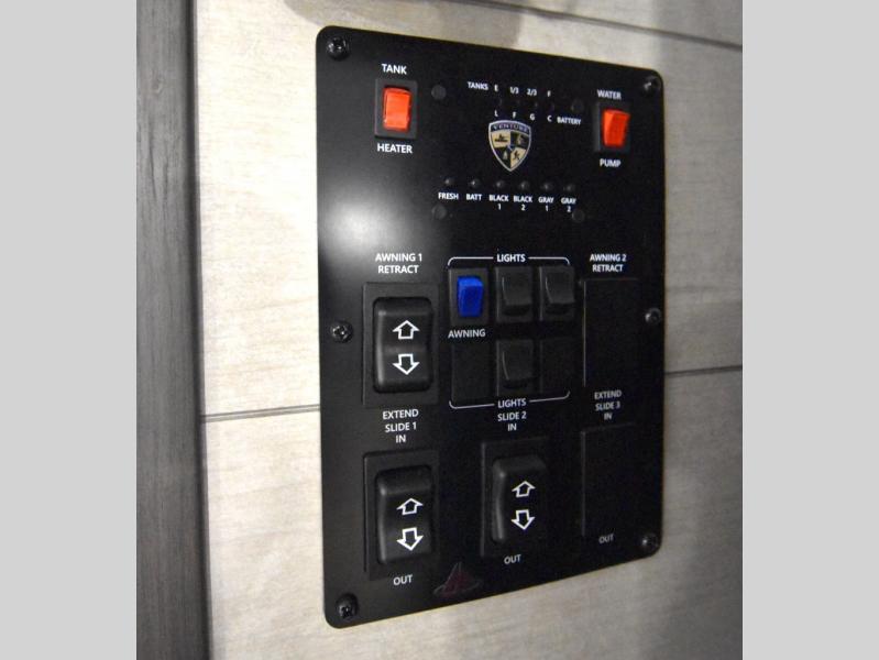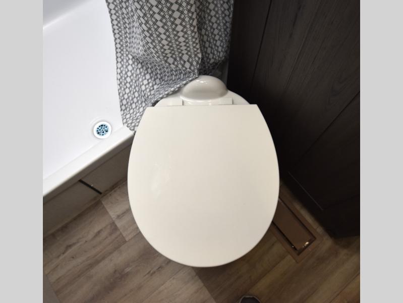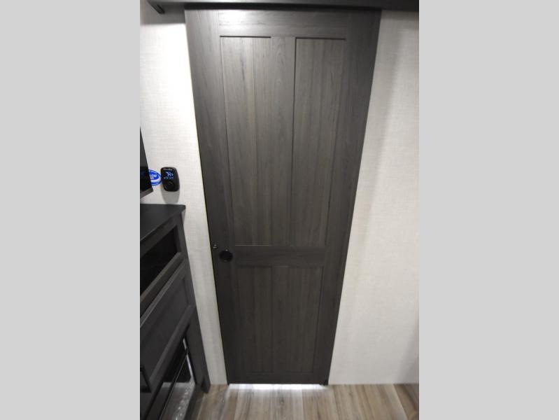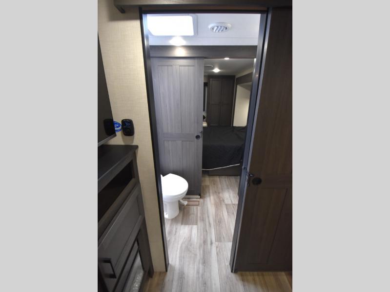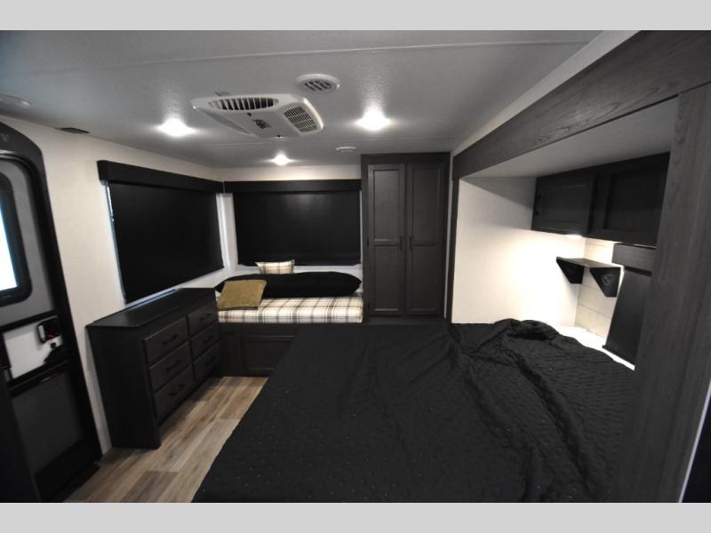 This travel trailer is special for two. Sleep tight in the bedroom on the 60" x 80" queen bed also, store your belongings inside the dresser, and closet, this last one has a bench with sit for added comfort plus, delight yourself with the astonishing panoramic view window. Cook delicious dinner in the incredible spacious front kitchen. It includes stainless steel sink with cover and dish drying racks, three cooktop burner, refrigerator, pantry, bar with stools and an over head cabinet. In addition, experience a fun moment in the living room thanks to the 40" TV, theater sitting with USB ports on each side of it and fireplace for full coziness. Finally, take a relaxing bath in the walk thru bathroom furnished with a 30" x 36" shower.