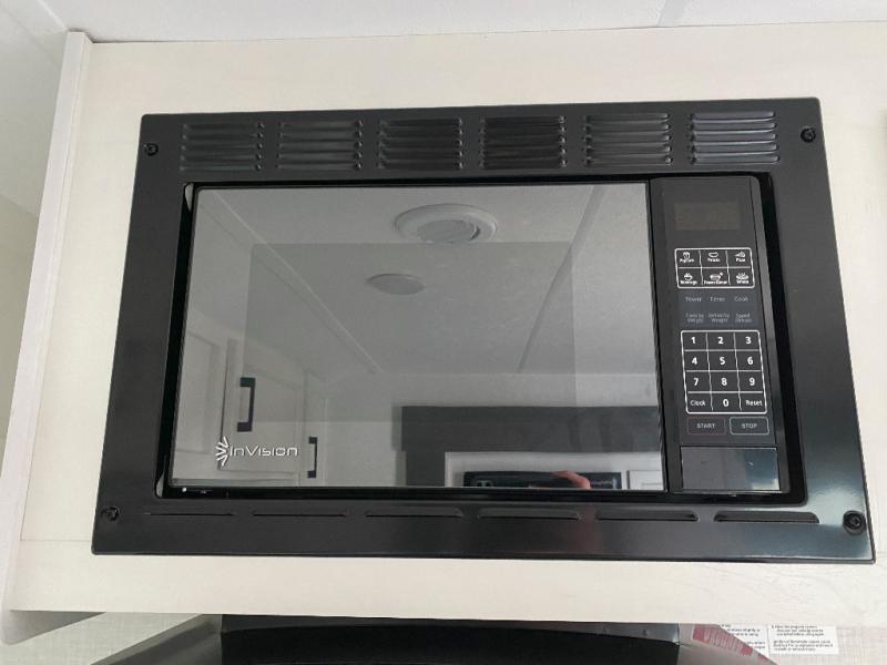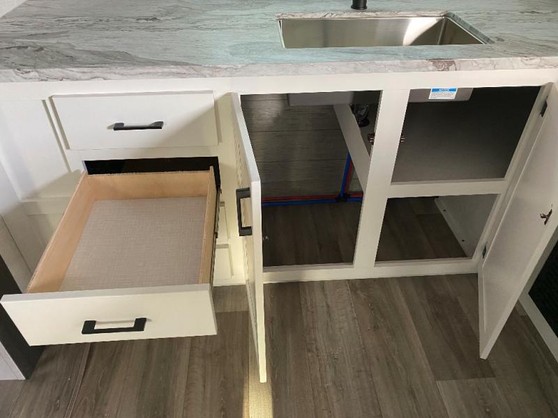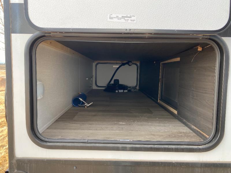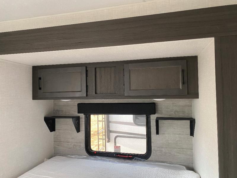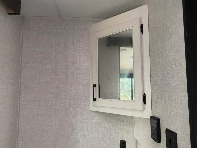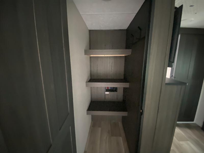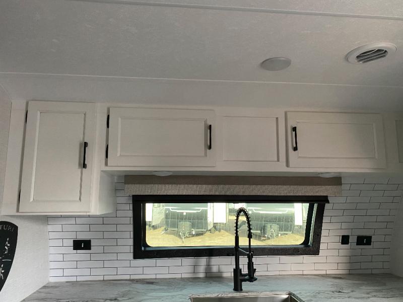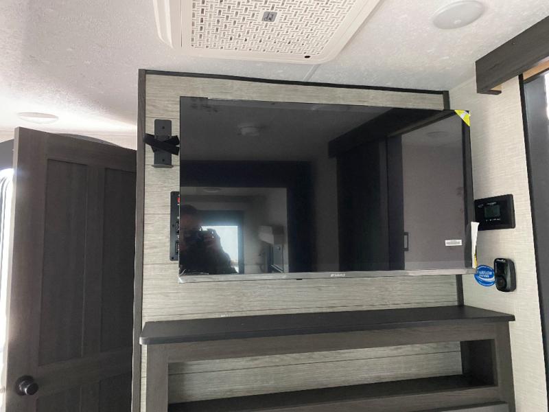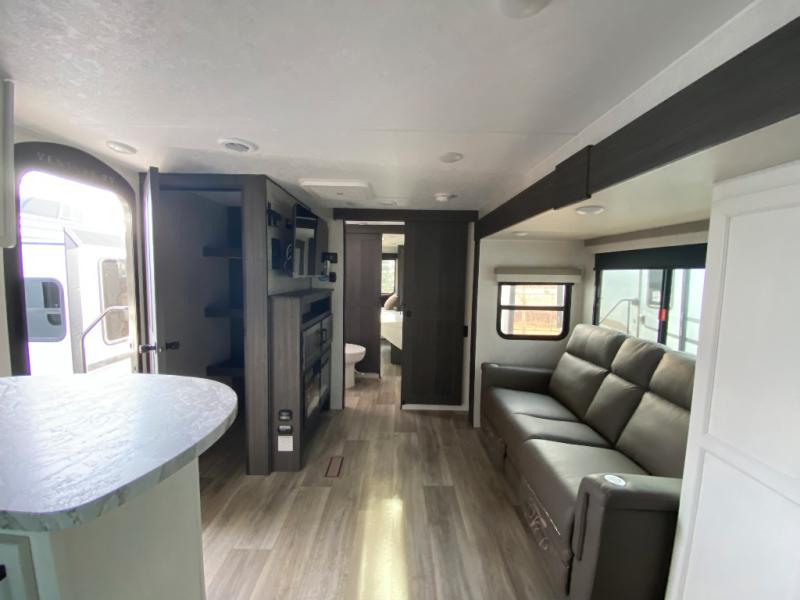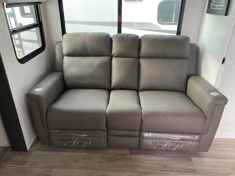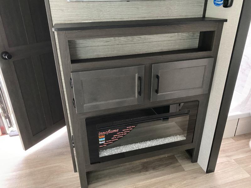 This travel trailer is special for two. Sleep tight in the bedroom on the 60" x 80" queen bed also, store your belongings inside the dresser, and closet, this last one has a bench with sit for added comfort plus, delight yourself with the astonishing panoramic view window. Cook delicious dinner in the incredible spacious front kitchen. It includes stainless steel sink with cover and dish drying racks, three cooktop burner, refrigerator, pantry, bar with stools and an over head cabinet. In addition, experience a fun moment in the living room thanks to the 40" TV, theater sitting with USB ports on each side of it and fireplace for full coziness. Finally, take a relaxing bath in the walk thru bathroom furnished with a 30" x 36" shower.
