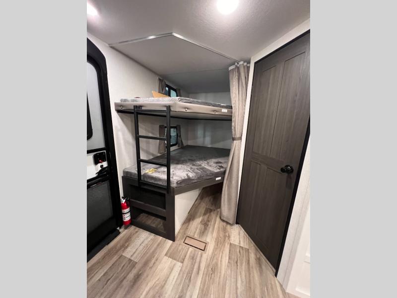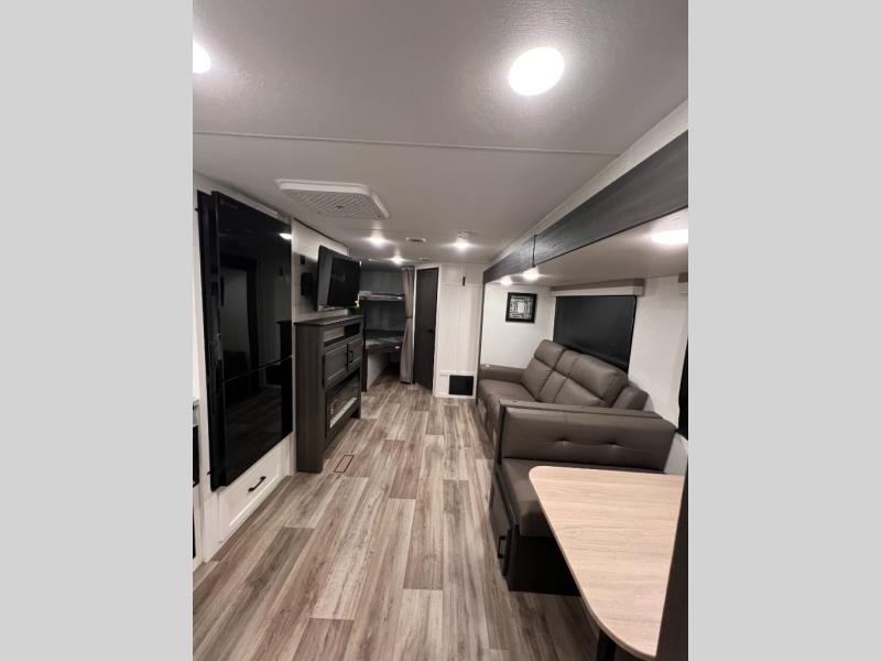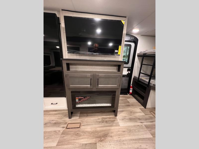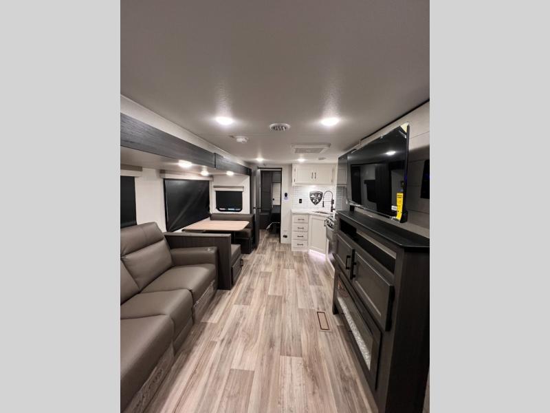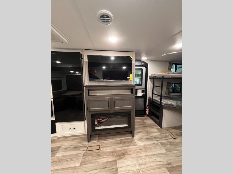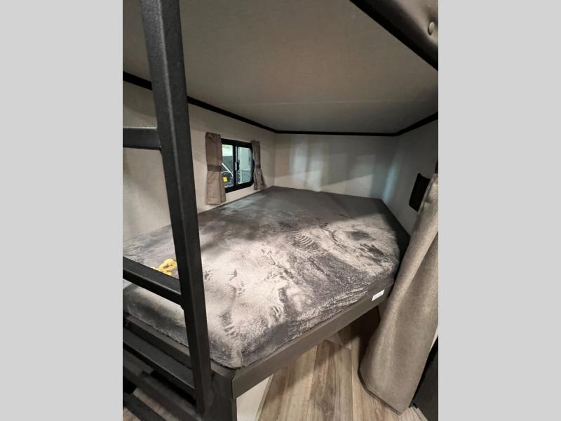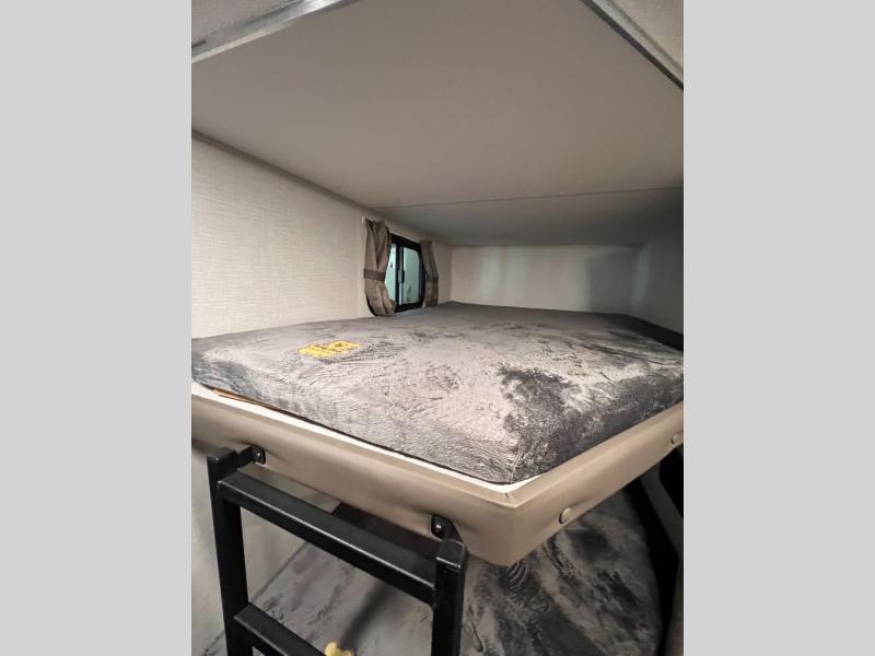 This feature-packed model offers a smart layout with double-over-double bunks, a private front bedroom, and a spacious slide-out living area, giving everyone room to spread out and relax. The modern interior design, LED lighting, and panoramic windows create an open, inviting atmosphere that feels like home on the road.