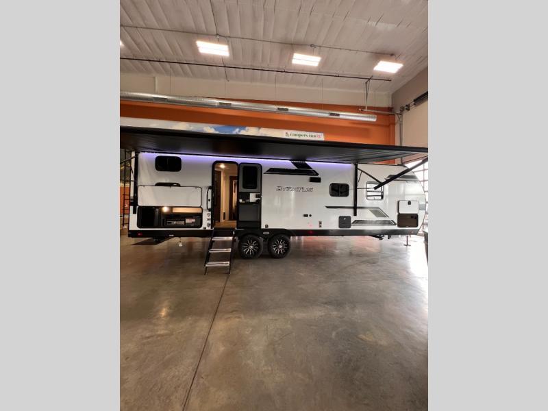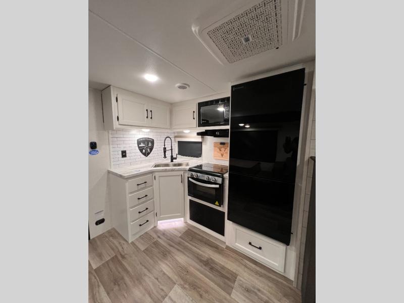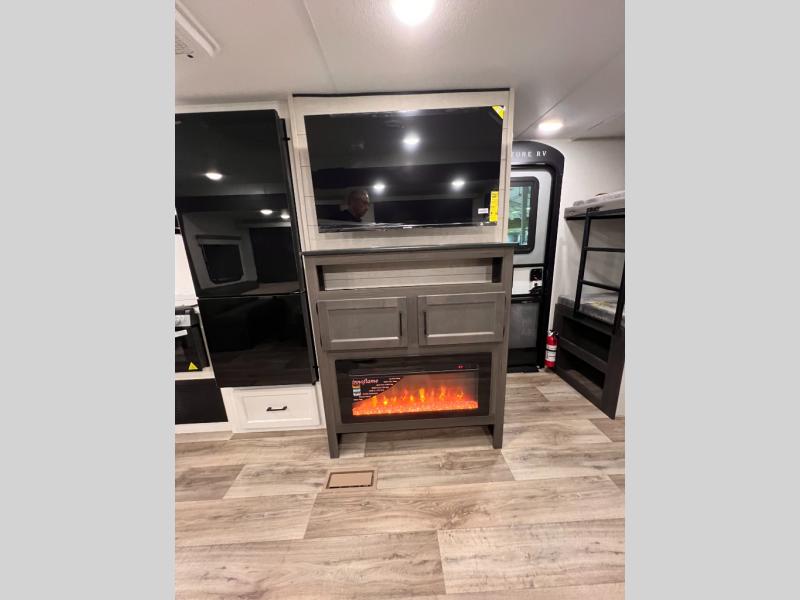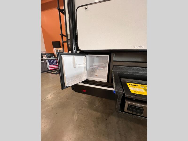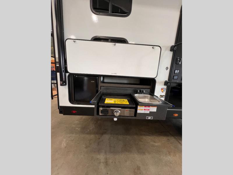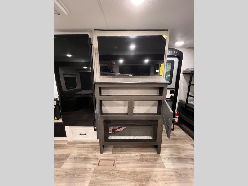 The fully equipped kitchen includes solid-surface countertops, a stainless-steel refrigerator, and deep basin sink, making meal prep easy whether you're at the campsite or boondocking. And when the day winds down, you can enjoy movie night on the entertainment center with a fireplace, or kick back under the power awning with LED lighting for the ultimate evening unwind.