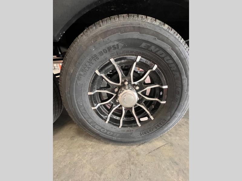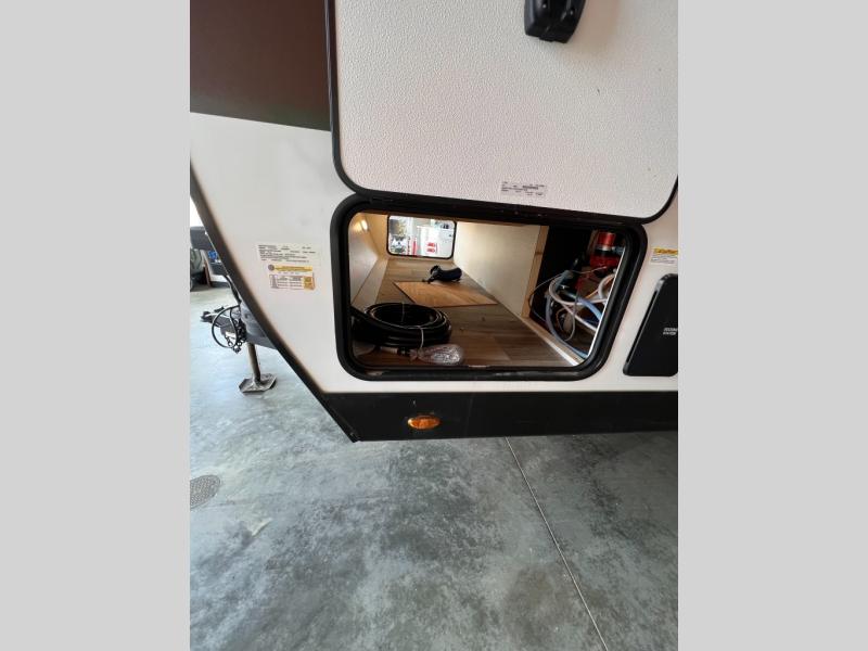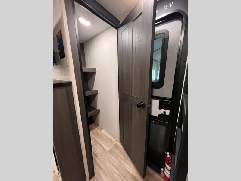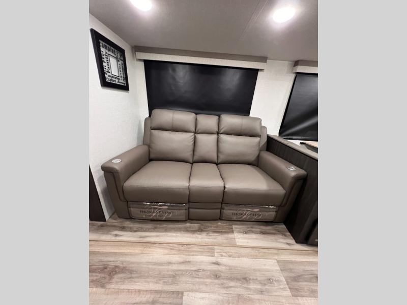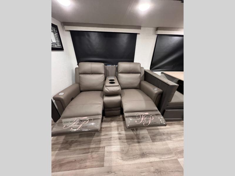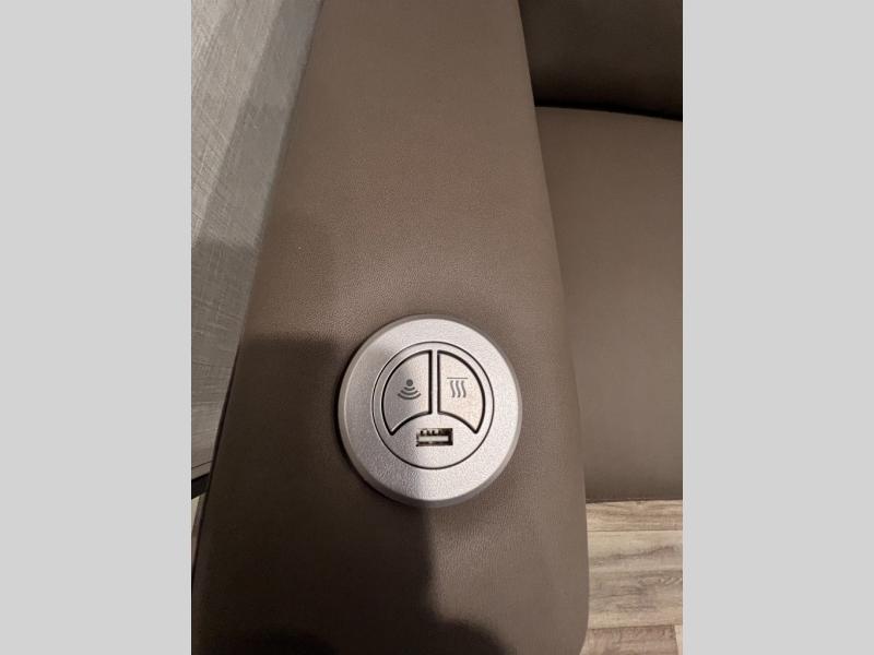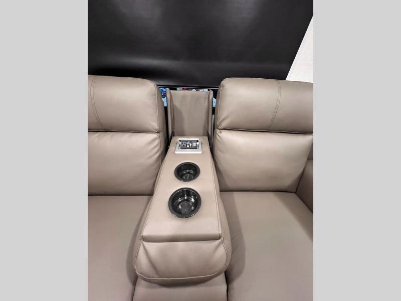 The fully equipped kitchen includes solid-surface countertops, a stainless-steel refrigerator, and deep basin sink, making meal prep easy whether you're at the campsite or boondocking. And when the day winds down, you can enjoy movie night on the entertainment center with a fireplace, or kick back under the power awning with LED lighting for the ultimate evening unwind.