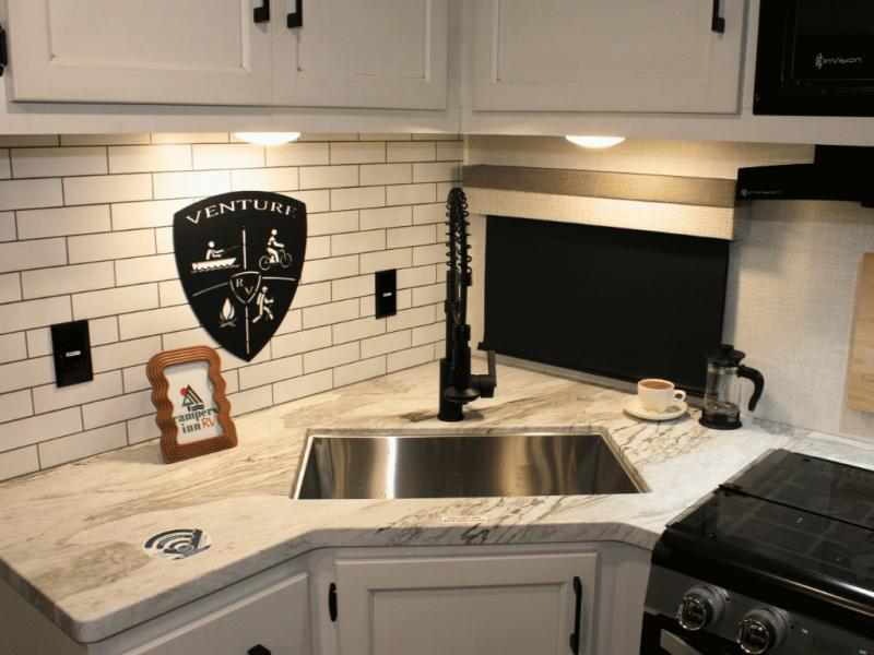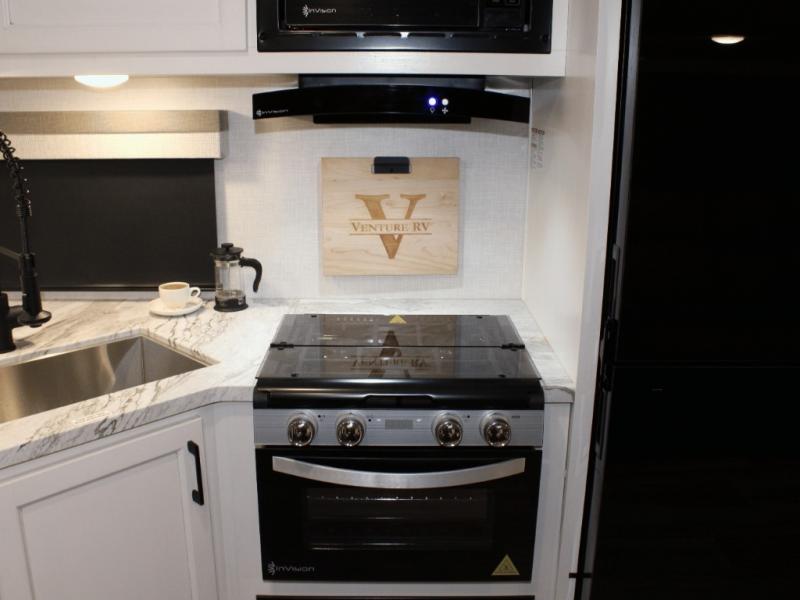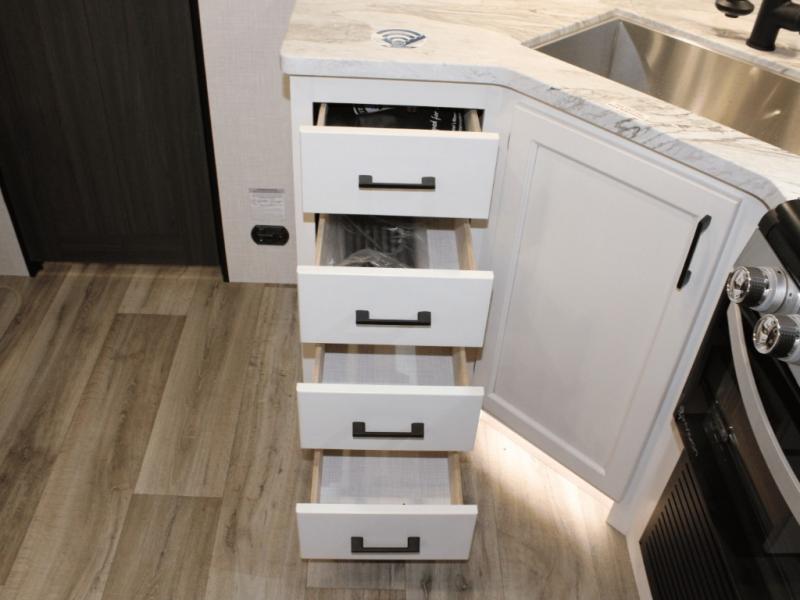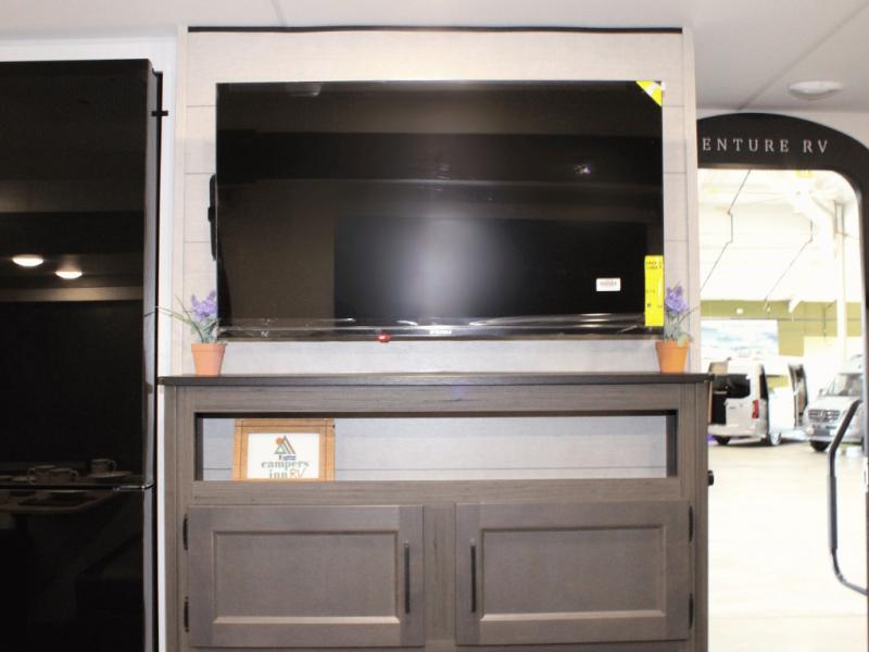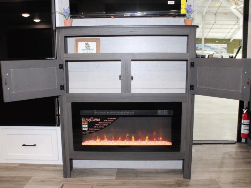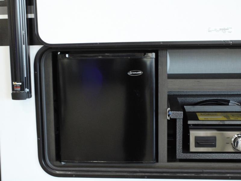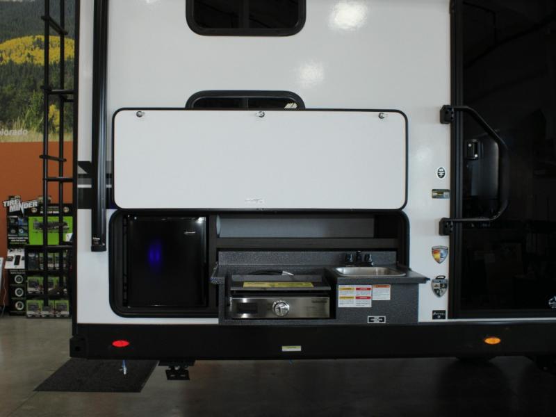 Cooking is always a pleasure with the fully equipped interior kitchen, but the real highlight is the outdoor Campfire Café. Fire up the griddle, keep cold drinks in the refrigerator, and wash up in the built-in sink—all without stepping inside. It's the ultimate setup for campsite breakfasts, BBQ dinners, and everything in between.