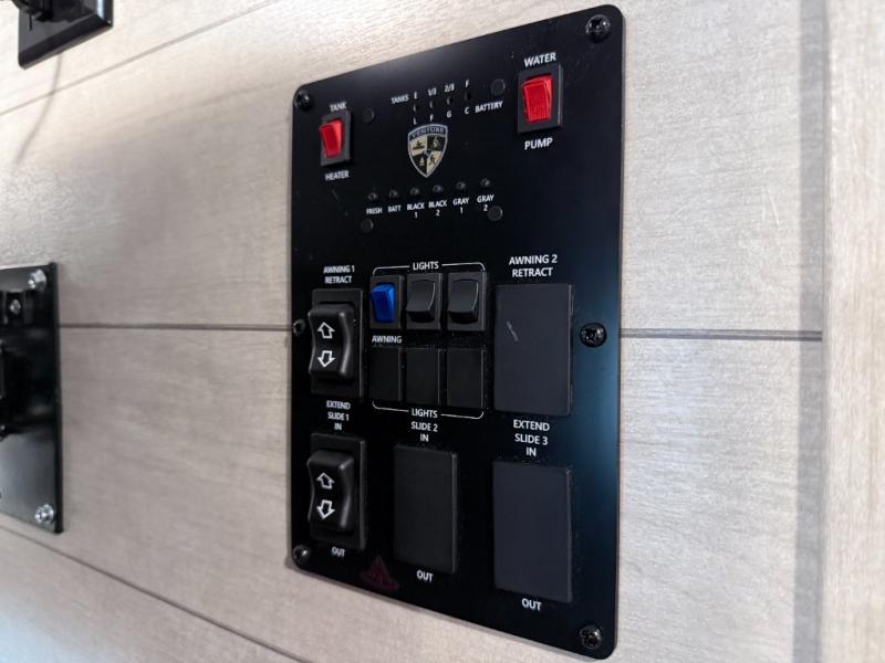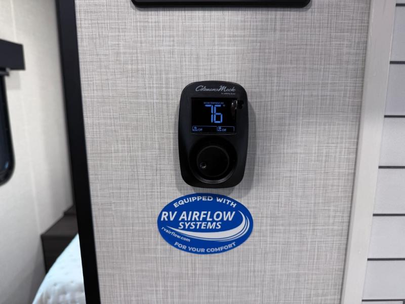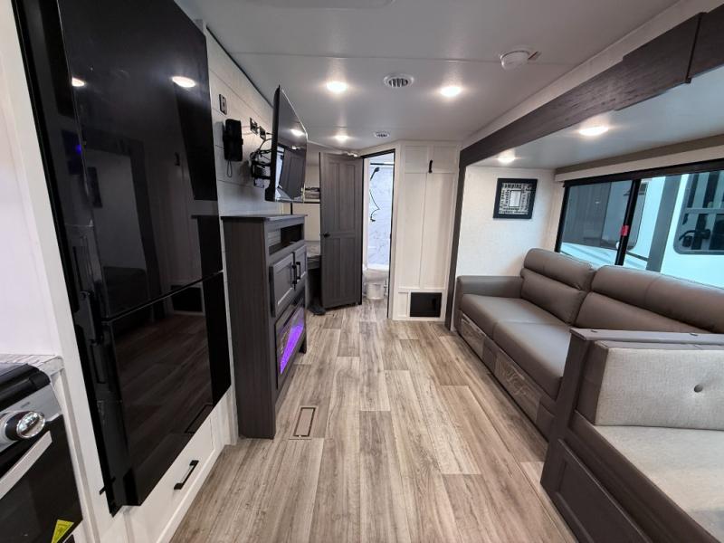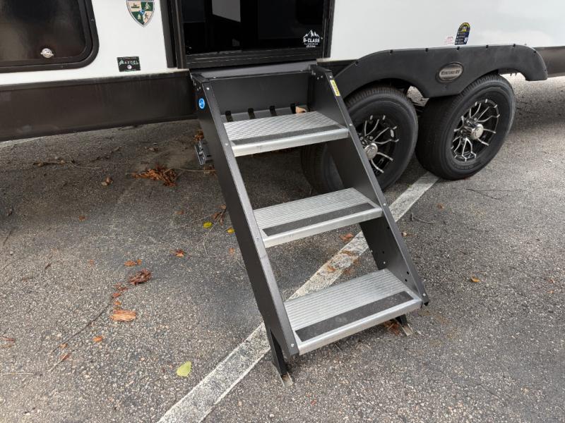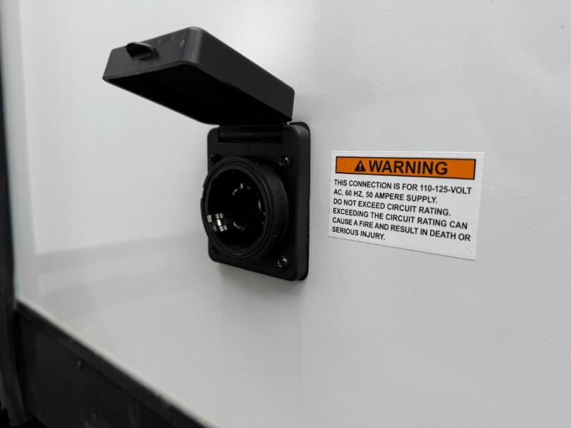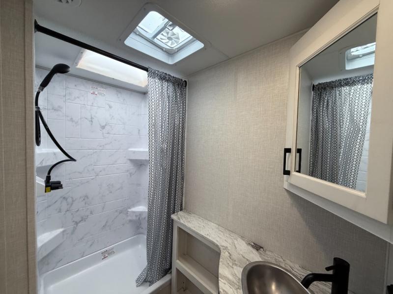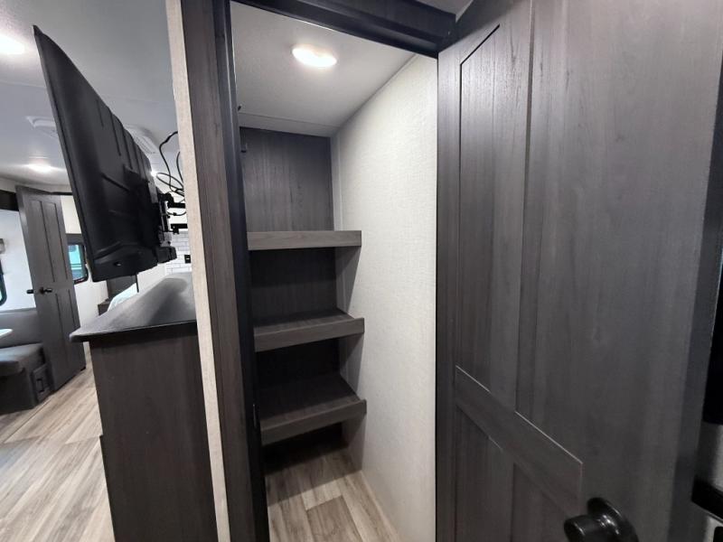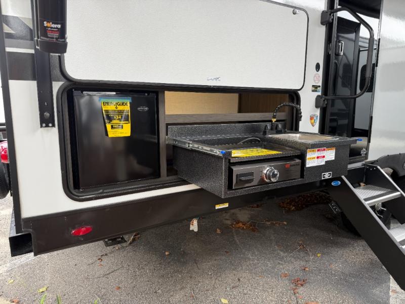 The rear corner bathroom includes a roomy 30" x 36" shower for easy cleanups after a day outdoors. Behind the entertainment center, you’ll find a walk-in pantry with coat hooks for jackets and plenty of space for groceries. The outside Campfire Café is equipped with a griddle, refrigerator, and sink, perfect for open-air cooking and quick meals.