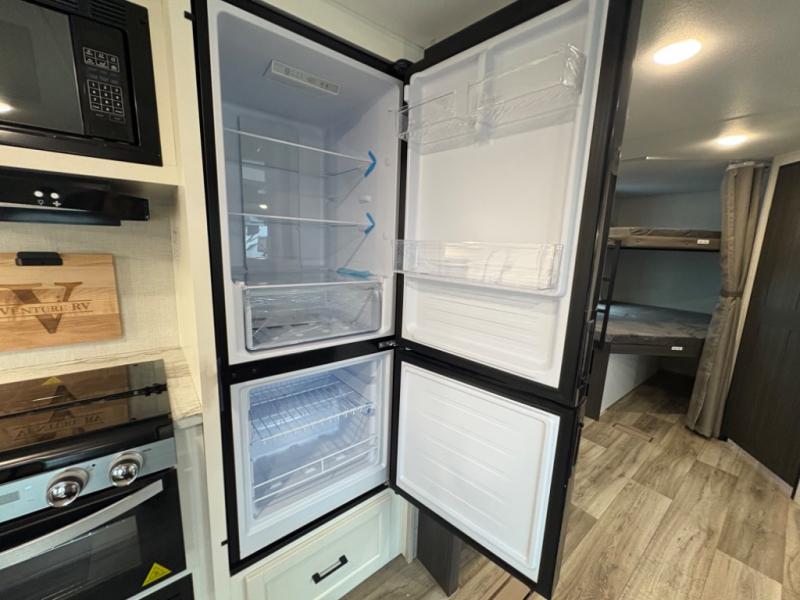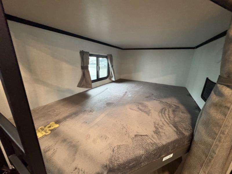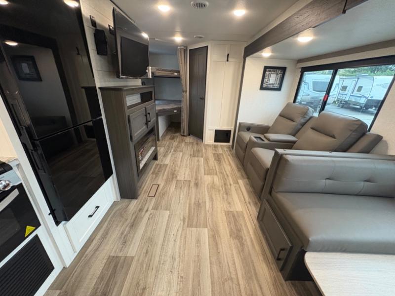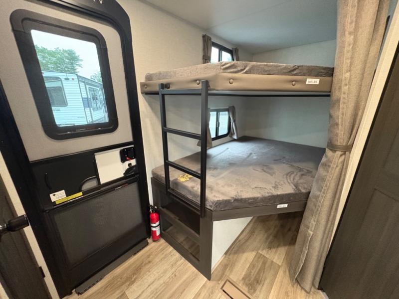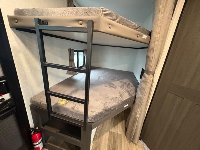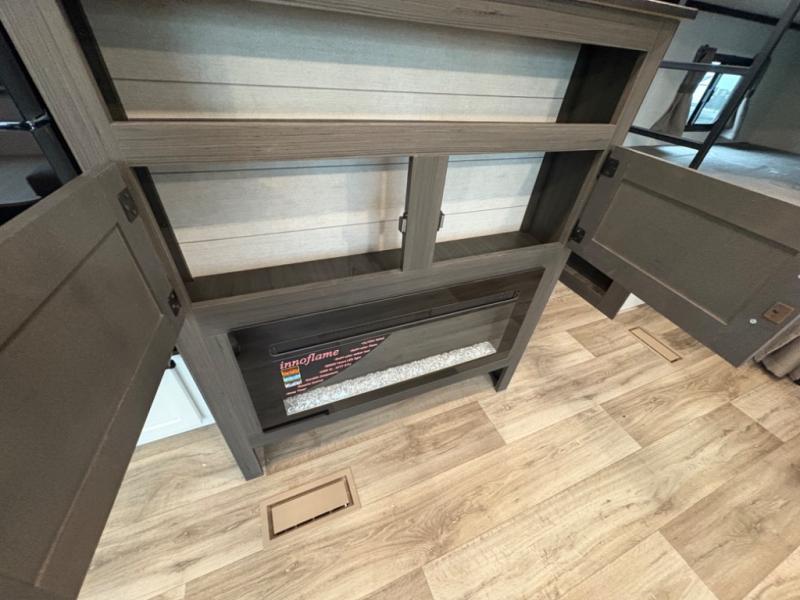 The whole family will have a fun time camping in this travel trailer! You will appreciate having your own space with the front private bedroom that has a sleep tight queen bed to lay your head on at night, and wardrobes on either side to hang your clothes. The kids can sleep on the set of 51" x 75" double bed bunks and can even invite a friend or two to tag along and sleep on either the 70" sofa or the 42" booth dinette once they are converted. Everyone can freshen up in the rear corner bathroom featuring a 30" x 36" shower. Behind the entertainment center is a walk-in pantry with coat hooks so you can store your jacket and groceries. The chef will enjoy cooking at the outside campfire café on the griddle, plus there is a refrigerator, and a sink for cleaning up!