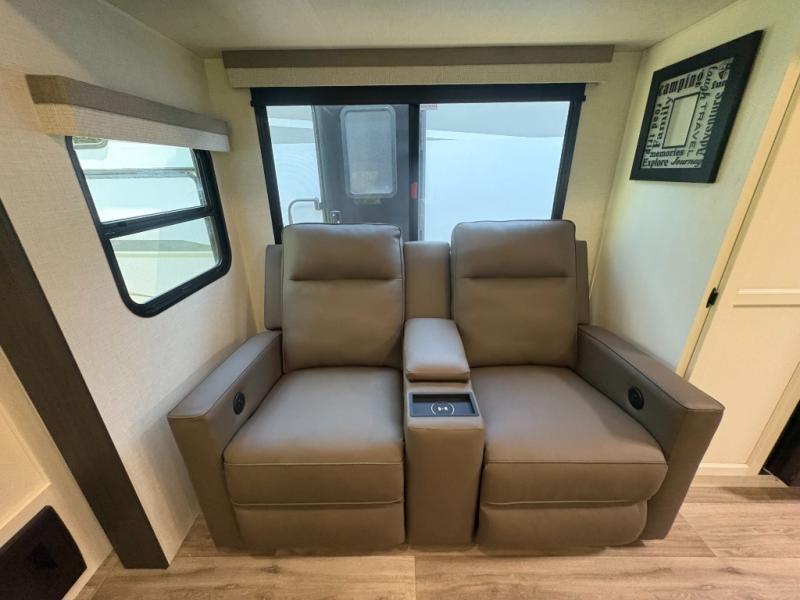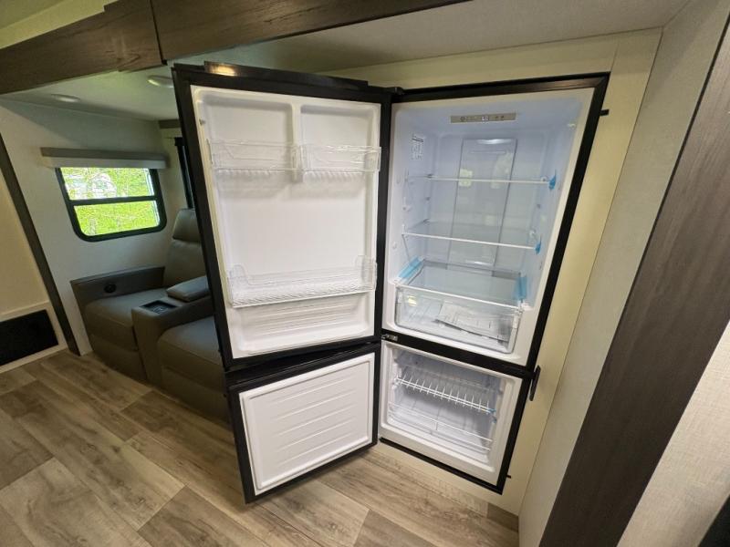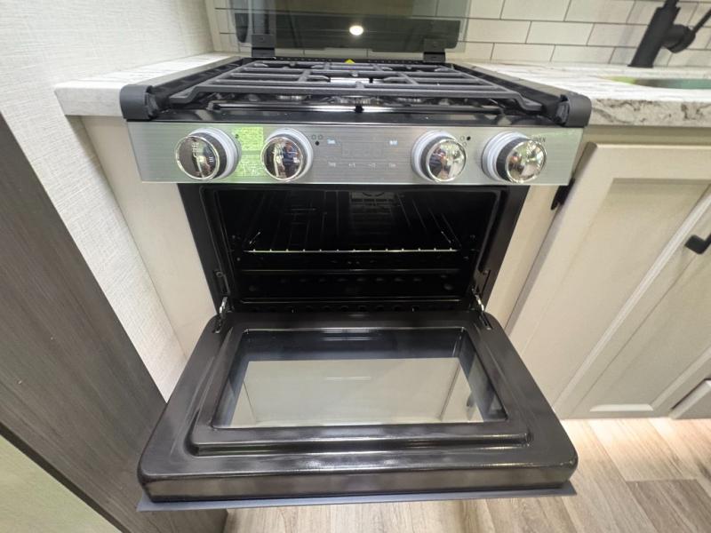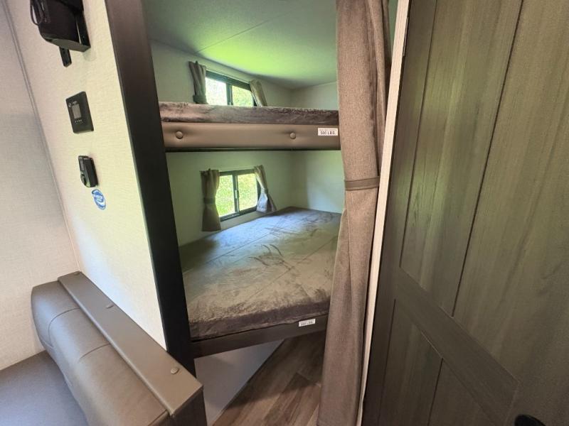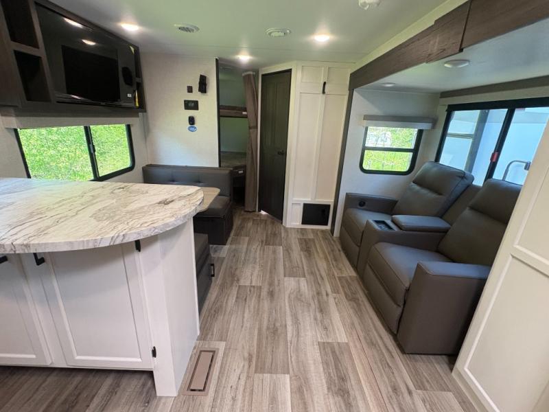 Sleep tight with your family on the road! This travel trailer is special for the whole family since it has plenty of space for sleep. First we have the 60" x 80" queen bed, the 51" x 75" double size bunk bed, you can also two people on the sit n' slide dinette and one more on the 70" sofa. Cook delicious dinner in the incredible kitchen. It includes stainless steel sink with cover and dish drying racks, three cooktop burner, 10 cu. refrigerator, pantry and an over head cabinet. However you can also have an amazing cooking time outside thanks to the outdoor kitchen, ideal ideal to share a meal with your family while enjoying nature and its surroundings. Store your belongings in the large closet beside the bed and also in the pass thru storage. Finally, take a relaxing bath in the full bathroom furnished with a 30" x 36" shower.