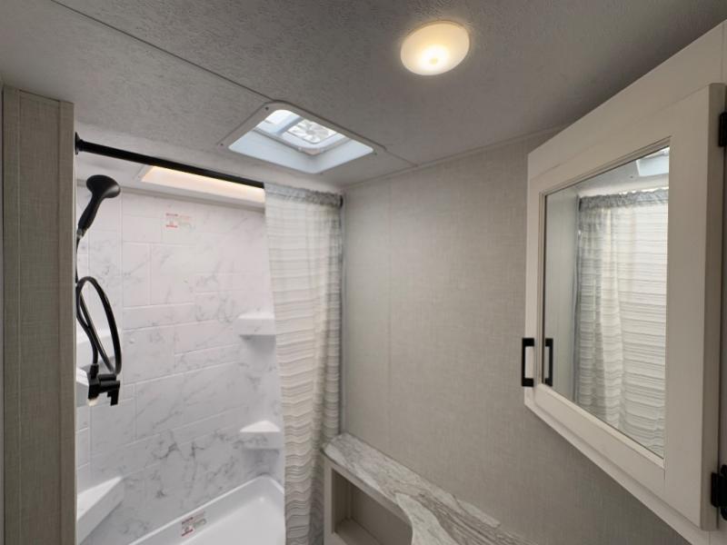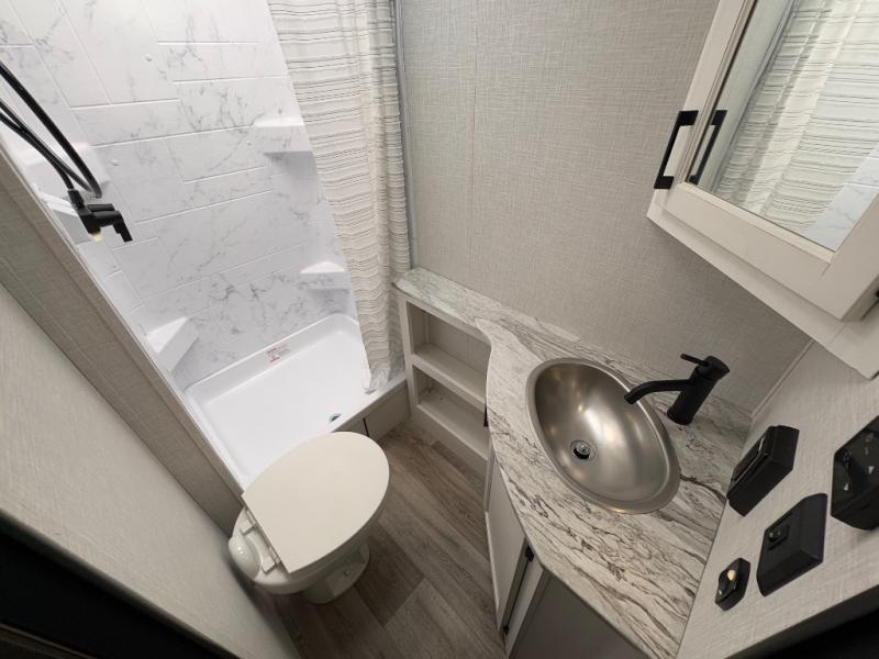 - Full bathroom with 30" x 36" shower, vanity, and storage