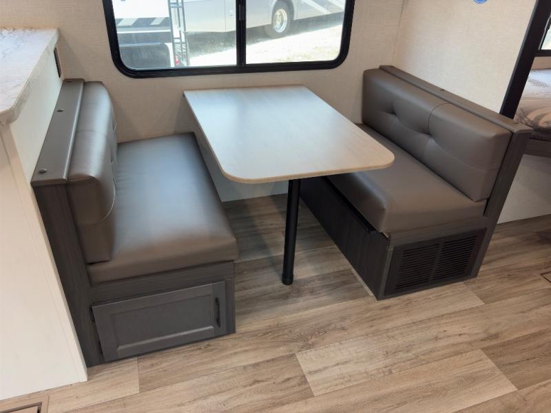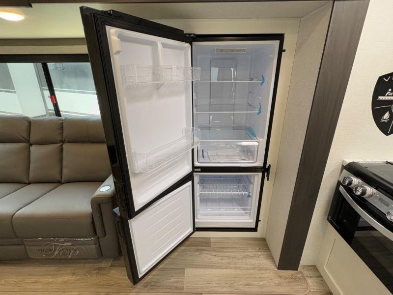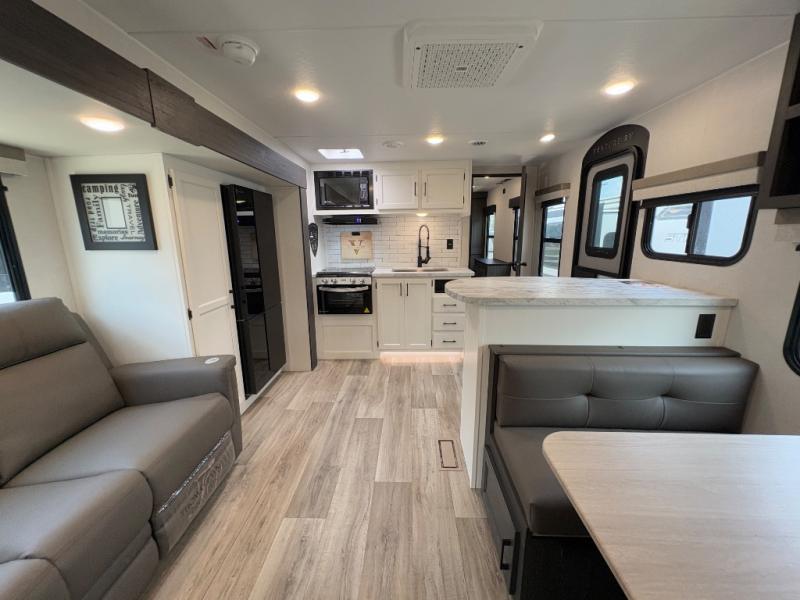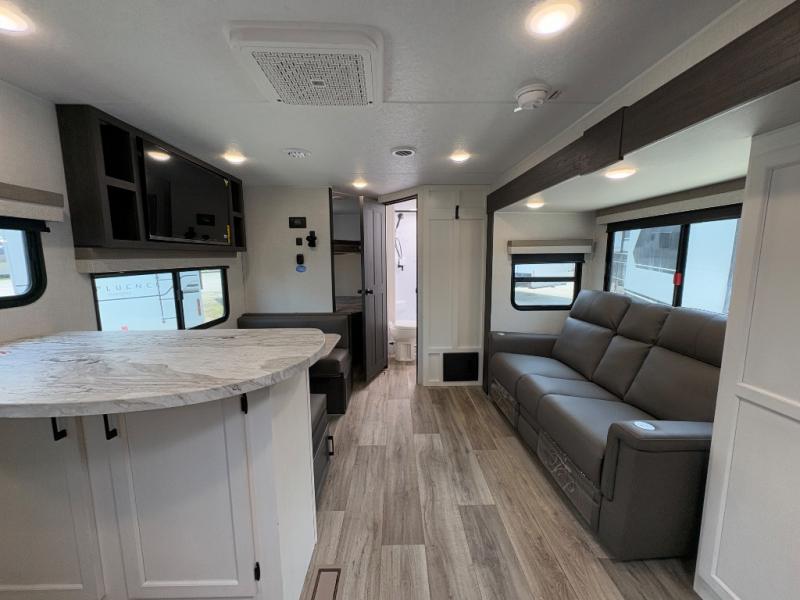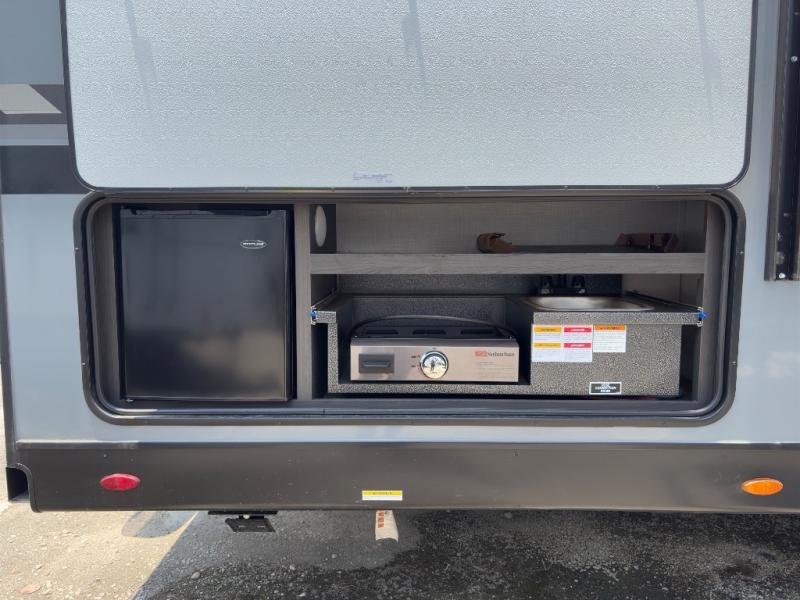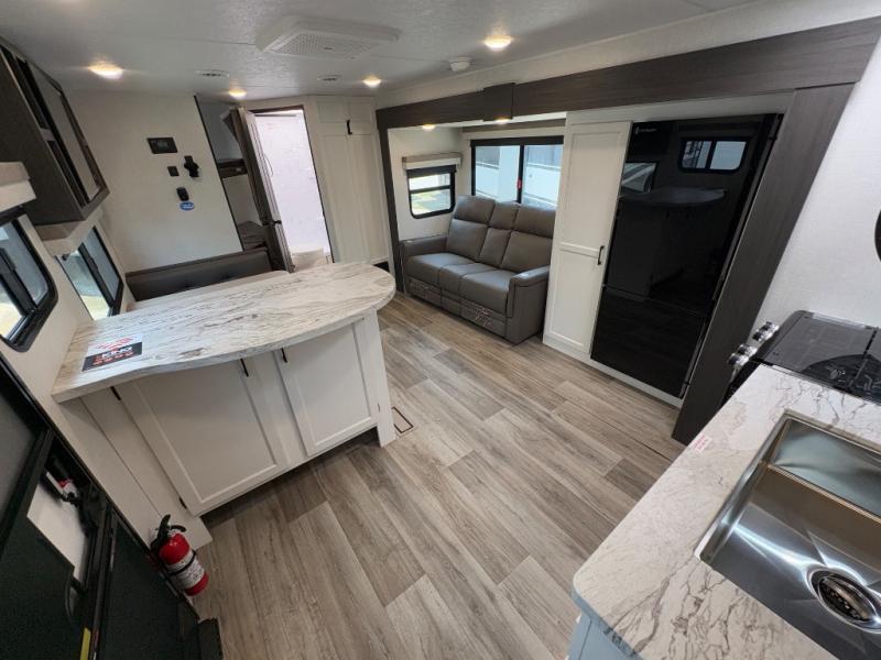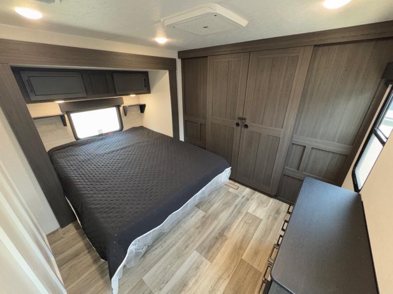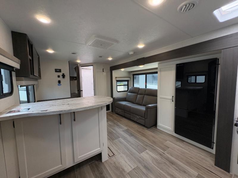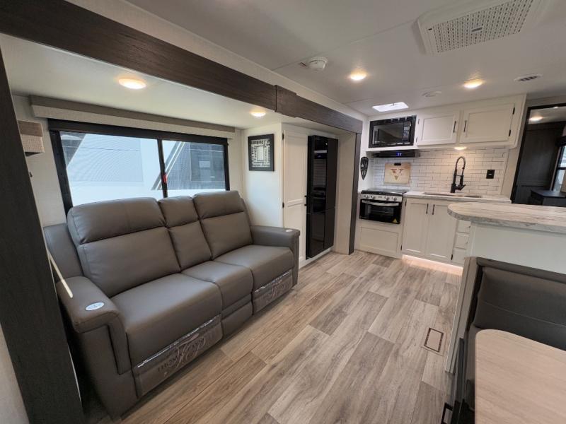 The Venture RV Stratus SR302VBH is designed with families in mind, offering space to sleep up to nine, a residential queen bed, and modern kitchen conveniences. With durable construction, innovative technology, and an outdoor kitchen for family cookouts, it’s the perfect choice for memorable adventures.