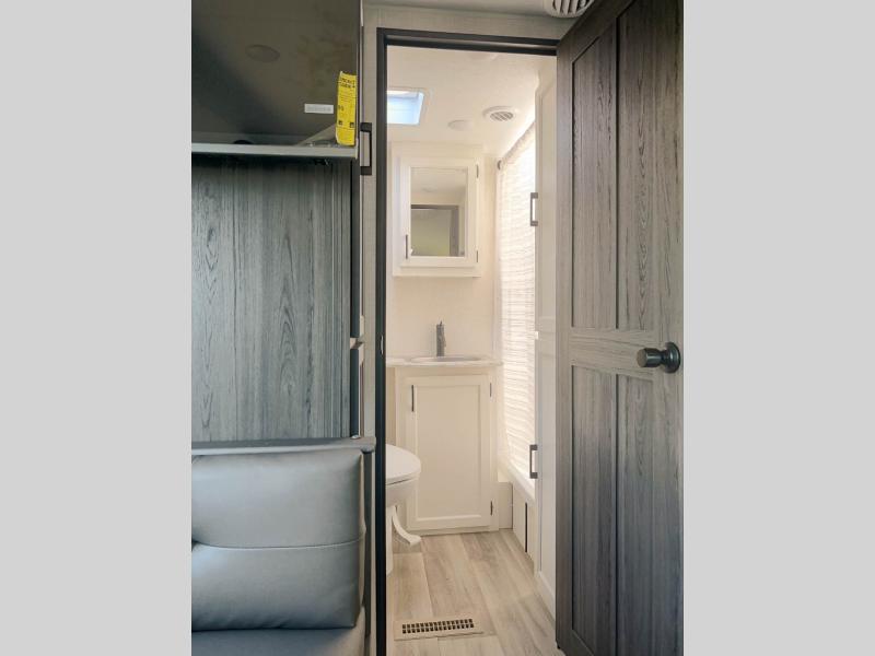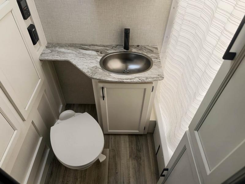 Enjoy camping in this cozy couples coach featuring a front sleep tight queen bed with shelves and overhead cabinets to keep your clothing and personal items neatly tucked away. You will have the versatility of cooking either inside or out thanks to the outdoor Campfire Cafe with pull-out griddle, and inside you will find all the necessities to easy cook indoors. There is a 10 cu. ft. 12 volt refrigerator, a three burner cooktop, and pantry for your dry goods. Enjoy your meals at the sit n' slide dinette. You will appreciate the rear bath for added convenience. No late night trips in the dark to the campground facilities, and the 30" x 36" shower will allow you to stay clean and refreshed for as long as you are away from home.