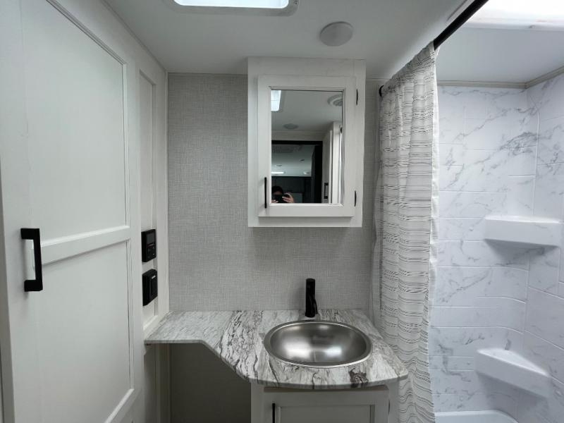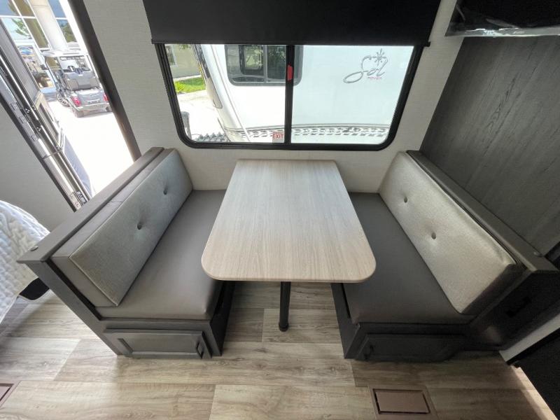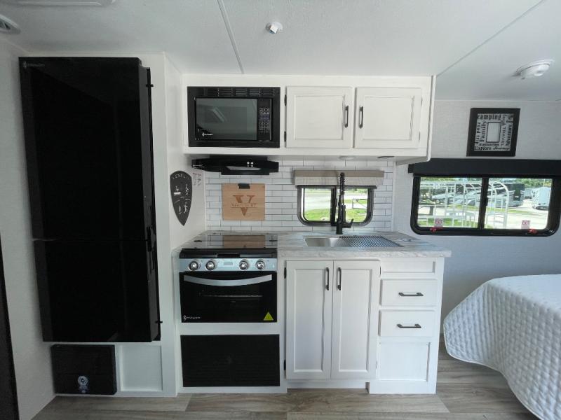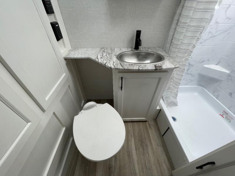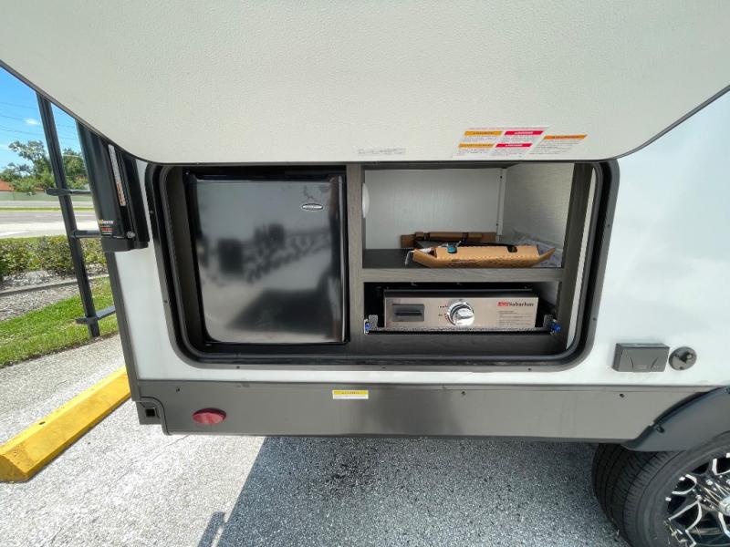 Enjoy camping in this cozy couples coach featuring a front sleep tight queen bed with shelves and overhead cabinets to keep your clothing and personal items neatly tucked away. You will have the versatility of cooking either inside or out thanks to the outdoor Campfire Cafe with pull-out griddle, and inside you will find all the necessities to easy cook indoors. There is a 10 cu. ft. 12 volt refrigerator, a three burner cooktop, and pantry for your dry goods. Enjoy your meals at the sit n' slide dinette. You will appreciate the rear bath for added convenience. No late night trips in the dark to the campground facilities, and the 30" x 36" shower will allow you to stay clean and refreshed for as long as you are away from home.
