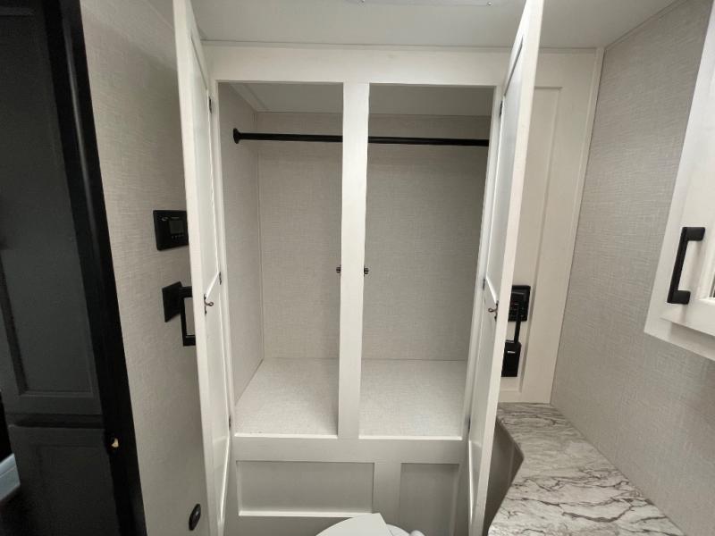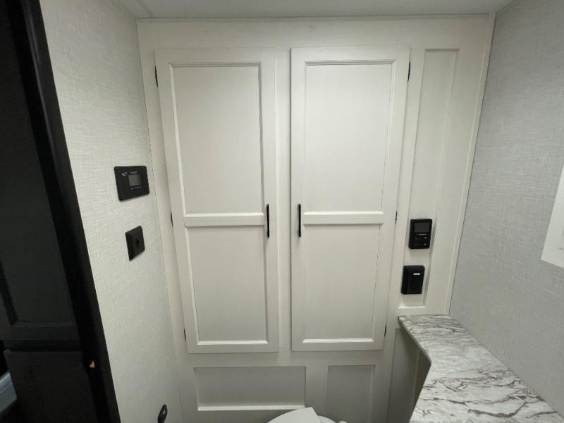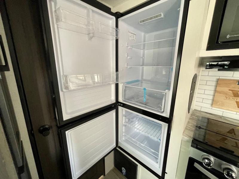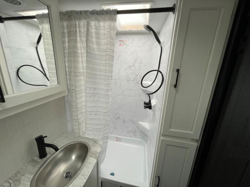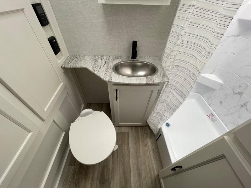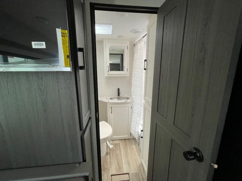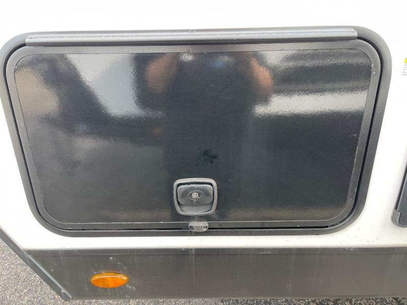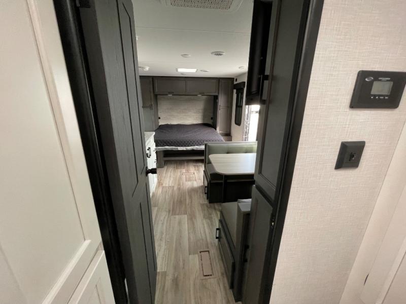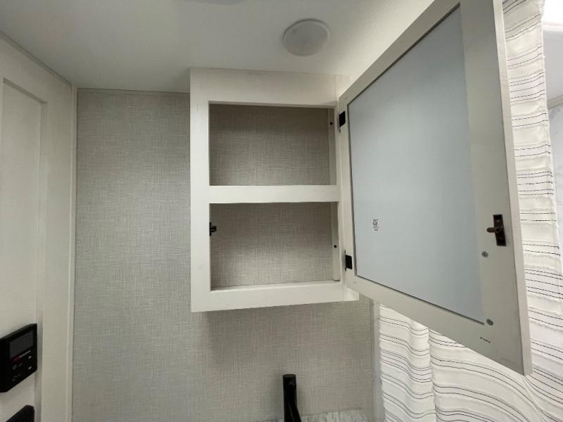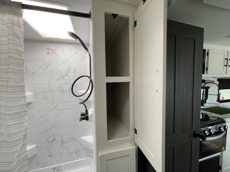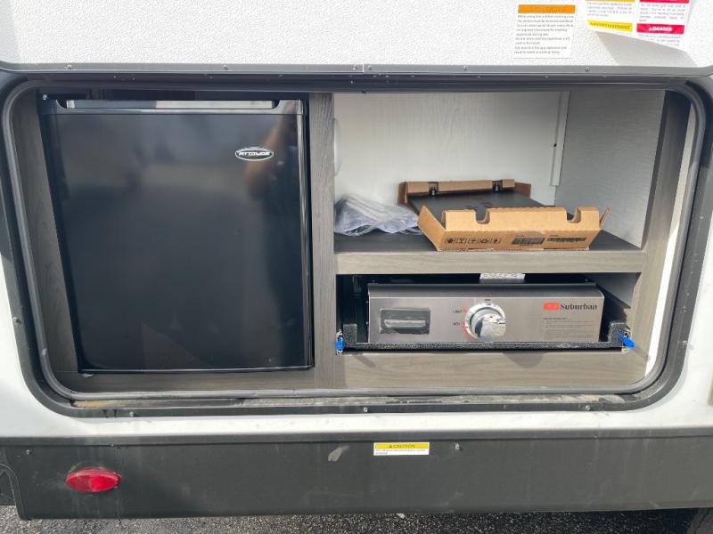 Enjoy camping in this cozy couples coach featuring a front sleep tight queen bed with shelves and overhead cabinets to keep your clothing and personal items neatly tucked away. You will have the versatility of cooking either inside or out thanks to the outdoor Campfire Cafe with pull-out griddle, and inside you will find all the necessities to easy cook indoors. There is a 10 cu. ft. 12 volt refrigerator, a three burner cooktop, and pantry for your dry goods. Enjoy your meals at the sit n' slide dinette. You will appreciate the rear bath for added convenience. No late night trips in the dark to the campground facilities, and the 30" x 36" shower will allow you to stay clean and refreshed for as long as you are away from home.