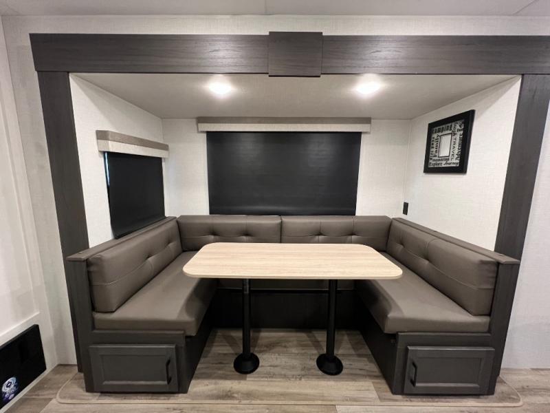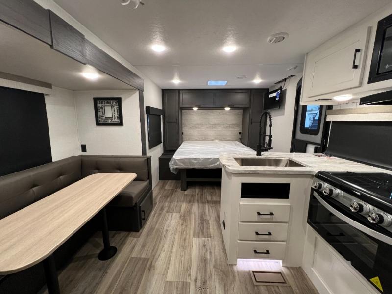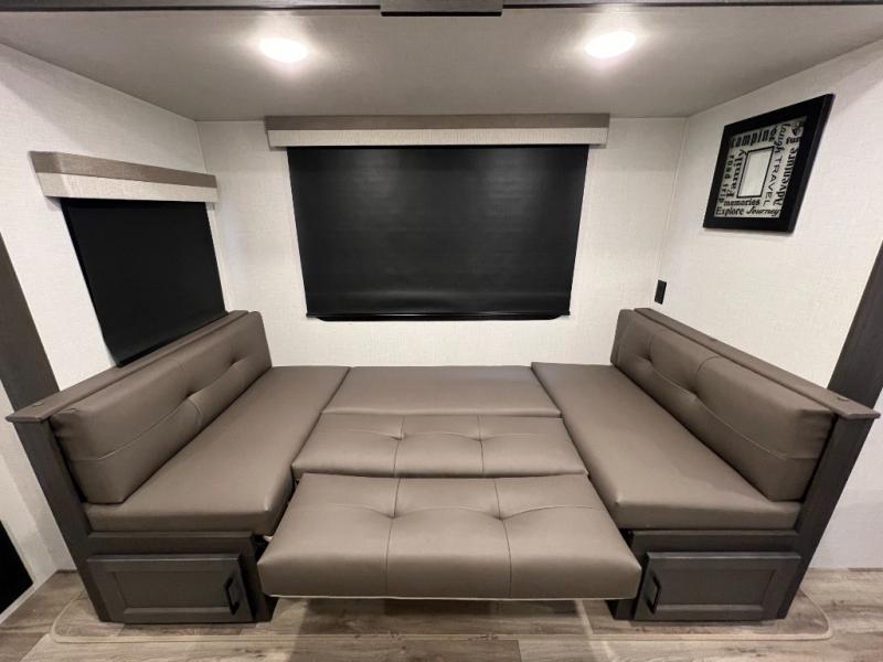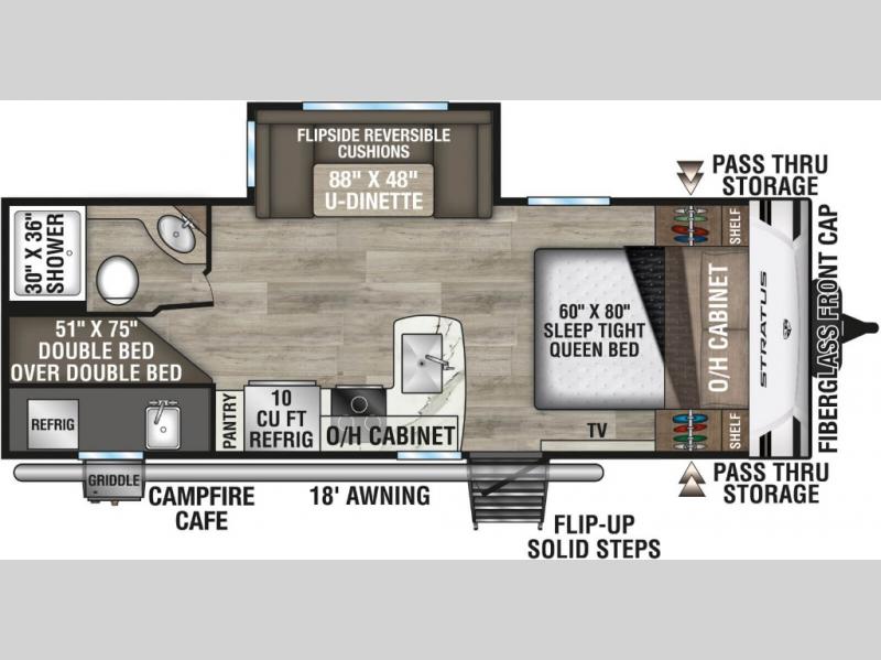 Sleep tight with your family on the road! This travel trailer is special for the whole family since it has plenty of space for sleep. First we have the 60" x 80" queen bed, the 51" x 75" double size bunk bed, and you can also sleep two people on the 88" x 48" U shaped dinette. Cook delicious dinner in the incredible kitchen. The L-shape counter includes stainless steel sink with cover and dish drying racks, three cooktop burner, refrigerator, pantry and an overhead cabinet. However, you can also have an amazing cooking time outside thanks to the outdoor kitchen, ideal to share a meal with your family while enjoying nature and its surroundings. Store your belongings in the dual wardrobes beside the bed and also in the pass thru storage. Finally, take a relaxing bath in the full bathroom furnished with a 30" x 36" shower.