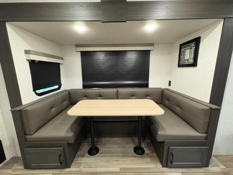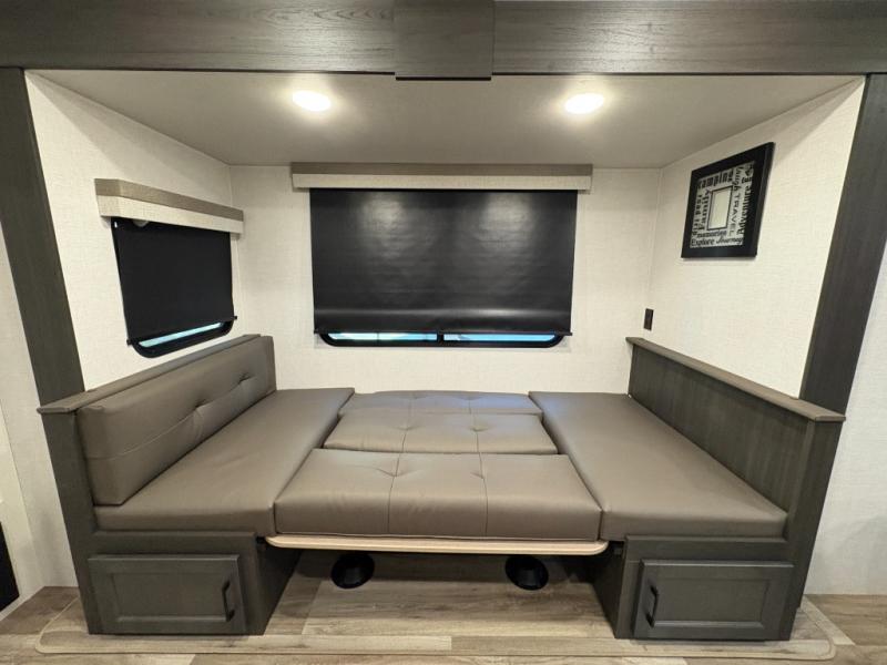 Sleep tight with your family on the road! This travel trailer is special for the whole family since it has plenty of space for sleep. First we have the 60" x 80" queen bed, the 51" x 75" double size bunk bed, and you can also sleep two people on the 88" x 48" U shaped dinette. Cook delicious dinner in the incredible kitchen. The L-shape counter includes stainless steel sink with cover and dish drying racks, three cooktop burner, refrigerator, pantry and an overhead cabinet. However, you can also have an amazing cooking time outside thanks to the outdoor kitchen, ideal to share a meal with your family while enjoying nature and its surroundings. Store your belongings in the dual wardrobes beside the bed and also in the pass thru storage. Finally, take a relaxing bath in the full bathroom furnished with a 30" x 36" shower.