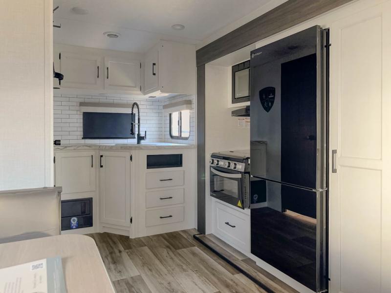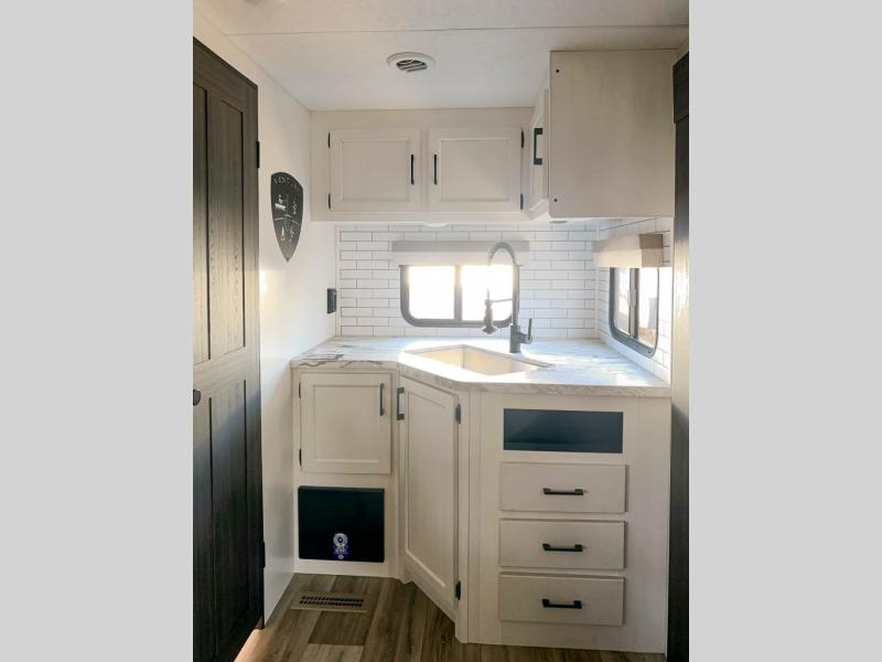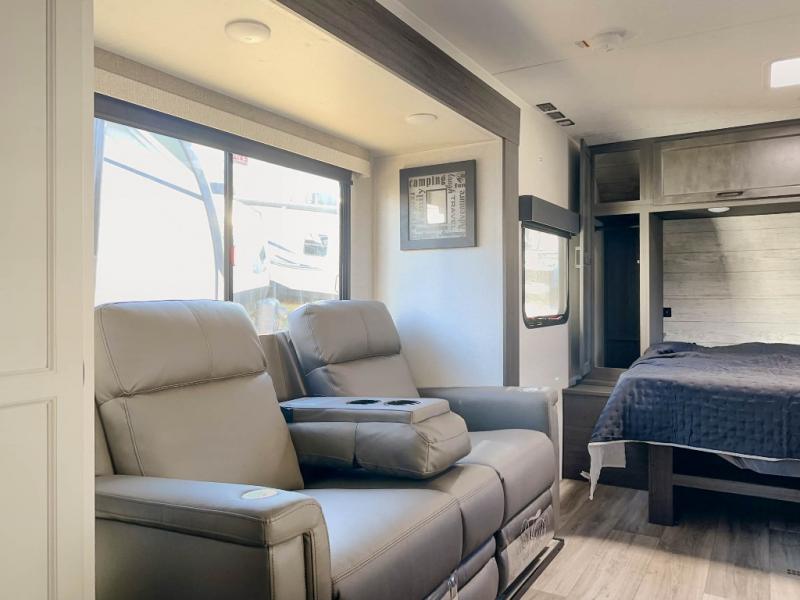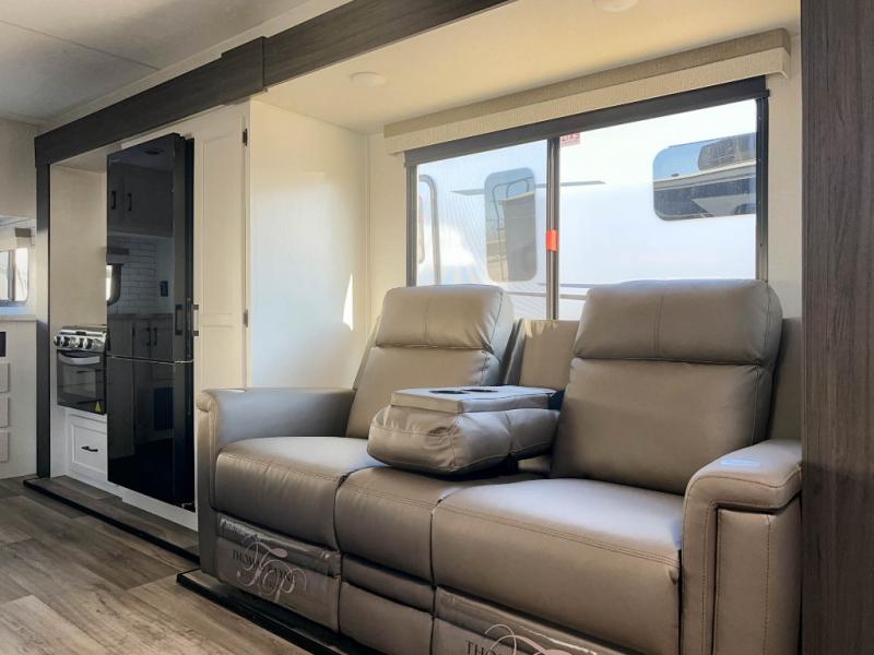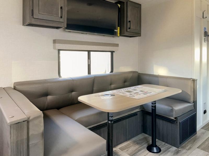 You and your spouse will have a good time at the campground in this travel trailer! The front sleep tight queen bed has shelves and overhead cabinets to keep your items close by but out of the way. Grab some eggs from the 10 cu. ft. refrigerator to fry them up on the three burner cooktop then enjoy them at the 88" x 42" U-shaped dinette which has an entertainment center above it. After a fun, long day at the beach you can freshen up in the rear corner bathroom in the 30" x 36" shower then relax on the theater seating with USB ports and cupholders!