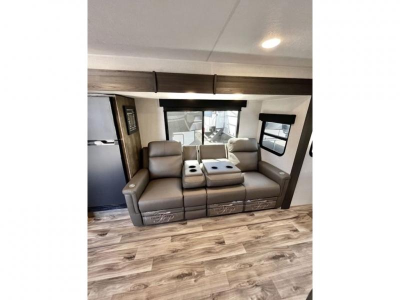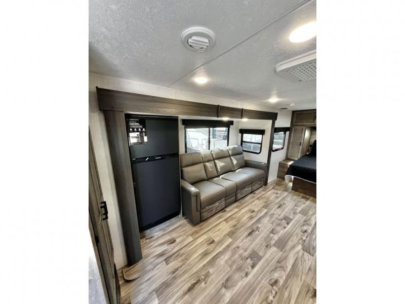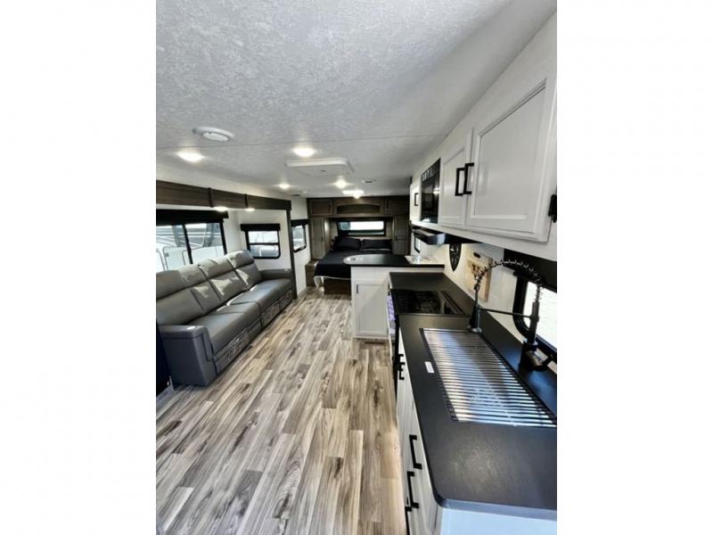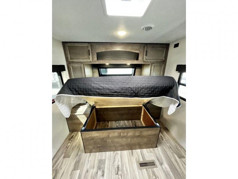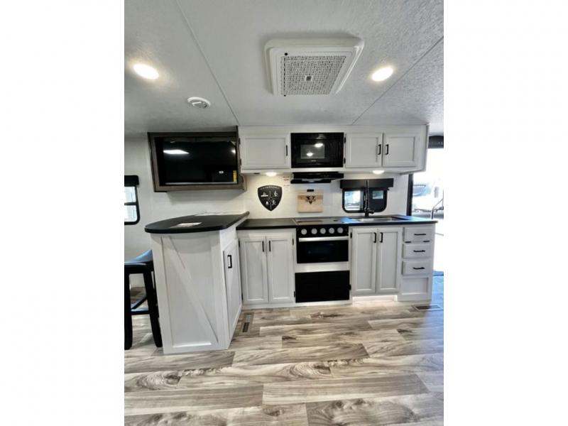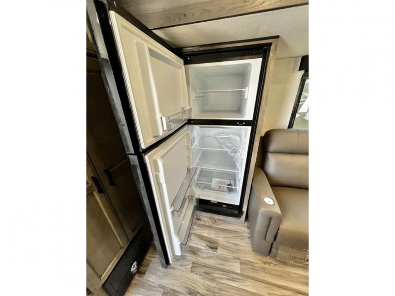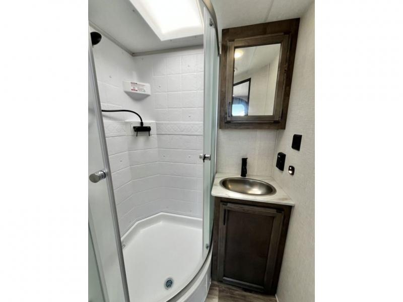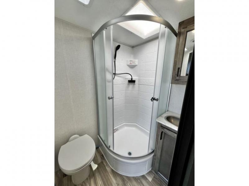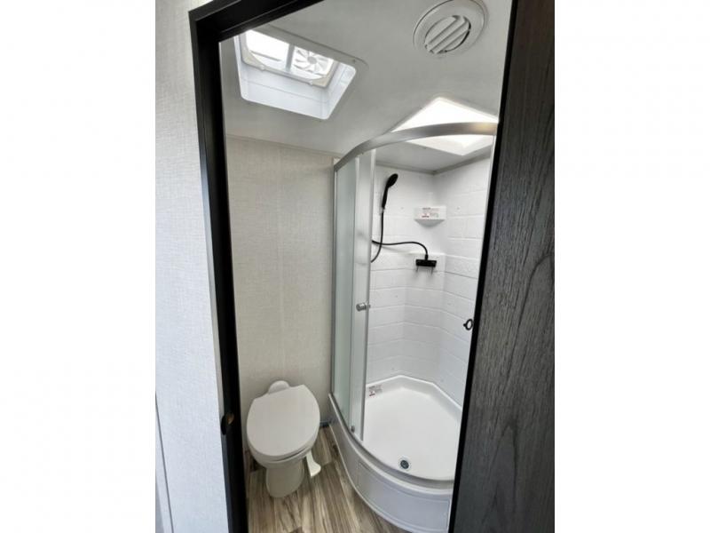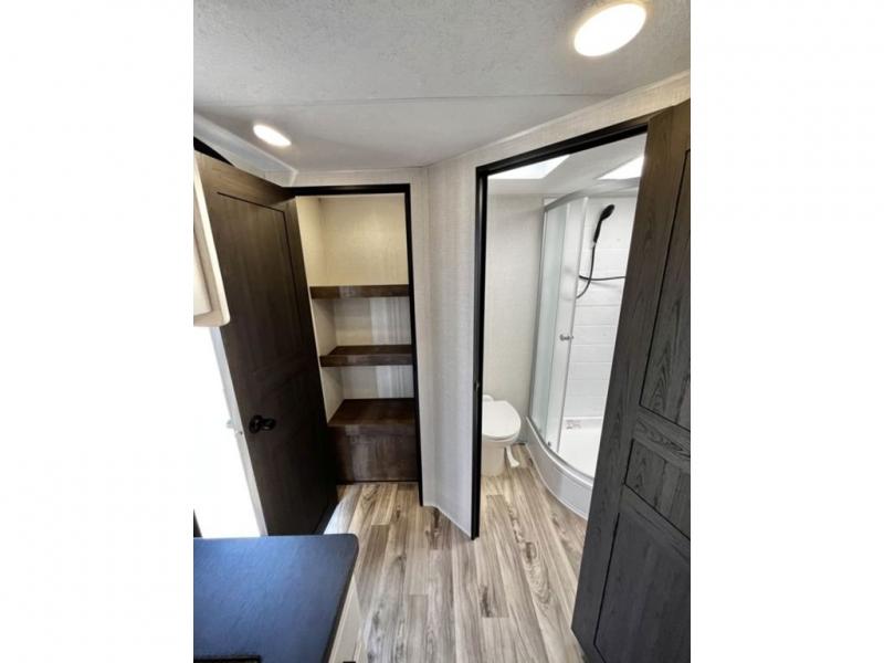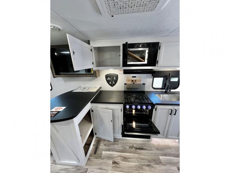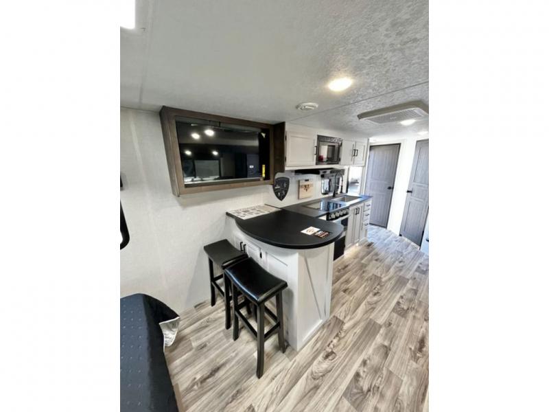 This travel trailer is perfect for two people who wish to escape the hustle and bustle of everyday life! You will enjoy a good night's rest on the sleep tight queen bed with shelves and wardrobes on either side to hang your clothes, and if you want an extra guest or two to tag along then you can transform the 88" x 42" U-shaped dinette into an extra sleeping space. Everyone will stay clean and refreshed with a rear corner bathroom that has a 34" radius shower. Grab your dry goods from the walk-in pantry, your perishables from the 10 cu. ft. refrigerator, and cook them all on the three burner cooktop. The bar top with two bar stools is the perfect place to enjoy your morning coffee and eggs!